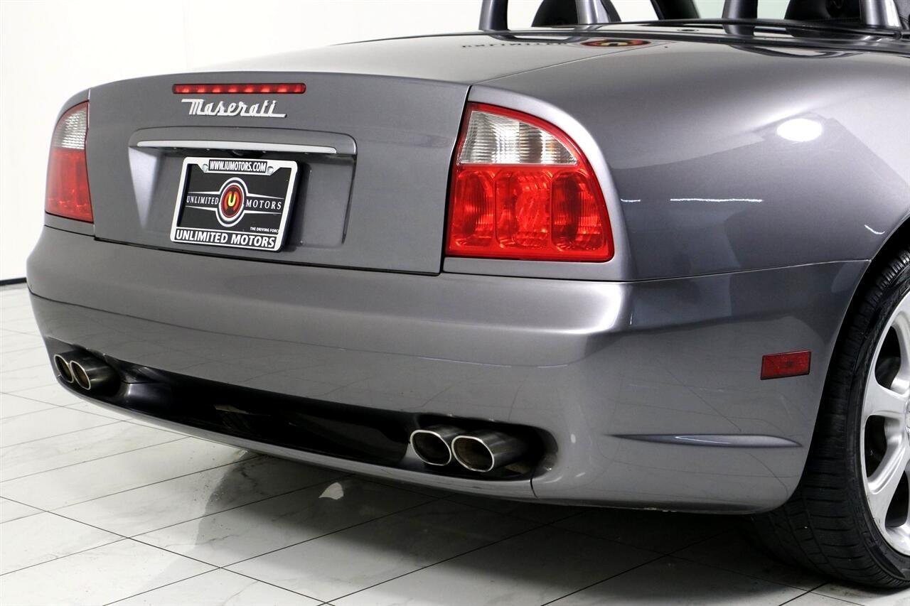 Clean Carfax, Low Miles, Spyder Cambiocorsa, 2D Convertible, 4.2L V8 DOHC, 6-Speed Manual with Cambiocorsa Automatic-Shifting, RWD, Silver, Nero Leather.2004 Silver Maserati 2D Convertible Spyder Cambiocorsa RWD 6-Speed Manual with Cambiocorsa Automatic-Shifting 4.2L V8 DOHCVisit our website www.iumotors.com to view 100s of newer vehicles, more pictures and info, or to apply for financing. Rates are incredibly low for approved credit. We offer extended warranties, protection packages, and insurance. We assure you the best experience at any of our 4 locations and unbeatable prices and quality. At Unlimited Motors we believe in MARKET VALUE PRICING. We use real-time Internet price comparisons to constantly adjust prices to provide ALL BUYERS The BEST PRICE possible. We do not mark them up, to mark them down! Our entire team is committed to helping you buy a car the way we would want to buy a car! We utilize state-of-the-art technology to constantly monitor pricing trends to offer our shoppers the best competitive pricing, value, and experience. We sell and service all makes and models of Pre-owned / Used Vehicles Used Cars, Used Trucks, Used Sport Utility, Lamborghini, Ferrari, Bentley, Rolls Royce, McLaren, Maserati, Ford, Chevrolet/Chevy, Honda, Toyota, Porsche, Land Rover, Jaguar, INFINITI, Audi, Nissan, Mazda, Hyundai, Chrysler, Jeep, Dodge, Ram, SRT, Mitsubishi, Lexus, Kia, Volkswagen, Mini, BMW, Mercedes, Fiat, Volvo, GMC, Cadillac, Lincoln as well as other brands. Proudly serving these areas of Indianapolis, Fishers, Carmel, Noblesville, Greenwood, Avon, Plainfield, Zionsville, & Brownsburg, Indiana, Midwest. We also serve the entire nation with our seamless and easy online purchasing process, and offer shipping nationwide.Advertised prices DO NOT include Sales Tax, Dealer Fees, Title Processing Charges, and Dealer Pre-installed Products.