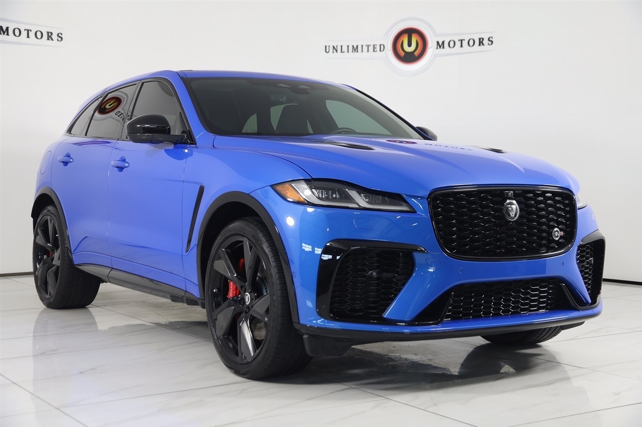 2024 Jaguar F-PACE Ultra Blue Metallic Now Available at Unlimited Motors Westfield! With over 20 years in business and 4 Indiana locations, Unlimited Motors is known for offering high-quality, hand-selected vehicles at excellent pricing with outstanding customer service. Our inventory of over 1,000 vehicles includes major makes such as Ford, Chevrolet, Ram, Jeep, GMC, Dodge, BMW, Mercedes-Benz, Audi, Cadillac, Porsche, Maserati, Ferrari, and Lamborghini, giving customers one of the largest selections of quality vehicles in the Midwest. Vehicle Highlights:Navigation, Back Up Camera, Bluetooth, Panoramic Roof, Heated Seats, Touch Screen, Heated Steering Wheel, Blind Spot, Vented Seats, Cooled Heats, Apple Play, F-PACE SVR, 4D Sport Utility, 5.0L V8 Supercharged, 8-Speed Automatic, AWD, Ultra Blue Metallic, Ebony/Ebony/Mars Red Leather, Navigation System, Navigation system: Pivi Pro (Connected Navigation).CARFAX One-Owner. Clean CARFAX. Priced below KBB Fair Purchase Price!Visit www.iumotors.com to explore our full inventory of over 1,000 hand-picked vehicles across our Westfield, Fishers, Noblesville, and Elwood locations. At Unlimited Motors, we offer a premium car-buying experience with competitive financing through local credit unions and national lenders, top trade-in values, full auto repair and maintenance services for customer vehicles, and nationwide shipping to all 50 states. Youll also find many of the most searched and in-demand models, including Ford F-150, Chevrolet Silverado, Ram 1500, Jeep Wrangler, Jeep Grand Cherokee, Chevrolet Tahoe, Chevrolet Suburban, GMC Yukon, GMC Sierra, Dodge Charger, Dodge Durango, Ford Explorer, BMW X5, BMW X3, BMW 3 Series, Mercedes-Benz GLE, Mercedes-Benz GLC, Cadillac Escalade, Audi Q5, Audi Q7, Porsche Cayenne, Porsche Macan, Maserati Ghibli, and more. Whether youre visiting from Westfield, Indianapolis, Carmel, Fishers, Noblesville, Zionsville, Greenwood, Lawrence, Brownsburg, Avon, Plainfield, Lebanon, Anderson, Muncie, Kokomo, Lafayette, Bloomington, Columbus, or anywhere across Central and Northern Indiana, we are here to help you find the perfect vehicle with exceptional service and unbeatable value. Call us today at 317-896-4488 1470 W Tournament Trl, Westfield, IN 46074. Disclaimer: Advertised prices DO NOT include Sales Tax, Dealer Fees, Title Processing Charges, and Dealer Pre-installed Products.