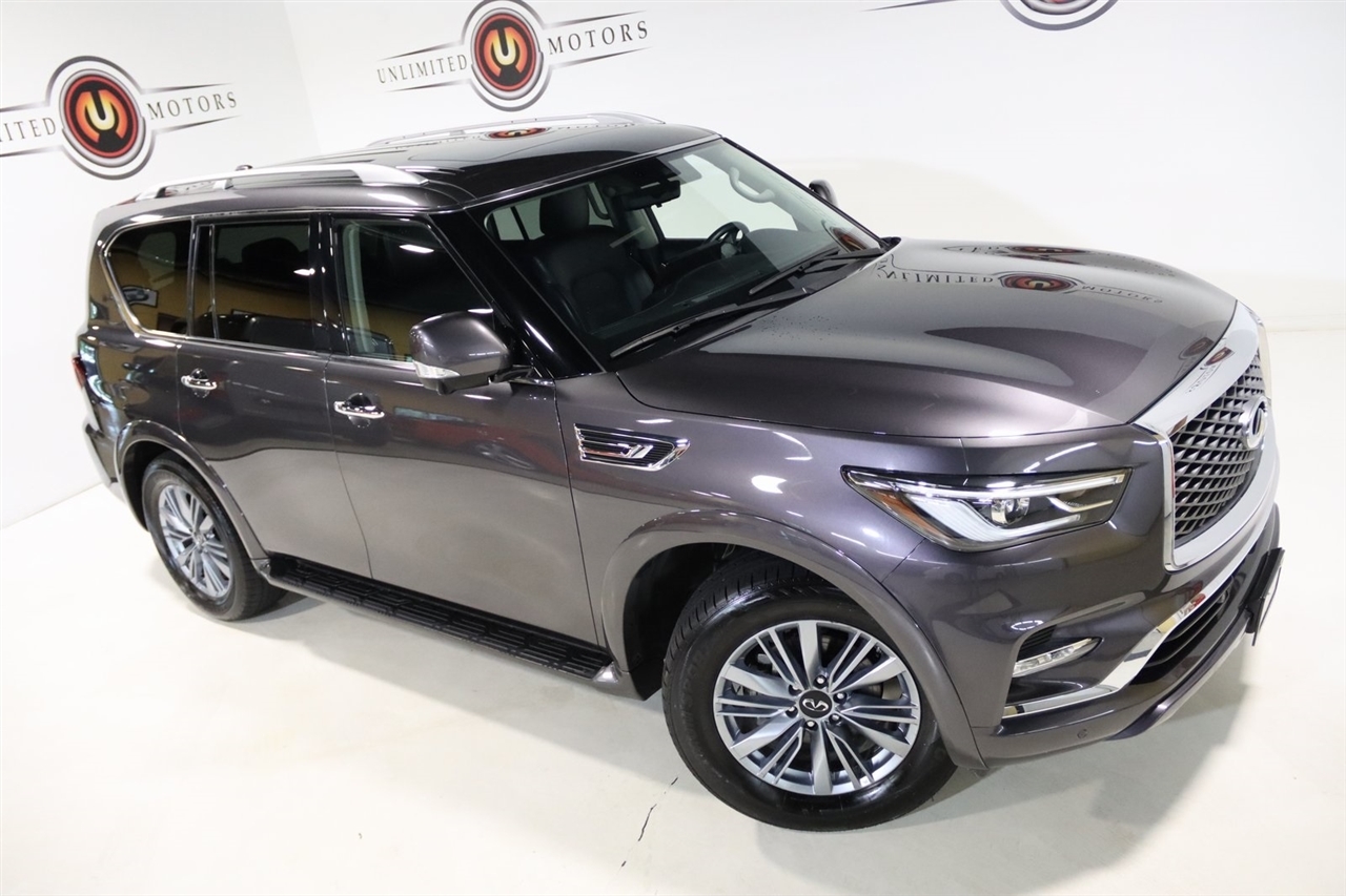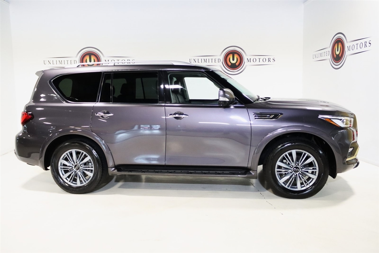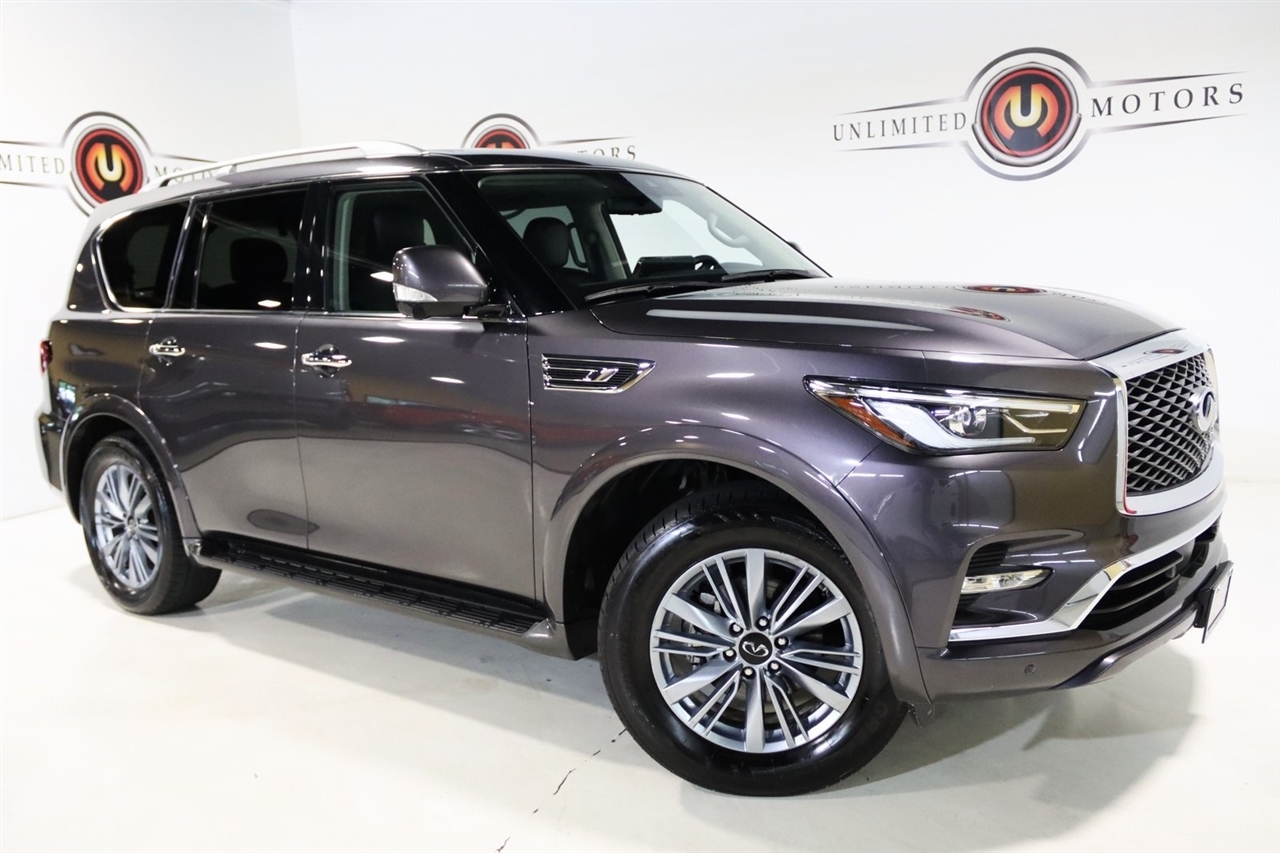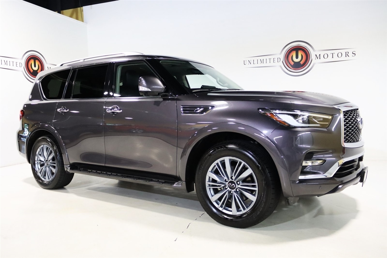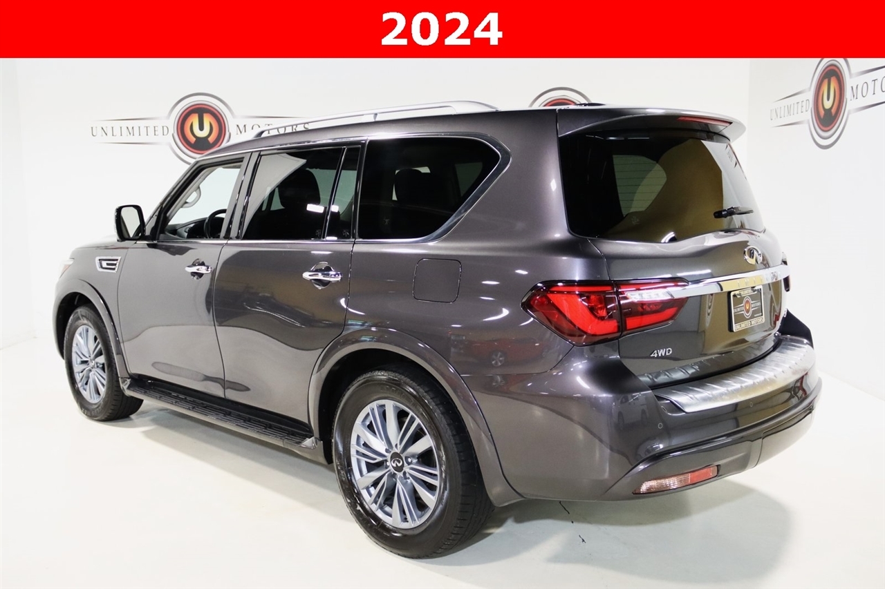 Navigation, Bluetooth, Back Up Camera, Sun/Moon Roof, 3rd Row, Heated Seats, Touch Screen, 13 Speakers, 2.937 Axle Ratio, 20 Aluminum Alloy Wheels, 3rd row seats: bench, 4-Wheel Disc Brakes, ABS brakes, Air Conditioning, Alloy wheels, AM/FM radio: SiriusXM, Anti-whiplash front head restraints, Apple CarPlay/Android Auto, Auto High-beam Headlights, Auto tilt-away steering wheel, Auto-dimming door mirrors, Auto-dimming Rear-View mirror, Auto-leveling suspension, Automatic temperature control, Brake assist, Bumpers: body-color, Compass, Delay-off headlights, Driver door bin, Driver vanity mirror, Dual front impact airbags, Dual front side impact airbags, Electronic Stability Control, Emergency communication system: INFINITI InTouch, Four wheel independent suspension, Front anti-roll bar, Front Bucket Seats, Front Center Armrest, Front dual zone A/C, Front fog lights, Front reading lights, Fully automatic headlights, Garage door transmitter: HomeLink, Heated door mirrors, Heated Front Bucket Seats, Heated front seats, Heated steering wheel, Illuminated entry, Leather Shift Knob, Leather steering wheel, Leather-Appointed Seats, Low tire pressure warning, Memory seat, Navigation System, Navigation system: INFINITI InTouch Navigation, Occupant sensing airbag, Outside temperature display, Overhead airbag, Overhead console, Panic alarm, Passenger door bin, Passenger vanity mirror, Power door mirrors, Power driver seat, Power Liftgate, Power moonroof, Power passenger seat, Power steering, Power windows, Radio data system, Radio: Bose Premium Audio System w/13 Speakers, Rain sensing wipers, Rear air conditioning, Rear anti-roll bar, Rear reading lights, Rear seat center armrest, Rear window defroster, Rear window wiper, Reclining 3rd row seat, Remote keyless entry, Security system, Speed control, Speed-sensing steering, Split folding rear seat, Spoiler, Steering wheel memory, Steering wheel mounted audio controls, Tachometer, Telescoping steering wheel, Tilt steering wheel, Traction control, Trip computer, Turn signal indicator mirrors, Variably intermittent wipers, Voltmeter. CARFAX One-Owner. Odometer is 14239 miles below market average! Priced below KBB Fair Purchase Price!2024 Anthracite Gray INFINITI 4D Sport Utility QX80 LUXE 4WD 7-Speed Automatic 5.6L V8Visit our website www.iumotors.com to view 100s of newer vehicles, more pictures and info, or to apply for financing. Rates are incredibly low for approved credit. We offer extended warranties, protection packages, and insurance. We assure you the best experience at any of our 4 locations and unbeatable prices and quality. At Unlimited Motors we believe in MARKET VALUE PRICING. We use real-time Internet price comparisons to constantly adjust prices to provide ALL BUYERS The BEST PRICE possible. We do not mark them up, to mark them down! Our entire team is committed to helping you buy a car the way we would want to buy a car! We utilize state-of-the-art technology to constantly monitor pricing trends to offer our shoppers the best competitive pricing, value, and experience. We sell and service all makes and models of Pre-owned / Used Vehicles Used Cars, Used Trucks, Used Sport Utility, Lamborghini, Ferrari, Bentley, Rolls Royce, McLaren, Maserati, Ford, Chevrolet/Chevy, Honda, Toyota, Porsche, Land Rover, Jaguar, INFINITI, Audi, Nissan, Mazda, Hyundai, Chrysler, Jeep, Dodge, Ram, SRT, Mitsubishi, Lexus, Kia, Volkswagen, Mini, BMW, Mercedes, Fiat, Volvo, GMC, Cadillac, Lincoln as well as other brands. Proudly serving these areas of Indianapolis, Fishers, Carmel, Noblesville, Greenwood, Avon, Plainfield, Zionsville, & Brownsburg, Indiana, Midwest. We also serve the entire nation with our seamless and easy online purchasing process, and offer shipping nationwide.Advertised prices DO NOT include Sales Tax, Dealer Fees, Title Processing Charges, and Dealer Pre-installed Products.