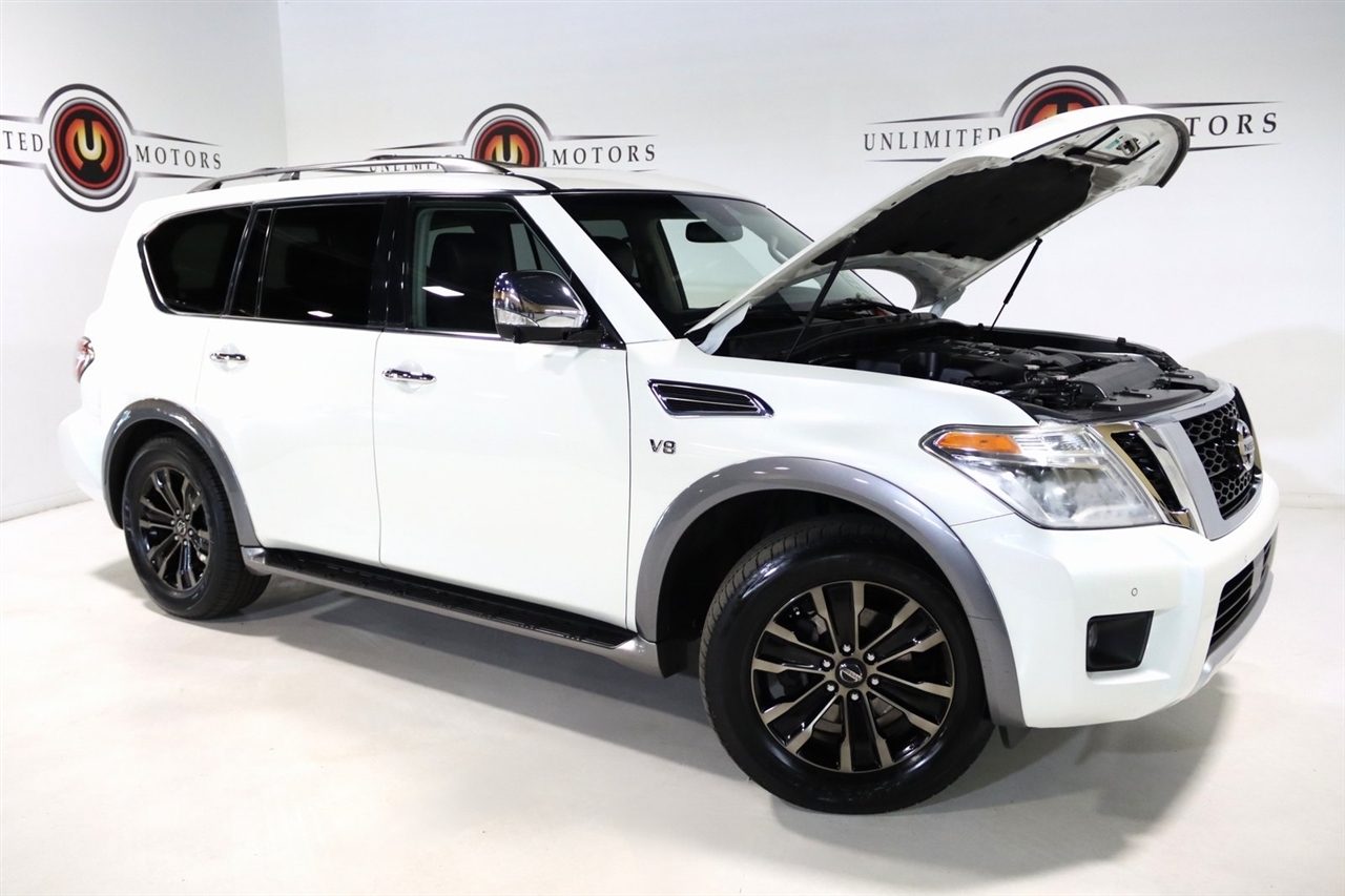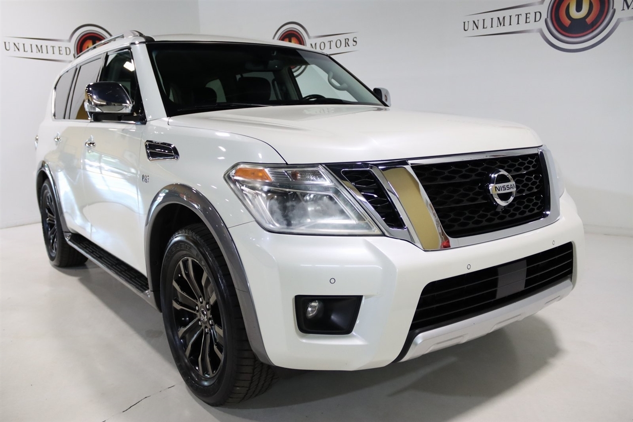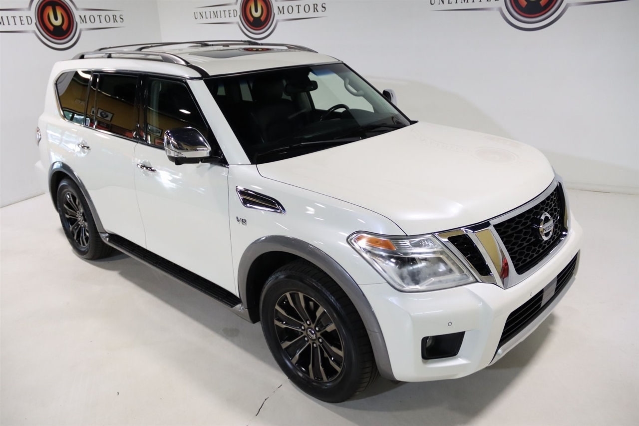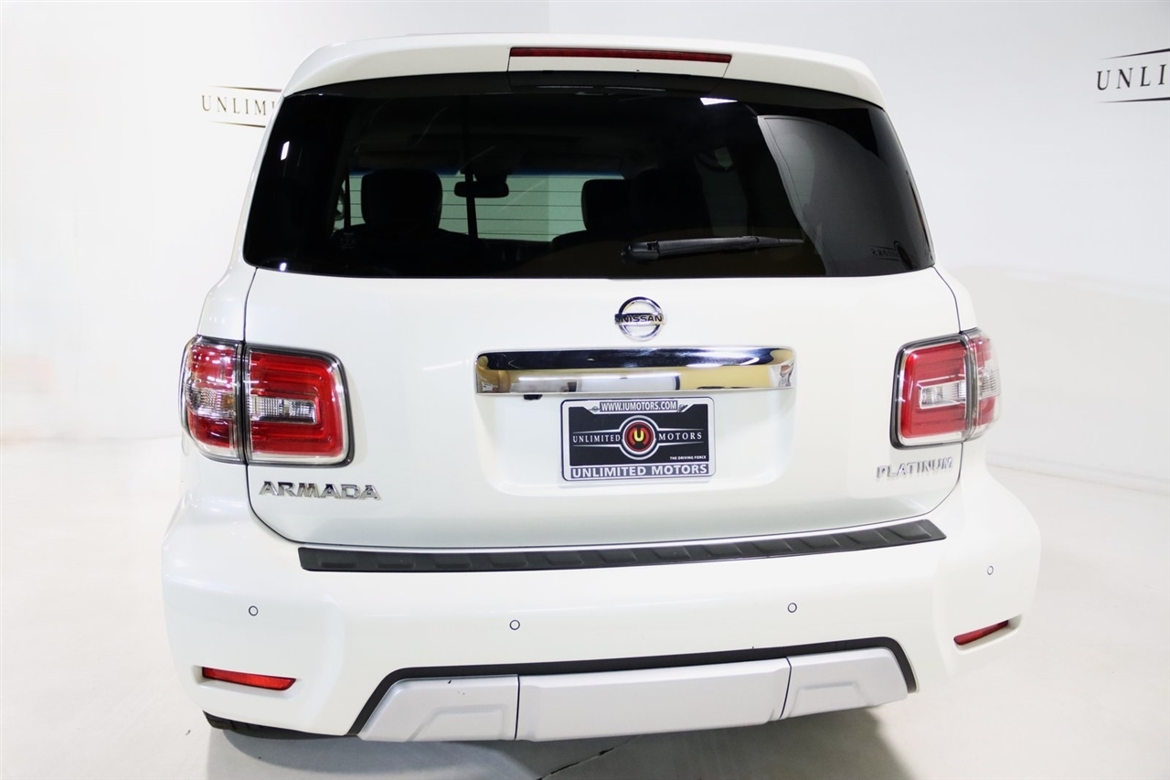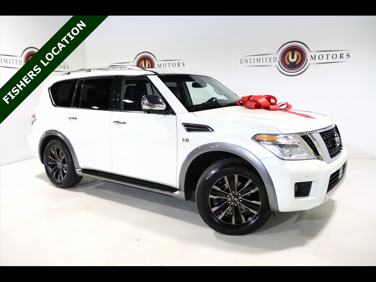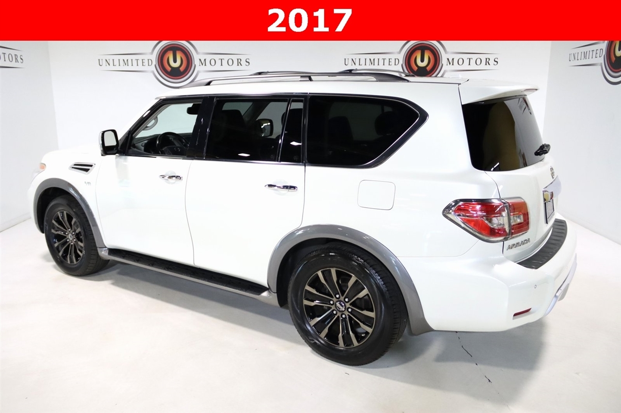 Navigation, Bluetooth, Back Up Camera, Entertainment, Sun/Moon Roof, 3rd Row, Heated Seats, Touch Screen, 13 Speakers, 2.937 Axle Ratio, 3rd row seats: split-bench, 4-Wheel Disc Brakes, A/V remote, ABS brakes, Air Conditioning, Alloy wheels, AM/FM radio: SiriusXM, Anti-whiplash front head restraints, Auto tilt-away steering wheel, Auto-dimming door mirrors, Auto-dimming Rear-View mirror, Auto-leveling suspension, Automatic temperature control, Brake assist, Bumpers: body-color, Captain Seat Package, Carpeted Floor Mats w/ Captain Seat Package, CD player, Delay-off headlights, Driver door bin, Driver vanity mirror, Dual front impact airbags, Dual front side impact airbags, Electronic Stability Control, Four wheel independent suspension, Front anti-roll bar, Front Bucket Seats, Front Center Armrest, Front dual zone A/C, Front fog lights, Front reading lights, Fully automatic headlights, Garage door transmitter: HomeLink, Headphones, Heated & Cooled Front Bucket Seats, Heated door mirrors, Heated front seats, Heated rear seats, Heated steering wheel, Illuminated entry, Illuminated Kick Plates, Lane Departure Warning System, Leather Shift Knob, Leather-Appointed Seat Trim, Low tire pressure warning, Memory seat, Navigation System, Occupant sensing airbag, Outside temperature display, Overhead airbag, Overhead console, Panic alarm, Passenger door bin, Passenger vanity mirror, Power door mirrors, Power driver seat, Power Liftgate, Power moonroof, Power passenger seat, Power steering, Power windows, Radio data system, Radio: Bose AM/FM/SXM/CD/MP3 Audio System, Rain sensing wipers, Rear air conditioning, Rear anti-roll bar, Rear reading lights, Rear seat center armrest, Rear window defroster, Rear window wiper, Reclining 3rd row seat, Remote keyless entry, Roof rack: rails only, Roof Rail Cross Bars, Second Row Captain's Chairs, Second Row Center Console w/ Padded Armrest, Security system, Speed control, Speed-sensing steering, Speed-Sensitive Wipers, Split folding rear seat, Steering wheel mounted audio controls, Tachometer, Telescoping steering wheel, Tilt steering wheel, Traction control, Trip computer, Turn signal indicator mirrors, Variably intermittent wipers, Ventilated front seats, Voltmeter, Wheels: 20 Machine-Faced Chrome w/Tinted CC. Clean CARFAX. Odometer is 34258 miles below market average!2017 Pearl White Nissan 4D Sport Utility Armada Platinum 4WD 7-Speed Automatic 5.6L V8 DOHC 32V EnduranceVisit our website www.iumotors.com to view 100s of newer vehicles, more pictures and info, or to apply for financing. Rates are incredibly low for approved credit. We offer extended warranties, protection packages, and insurance. We assure you the best experience at any of our 4 locations and unbeatable prices and quality. At Unlimited Motors we believe in MARKET VALUE PRICING. We use real-time Internet price comparisons to constantly adjust prices to provide ALL BUYERS The BEST PRICE possible. We do not mark them up, to mark them down! Our entire team is committed to helping you buy a car the way we would want to buy a car! We utilize state-of-the-art technology to constantly monitor pricing trends to offer our shoppers the best competitive pricing, value, and experience. We sell and service all makes and models of Pre-owned / Used Vehicles Used Cars, Used Trucks, Used Sport Utility, Lamborghini, Ferrari, Bentley, Rolls Royce, McLaren, Maserati, Ford, Chevrolet/Chevy, Honda, Toyota, Porsche, Land Rover, Jaguar, INFINITI, Audi, Nissan, Mazda, Hyundai, Chrysler, Jeep, Dodge, Ram, SRT, Mitsubishi, Lexus, Kia, Volkswagen, Mini, BMW, Mercedes, Fiat, Volvo, GMC, Cadillac, Lincoln as well as other brands. Proudly serving these areas of Indianapolis, Fishers, Carmel, Noblesville, Greenwood, Avon, Plainfield, Zionsville, & Brownsburg, Indiana, Midwest. We also serve the entire nation with our seamless and easy online purchasing process, and offer shipping nationwide.Advertised prices DO NOT include Sales T