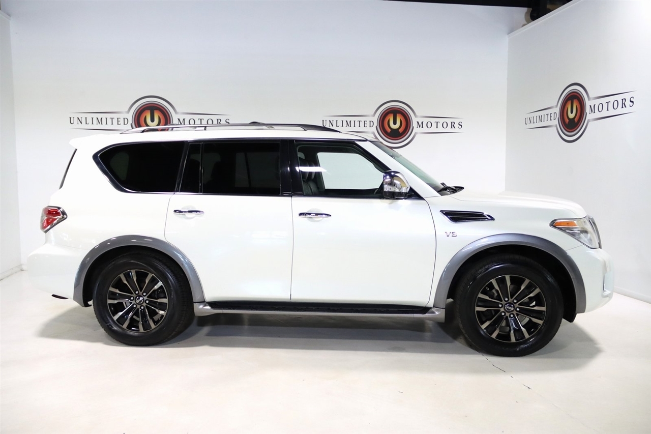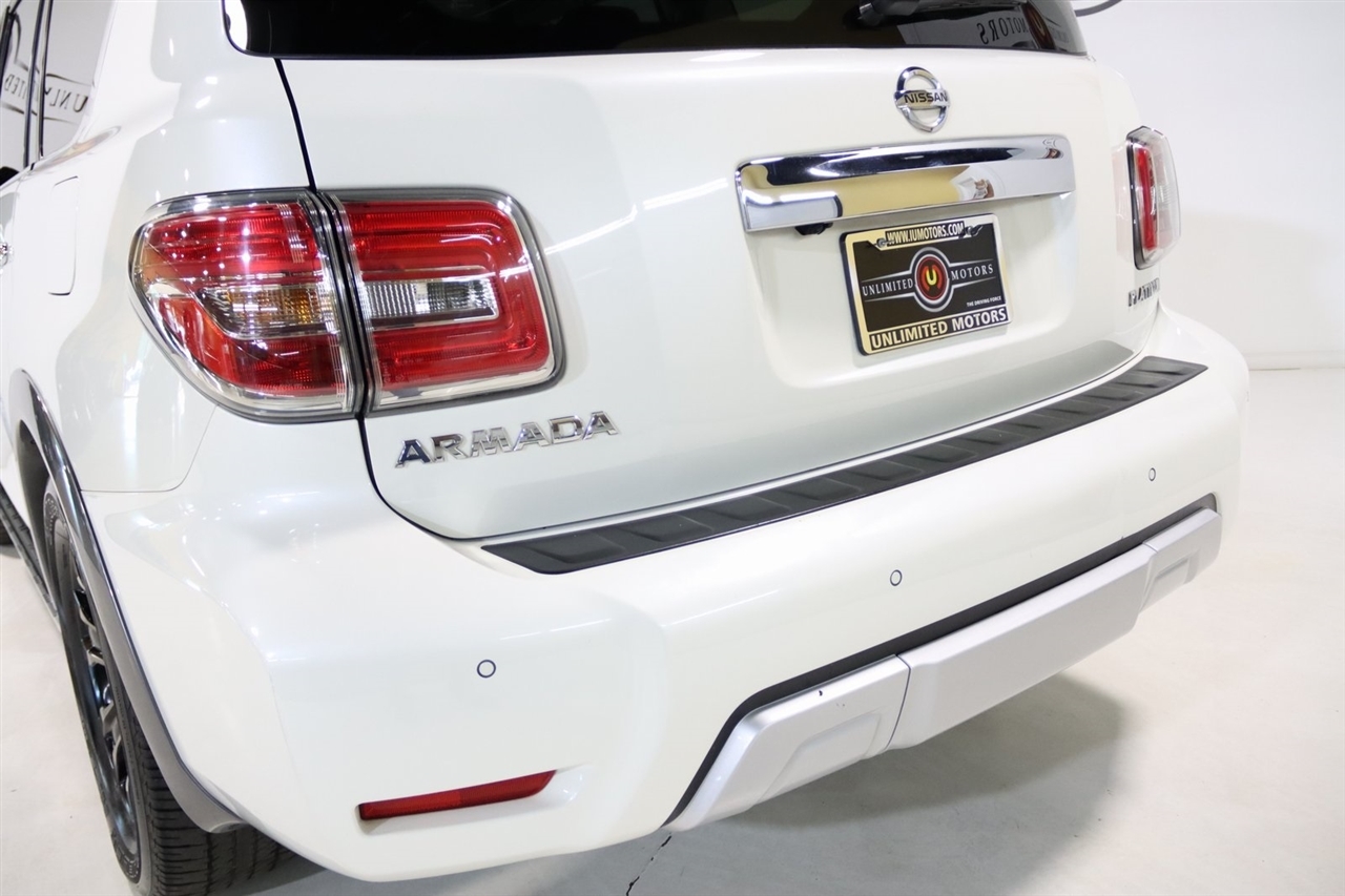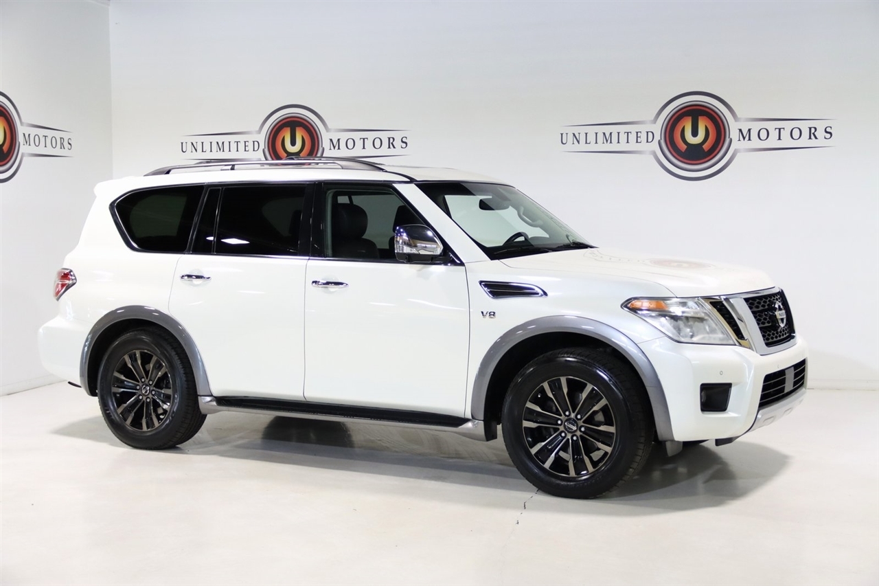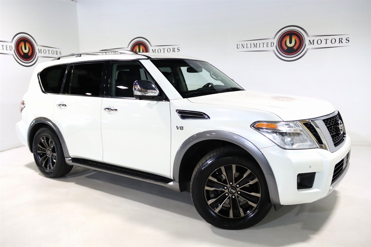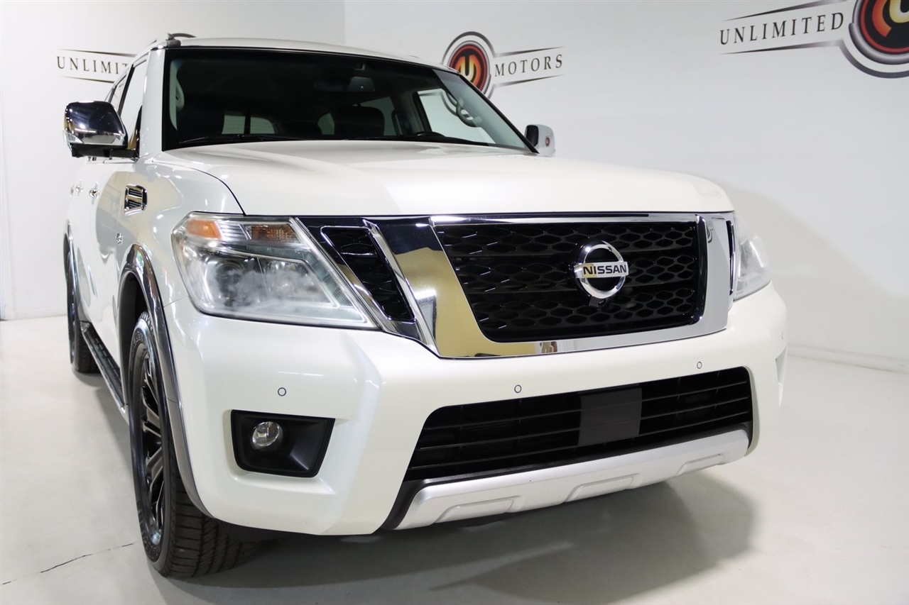 Navigation, Bluetooth, Back Up Camera, Entertainment, Sun/Moon Roof, 3rd Row, Heated Seats, Touch Screen, 13 Speakers, 2.937 Axle Ratio, 3rd row seats: split-bench, 4-Wheel Disc Brakes, A/V remote, ABS brakes, Air Conditioning, Alloy wheels, AM/FM radio: SiriusXM, Anti-whiplash front head restraints, Auto tilt-away steering wheel, Auto-dimming door mirrors, Auto-dimming Rear-View mirror, Auto-leveling suspension, Automatic temperature control, Brake assist, Bumpers: body-color, Captain Seat Package, Carpeted Floor Mats w/ Captain Seat Package, CD player, Delay-off headlights, Driver door bin, Driver vanity mirror, Dual front impact airbags, Dual front side impact airbags, Electronic Stability Control, Four wheel independent suspension, Front anti-roll bar, Front Bucket Seats, Front Center Armrest, Front dual zone A/C, Front fog lights, Front reading lights, Fully automatic headlights, Garage door transmitter: HomeLink, Headphones, Heated & Cooled Front Bucket Seats, Heated door mirrors, Heated front seats, Heated rear seats, Heated steering wheel, Illuminated entry, Illuminated Kick Plates, Lane Departure Warning System, Leather Shift Knob, Leather-Appointed Seat Trim, Low tire pressure warning, Memory seat, Navigation System, Occupant sensing airbag, Outside temperature display, Overhead airbag, Overhead console, Panic alarm, Passenger door bin, Passenger vanity mirror, Power door mirrors, Power driver seat, Power Liftgate, Power moonroof, Power passenger seat, Power steering, Power windows, Radio data system, Radio: Bose AM/FM/SXM/CD/MP3 Audio System, Rain sensing wipers, Rear air conditioning, Rear anti-roll bar, Rear reading lights, Rear seat center armrest, Rear window defroster, Rear window wiper, Reclining 3rd row seat, Remote keyless entry, Roof rack: rails only, Roof Rail Cross Bars, Second Row Captain's Chairs, Second Row Center Console w/ Padded Armrest, Security system, Speed control, Speed-sensing steering, Speed-Sensitive Wipers, Split folding rear seat, Steering wheel mounted audio controls, Tachometer, Telescoping steering wheel, Tilt steering wheel, Traction control, Trip computer, Turn signal indicator mirrors, Variably intermittent wipers, Ventilated front seats, Voltmeter, Wheels: 20 Machine-Faced Chrome w/Tinted CC. Clean CARFAX. Odometer is 34258 miles below market average!2017 Pearl White Nissan 4D Sport Utility Armada Platinum 4WD 7-Speed Automatic 5.6L V8 DOHC 32V EnduranceVisit our website www.iumotors.com to view 100s of newer vehicles, more pictures and info, or to apply for financing. Rates are incredibly low for approved credit. We offer extended warranties, protection packages, and insurance. We assure you the best experience at any of our 4 locations and unbeatable prices and quality. At Unlimited Motors we believe in MARKET VALUE PRICING. We use real-time Internet price comparisons to constantly adjust prices to provide ALL BUYERS The BEST PRICE possible. We do not mark them up, to mark them down! Our entire team is committed to helping you buy a car the way we would want to buy a car! We utilize state-of-the-art technology to constantly monitor pricing trends to offer our shoppers the best competitive pricing, value, and experience. We sell and service all makes and models of Pre-owned / Used Vehicles Used Cars, Used Trucks, Used Sport Utility, Lamborghini, Ferrari, Bentley, Rolls Royce, McLaren, Maserati, Ford, Chevrolet/Chevy, Honda, Toyota, Porsche, Land Rover, Jaguar, INFINITI, Audi, Nissan, Mazda, Hyundai, Chrysler, Jeep, Dodge, Ram, SRT, Mitsubishi, Lexus, Kia, Volkswagen, Mini, BMW, Mercedes, Fiat, Volvo, GMC, Cadillac, Lincoln as well as other brands. Proudly serving these areas of Indianapolis, Fishers, Carmel, Noblesville, Greenwood, Avon, Plainfield, Zionsville, & Brownsburg, Indiana, Midwest. We also serve the entire nation with our seamless and easy online purchasing process, and offer shipping nationwide.Advertised prices DO NOT include Sales T