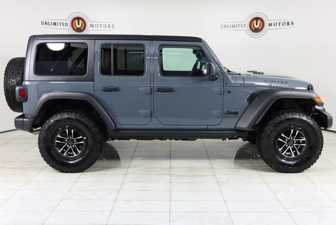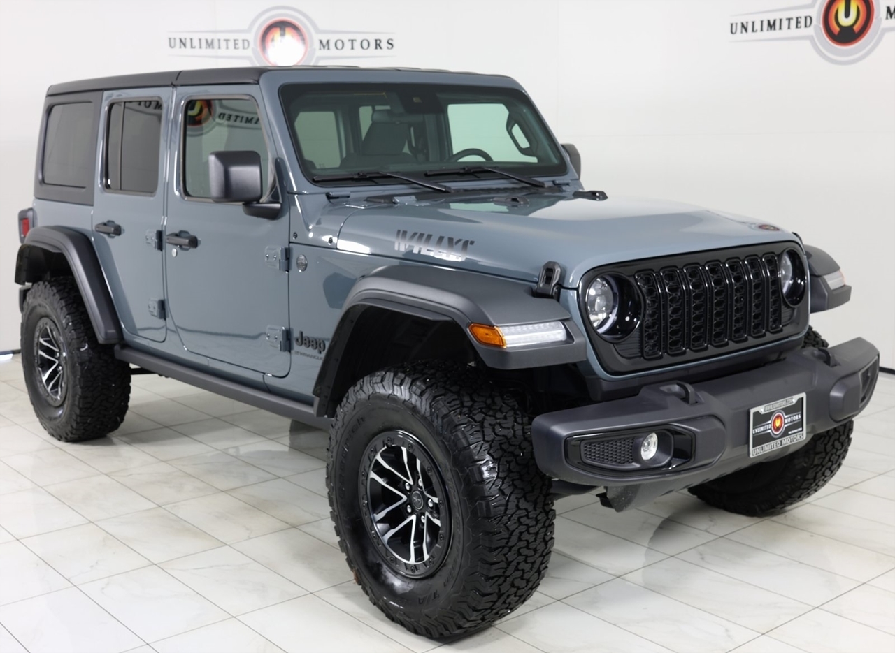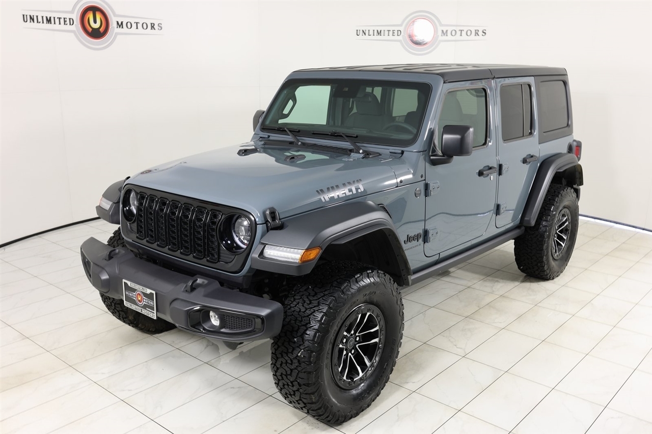 Back Up Camera, Bluetooth, Towing, Touch Screen, 1-Owner, Clean Carfax, Low Miles. Odometer is 4677 miles below market average!2025 Anvil Clear Coat Jeep 4D Sport Utility Wrangler Willys 4WD 8-Speed Automatic 3.6L V6 24V VVTVisit our website www.iumotors.com to view 100s of newer vehicles, more pictures and info, or to apply for financing. Rates are incredibly low for approved credit. We offer extended warranties, protection packages, and insurance. We assure you the best experience at any of our 4 locations and unbeatable prices and quality. At Unlimited Motors we believe in MARKET VALUE PRICING. We use real-time Internet price comparisons to constantly adjust prices to provide ALL BUYERS The BEST PRICE possible. We do not mark them up, to mark them down! Our entire team is committed to helping you buy a car the way we would want to buy a car! We utilize state-of-the-art technology to constantly monitor pricing trends to offer our shoppers the best competitive pricing, value, and experience. We sell and service all makes and models of Pre-owned / Used Vehicles Used Cars, Used Trucks, Used Sport Utility, Lamborghini, Ferrari, Bentley, Rolls Royce, McLaren, Maserati, Ford, Chevrolet/Chevy, Honda, Toyota, Porsche, Land Rover, Jaguar, INFINITI, Audi, Nissan, Mazda, Hyundai, Chrysler, Jeep, Dodge, Ram, SRT, Mitsubishi, Lexus, Kia, Volkswagen, Mini, BMW, Mercedes, Fiat, Volvo, GMC, Cadillac, Lincoln as well as other brands. Proudly serving these areas of Indianapolis, Fishers, Carmel, Noblesville, Greenwood, Avon, Plainfield, Zionsville, & Brownsburg, Indiana, Midwest. We also serve the entire nation with our seamless and easy online purchasing process, and offer shipping nationwide.Advertised prices DO NOT include Sales Tax, Dealer Fees, Title Processing Charges, and Dealer Pre-installed Products.