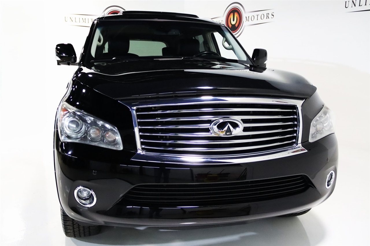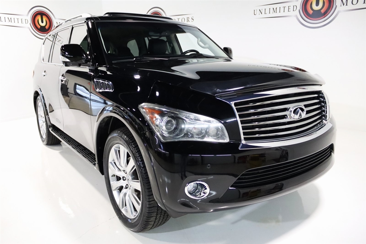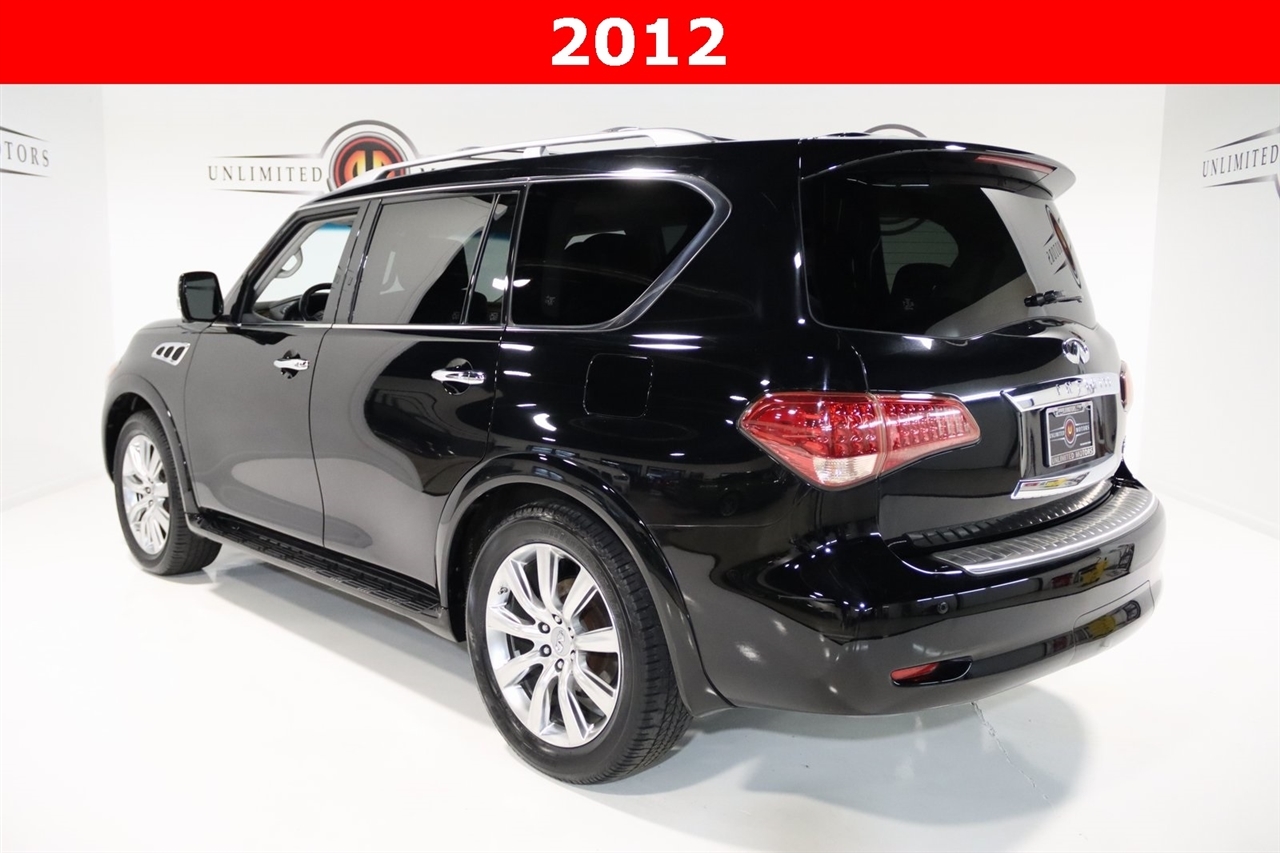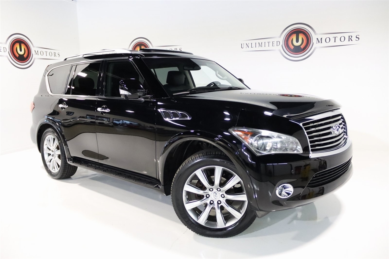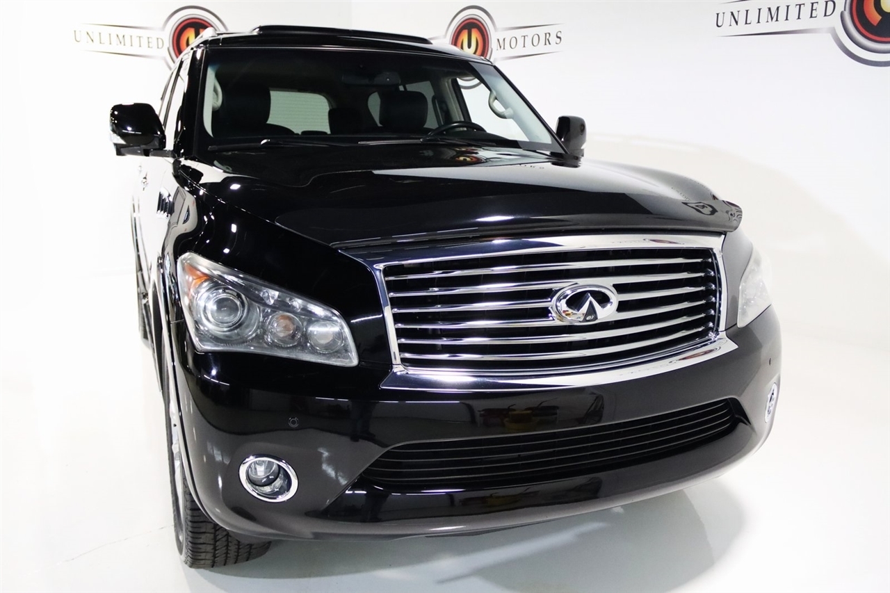 Navigation, Bluetooth, Back Up Camera, Entertainment, Sun/Moon Roof, 3rd Row, Heated Seats, Touch Screen, 120V Power Outlet, 13 Speakers, 2.937 Axle Ratio, 22 x 8.0 9-Spoke Forged Aluminum Alloy Wheels, 3rd row seats: split-bench, 4-Wheel Disc Brakes, ABS brakes, Air Conditioning, Alloy wheels, AM/FM radio: XM, Anti-whiplash front head restraints, Auto tilt-away steering wheel, Auto-dimming door mirrors, Auto-dimming Rear-View mirror, Auto-leveling suspension, Automatic temperature control, Brake assist, Bumpers: body-color, Carpeted Cargo Mat/Cargo Net & First Aid Kit, CD player, Delay-off headlights, Driver door bin, Driver vanity mirror, Driver's Seat Mounted Armrest, Dual 7 Color Monitors, Dual front impact airbags, Dual front side impact airbags, Electronic Stability Control, Exterior Parking Camera Rear, Four wheel independent suspension, Front anti-roll bar, Front Bucket Seats, Front Center Armrest, Front dual zone A/C, Front fog lights, Front reading lights, Fully automatic headlights, Garage door transmitter: HomeLink, Genuine wood console insert, Genuine wood dashboard insert, Genuine wood door panel insert, Heated 2nd-Row Seats, Heated door mirrors, Heated Front Bucket Seats, Heated front seats, Heated steering wheel, High intensity discharge headlights: Bi-Xenon, Illuminated entry, Illuminated Kick Plates, Leather Shift Knob, Leather steering wheel, Leather-Appointed Seat Trim w/Tuscan Burl, Low tire pressure warning, Memory seat, Navigation System, Occupant sensing airbag, Outside temperature display, Overhead airbag, Overhead console, Panic alarm, Passenger door bin, Passenger seat mounted armrest, Passenger vanity mirror, Power door mirrors, Power driver seat, Power Liftgate, Power moonroof, Power passenger seat, Power steering, Power windows, Radio data system, Radio: Bose Premium Sound System w/XM Satellite, Rain sensing wipers, Rear air conditioning, Rear anti-roll bar, Rear audio controls, Rear reading lights, Rear seat center armrest, Rear window defroster, Rear window wiper, Reclining 3rd row seat, Remote keyless entry, Roof rack: rails only, Roof Rail Crossbars, Security system, Speed control, Speed-sensing steering, Split folding rear seat, Spoiler, Stainless Steel Rear Bumper Protector, Steering wheel memory, Steering wheel mounted audio controls, Tachometer, Telescoping steering wheel, Theater Package, Tilt steering wheel, Tire and Wheel Package, Traction control, Trip computer, Turn signal indicator mirrors, Variably intermittent wipers, Voltmeter, Wireless Headphones (2). CARFAX One-Owner. Clean CARFAX. Odometer is 104483 miles below market average!2012 Black Obsidian INFINITI 4D Sport Utility QX56 AWD 7-Speed Automatic 5.6L V8 DOHC 32VAwards: * JD Power APEAL StudyVisit our website www.iumotors.com to view 100s of newer vehicles, more pictures and info, or to apply for financing. Rates are incredibly low for approved credit. We offer extended warranties, protection packages, and insurance. We assure you the best experience at any of our 4 locations and unbeatable prices and quality. At Unlimited Motors we believe in MARKET VALUE PRICING. We use real-time Internet price comparisons to constantly adjust prices to provide ALL BUYERS The BEST PRICE possible. We do not mark them up, to mark them down! Our entire team is committed to helping you buy a car the way we would want to buy a car! We utilize state-of-the-art technology to constantly monitor pricing trends to offer our shoppers the best competitive pricing, value, and experience. We sell and service all makes and models of Pre-owned / Used Vehicles Used Cars, Used Trucks, Used Sport Utility, Lamborghini, Ferrari, Bentley, Rolls Royce, McLaren, Maserati, Ford, Chevrolet/Chevy, Honda, Toyota, Porsche, Land Rover, Jaguar, INFINITI, Audi, Nissan, Mazda, Hyundai, Chrysler, Jeep, Dodge, Ram, SRT, Mitsubishi, Lexus, Kia, Volkswagen, Mini, BMW, Mercedes, Fiat, Volvo, GMC, Cadillac, Lincoln as well as other brands. P