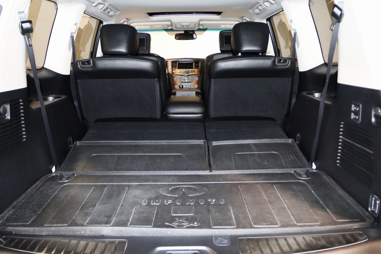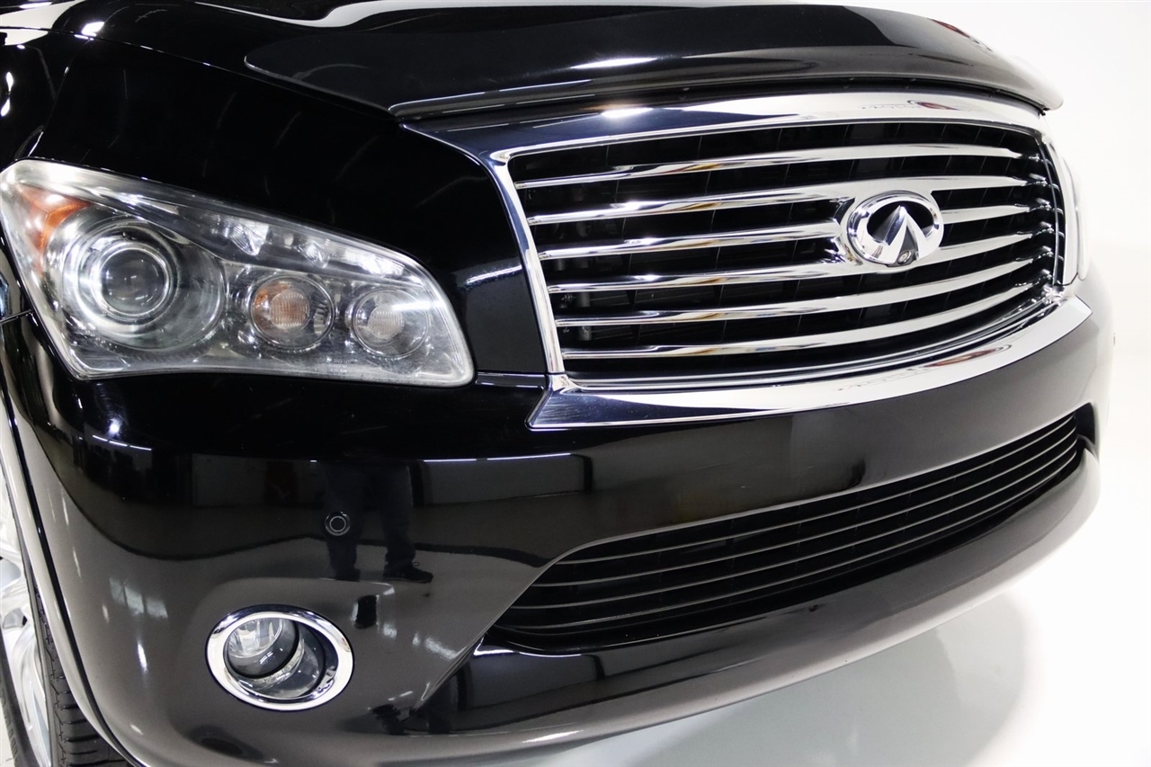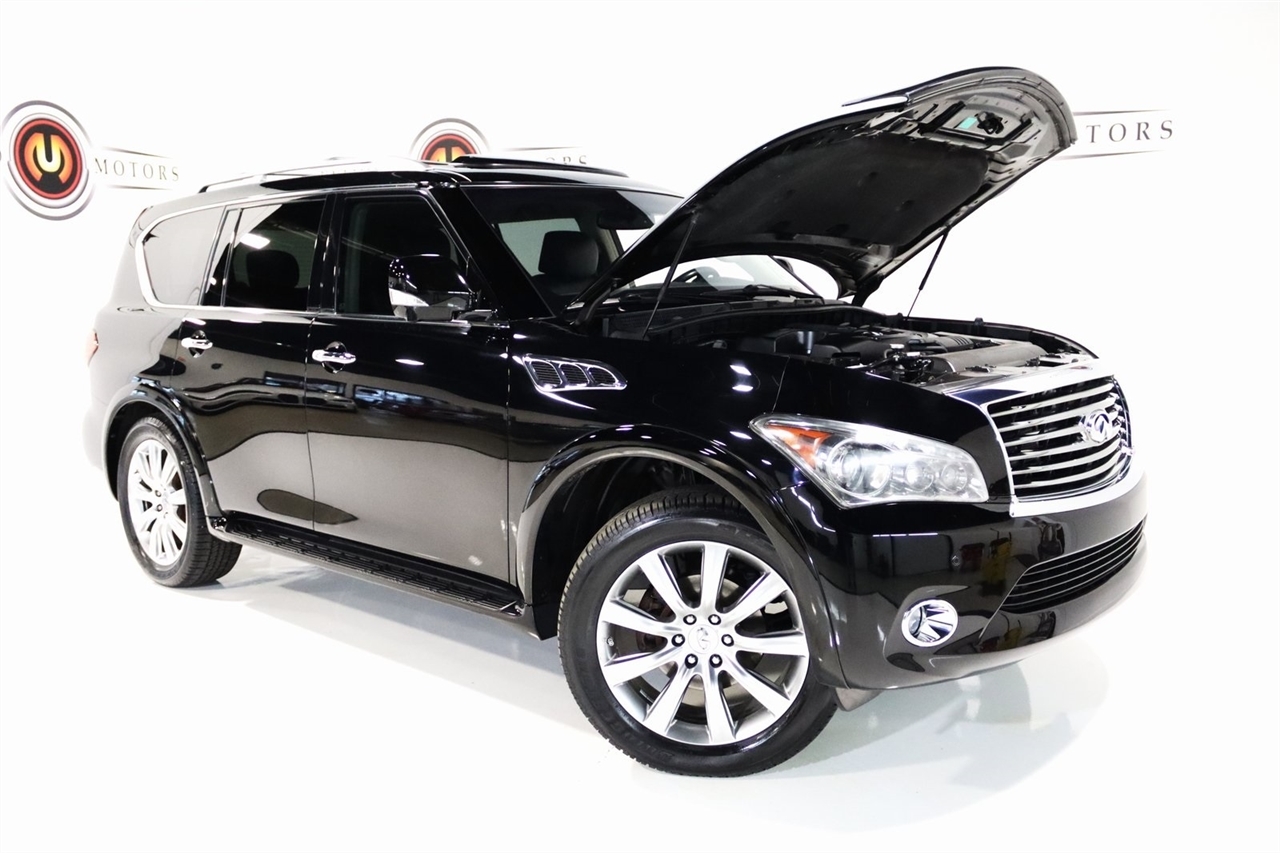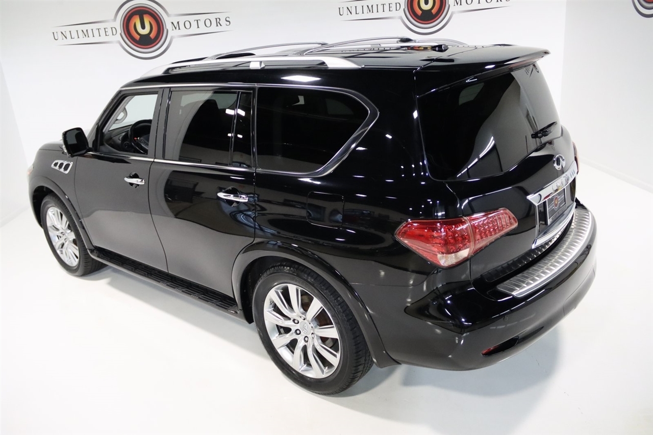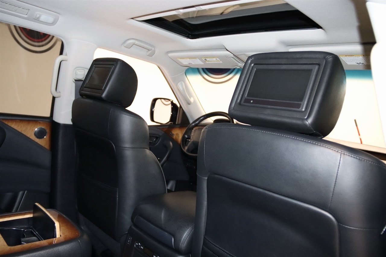 Navigation, Bluetooth, Back Up Camera, Entertainment, Sun/Moon Roof, 3rd Row, Heated Seats, Touch Screen, 120V Power Outlet, 13 Speakers, 2.937 Axle Ratio, 22 x 8.0 9-Spoke Forged Aluminum Alloy Wheels, 3rd row seats: split-bench, 4-Wheel Disc Brakes, ABS brakes, Air Conditioning, Alloy wheels, AM/FM radio: XM, Anti-whiplash front head restraints, Auto tilt-away steering wheel, Auto-dimming door mirrors, Auto-dimming Rear-View mirror, Auto-leveling suspension, Automatic temperature control, Brake assist, Bumpers: body-color, Carpeted Cargo Mat/Cargo Net & First Aid Kit, CD player, Delay-off headlights, Driver door bin, Driver vanity mirror, Driver's Seat Mounted Armrest, Dual 7 Color Monitors, Dual front impact airbags, Dual front side impact airbags, Electronic Stability Control, Exterior Parking Camera Rear, Four wheel independent suspension, Front anti-roll bar, Front Bucket Seats, Front Center Armrest, Front dual zone A/C, Front fog lights, Front reading lights, Fully automatic headlights, Garage door transmitter: HomeLink, Genuine wood console insert, Genuine wood dashboard insert, Genuine wood door panel insert, Heated 2nd-Row Seats, Heated door mirrors, Heated Front Bucket Seats, Heated front seats, Heated steering wheel, High intensity discharge headlights: Bi-Xenon, Illuminated entry, Illuminated Kick Plates, Leather Shift Knob, Leather steering wheel, Leather-Appointed Seat Trim w/Tuscan Burl, Low tire pressure warning, Memory seat, Navigation System, Occupant sensing airbag, Outside temperature display, Overhead airbag, Overhead console, Panic alarm, Passenger door bin, Passenger seat mounted armrest, Passenger vanity mirror, Power door mirrors, Power driver seat, Power Liftgate, Power moonroof, Power passenger seat, Power steering, Power windows, Radio data system, Radio: Bose Premium Sound System w/XM Satellite, Rain sensing wipers, Rear air conditioning, Rear anti-roll bar, Rear audio controls, Rear reading lights, Rear seat center armrest, Rear window defroster, Rear window wiper, Reclining 3rd row seat, Remote keyless entry, Roof rack: rails only, Roof Rail Crossbars, Security system, Speed control, Speed-sensing steering, Split folding rear seat, Spoiler, Stainless Steel Rear Bumper Protector, Steering wheel memory, Steering wheel mounted audio controls, Tachometer, Telescoping steering wheel, Theater Package, Tilt steering wheel, Tire and Wheel Package, Traction control, Trip computer, Turn signal indicator mirrors, Variably intermittent wipers, Voltmeter, Wireless Headphones (2). CARFAX One-Owner. Clean CARFAX. Odometer is 104483 miles below market average!2012 Black Obsidian INFINITI 4D Sport Utility QX56 AWD 7-Speed Automatic 5.6L V8 DOHC 32VAwards: * JD Power APEAL StudyVisit our website www.iumotors.com to view 100s of newer vehicles, more pictures and info, or to apply for financing. Rates are incredibly low for approved credit. We offer extended warranties, protection packages, and insurance. We assure you the best experience at any of our 4 locations and unbeatable prices and quality. At Unlimited Motors we believe in MARKET VALUE PRICING. We use real-time Internet price comparisons to constantly adjust prices to provide ALL BUYERS The BEST PRICE possible. We do not mark them up, to mark them down! Our entire team is committed to helping you buy a car the way we would want to buy a car! We utilize state-of-the-art technology to constantly monitor pricing trends to offer our shoppers the best competitive pricing, value, and experience. We sell and service all makes and models of Pre-owned / Used Vehicles Used Cars, Used Trucks, Used Sport Utility, Lamborghini, Ferrari, Bentley, Rolls Royce, McLaren, Maserati, Ford, Chevrolet/Chevy, Honda, Toyota, Porsche, Land Rover, Jaguar, INFINITI, Audi, Nissan, Mazda, Hyundai, Chrysler, Jeep, Dodge, Ram, SRT, Mitsubishi, Lexus, Kia, Volkswagen, Mini, BMW, Mercedes, Fiat, Volvo, GMC, Cadillac, Lincoln as well as other brands. P