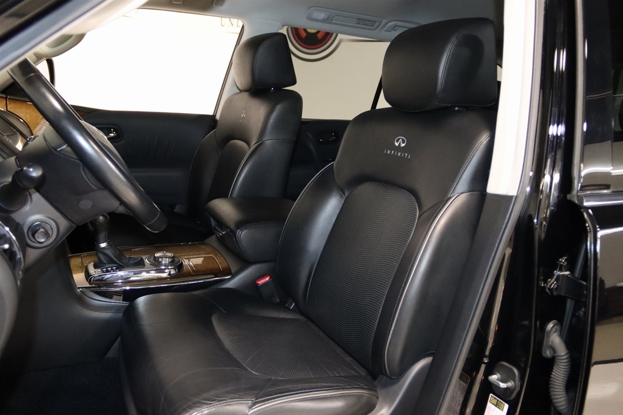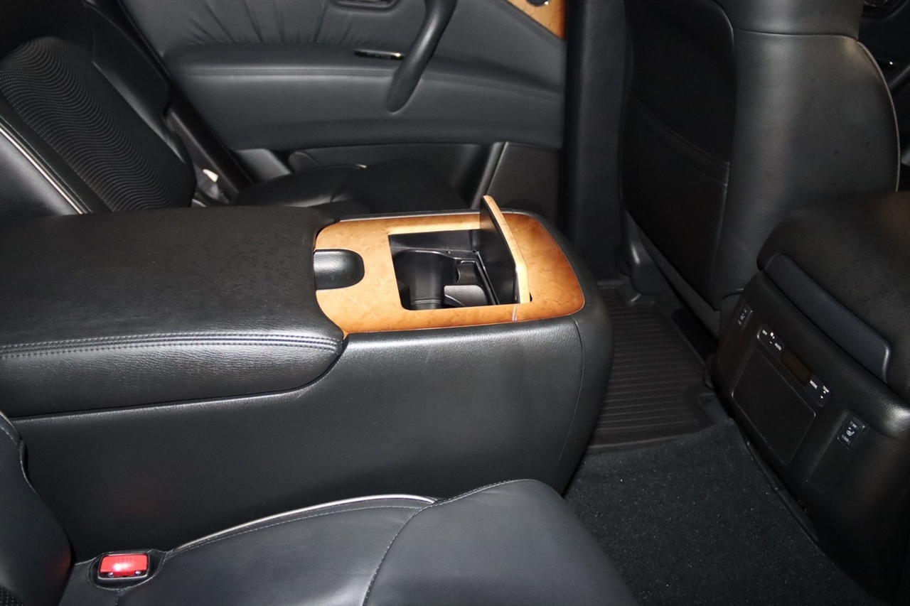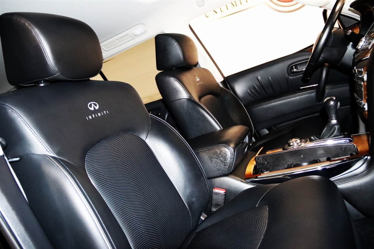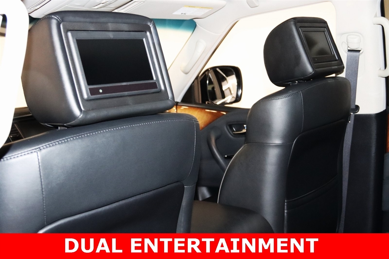 Navigation, Bluetooth, Back Up Camera, Entertainment, Sun/Moon Roof, 3rd Row, Heated Seats, Touch Screen, 120V Power Outlet, 13 Speakers, 2.937 Axle Ratio, 22 x 8.0 9-Spoke Forged Aluminum Alloy Wheels, 3rd row seats: split-bench, 4-Wheel Disc Brakes, ABS brakes, Air Conditioning, Alloy wheels, AM/FM radio: XM, Anti-whiplash front head restraints, Auto tilt-away steering wheel, Auto-dimming door mirrors, Auto-dimming Rear-View mirror, Auto-leveling suspension, Automatic temperature control, Brake assist, Bumpers: body-color, Carpeted Cargo Mat/Cargo Net & First Aid Kit, CD player, Delay-off headlights, Driver door bin, Driver vanity mirror, Driver's Seat Mounted Armrest, Dual 7 Color Monitors, Dual front impact airbags, Dual front side impact airbags, Electronic Stability Control, Exterior Parking Camera Rear, Four wheel independent suspension, Front anti-roll bar, Front Bucket Seats, Front Center Armrest, Front dual zone A/C, Front fog lights, Front reading lights, Fully automatic headlights, Garage door transmitter: HomeLink, Genuine wood console insert, Genuine wood dashboard insert, Genuine wood door panel insert, Heated 2nd-Row Seats, Heated door mirrors, Heated Front Bucket Seats, Heated front seats, Heated steering wheel, High intensity discharge headlights: Bi-Xenon, Illuminated entry, Illuminated Kick Plates, Leather Shift Knob, Leather steering wheel, Leather-Appointed Seat Trim w/Tuscan Burl, Low tire pressure warning, Memory seat, Navigation System, Occupant sensing airbag, Outside temperature display, Overhead airbag, Overhead console, Panic alarm, Passenger door bin, Passenger seat mounted armrest, Passenger vanity mirror, Power door mirrors, Power driver seat, Power Liftgate, Power moonroof, Power passenger seat, Power steering, Power windows, Radio data system, Radio: Bose Premium Sound System w/XM Satellite, Rain sensing wipers, Rear air conditioning, Rear anti-roll bar, Rear audio controls, Rear reading lights, Rear seat center armrest, Rear window defroster, Rear window wiper, Reclining 3rd row seat, Remote keyless entry, Roof rack: rails only, Roof Rail Crossbars, Security system, Speed control, Speed-sensing steering, Split folding rear seat, Spoiler, Stainless Steel Rear Bumper Protector, Steering wheel memory, Steering wheel mounted audio controls, Tachometer, Telescoping steering wheel, Theater Package, Tilt steering wheel, Tire and Wheel Package, Traction control, Trip computer, Turn signal indicator mirrors, Variably intermittent wipers, Voltmeter, Wireless Headphones (2). CARFAX One-Owner. Clean CARFAX. Odometer is 104483 miles below market average!2012 Black Obsidian INFINITI 4D Sport Utility QX56 AWD 7-Speed Automatic 5.6L V8 DOHC 32VAwards: * JD Power APEAL StudyVisit our website www.iumotors.com to view 100s of newer vehicles, more pictures and info, or to apply for financing. Rates are incredibly low for approved credit. We offer extended warranties, protection packages, and insurance. We assure you the best experience at any of our 4 locations and unbeatable prices and quality. At Unlimited Motors we believe in MARKET VALUE PRICING. We use real-time Internet price comparisons to constantly adjust prices to provide ALL BUYERS The BEST PRICE possible. We do not mark them up, to mark them down! Our entire team is committed to helping you buy a car the way we would want to buy a car! We utilize state-of-the-art technology to constantly monitor pricing trends to offer our shoppers the best competitive pricing, value, and experience. We sell and service all makes and models of Pre-owned / Used Vehicles Used Cars, Used Trucks, Used Sport Utility, Lamborghini, Ferrari, Bentley, Rolls Royce, McLaren, Maserati, Ford, Chevrolet/Chevy, Honda, Toyota, Porsche, Land Rover, Jaguar, INFINITI, Audi, Nissan, Mazda, Hyundai, Chrysler, Jeep, Dodge, Ram, SRT, Mitsubishi, Lexus, Kia, Volkswagen, Mini, BMW, Mercedes, Fiat, Volvo, GMC, Cadillac, Lincoln as well as other brands. P