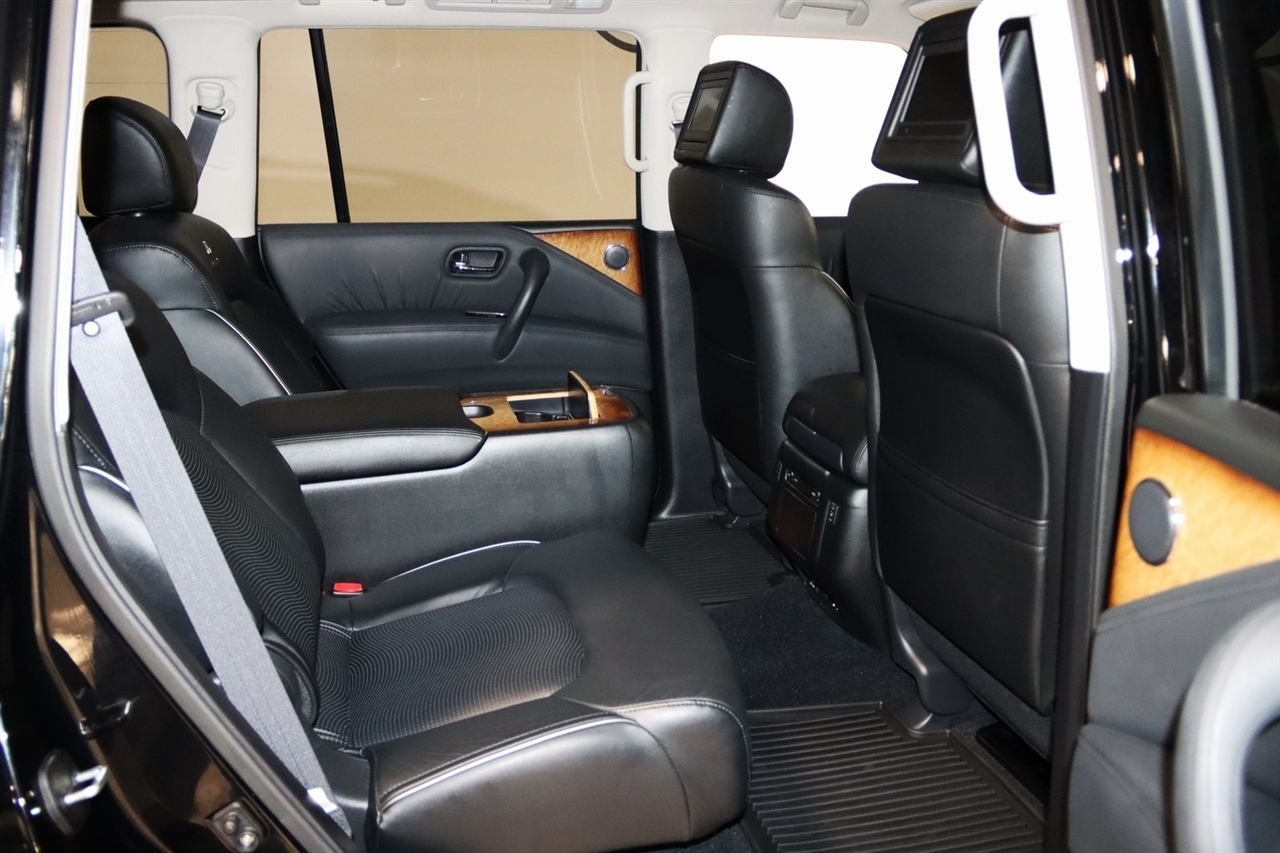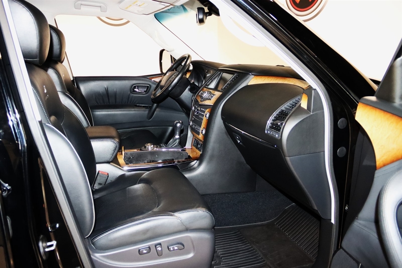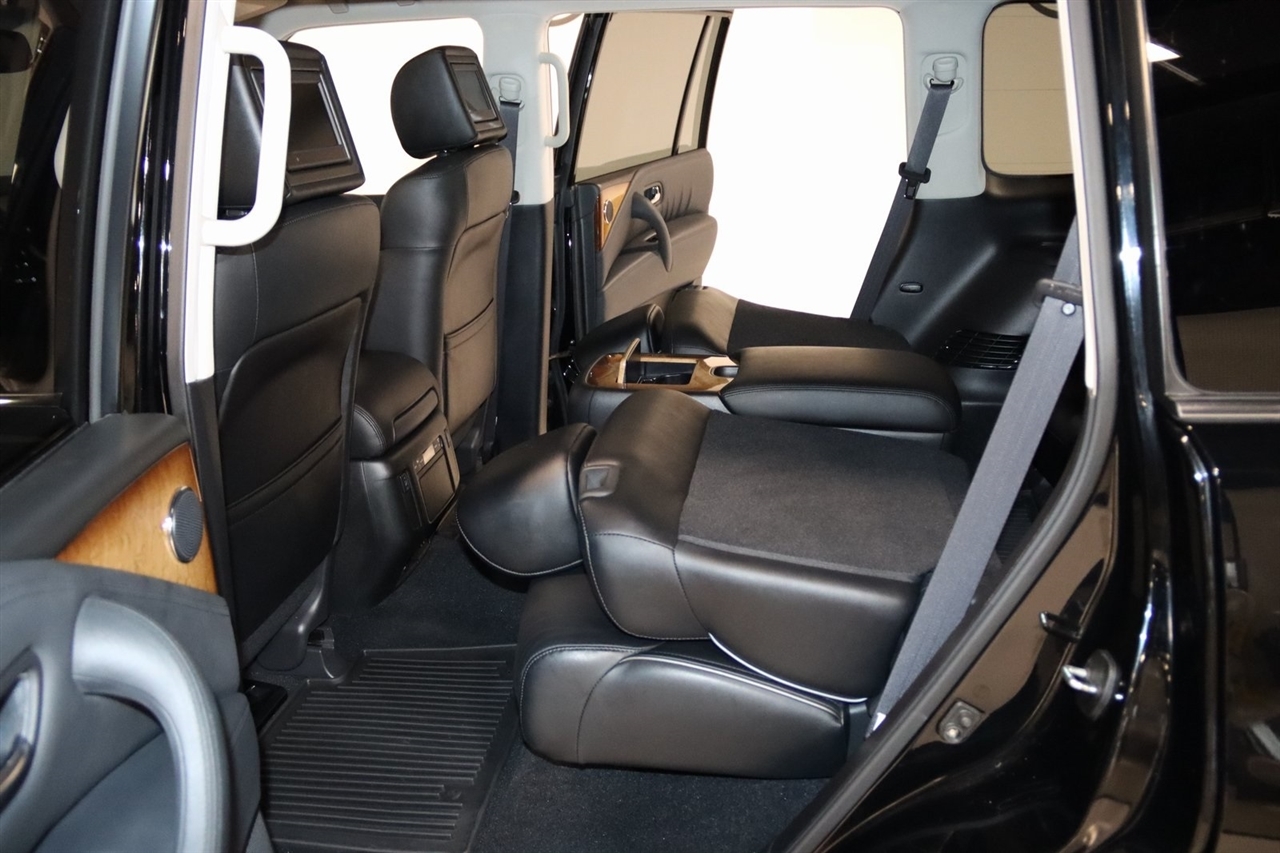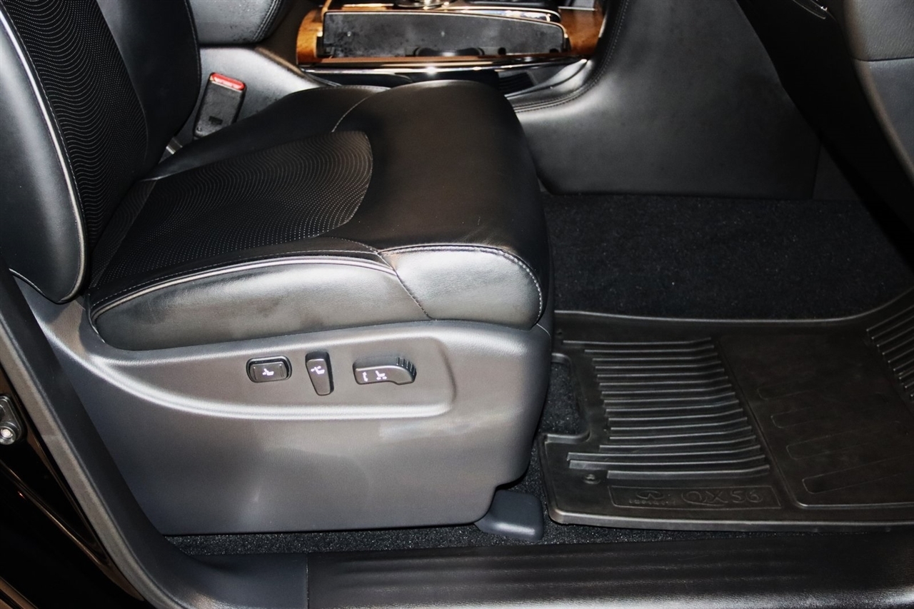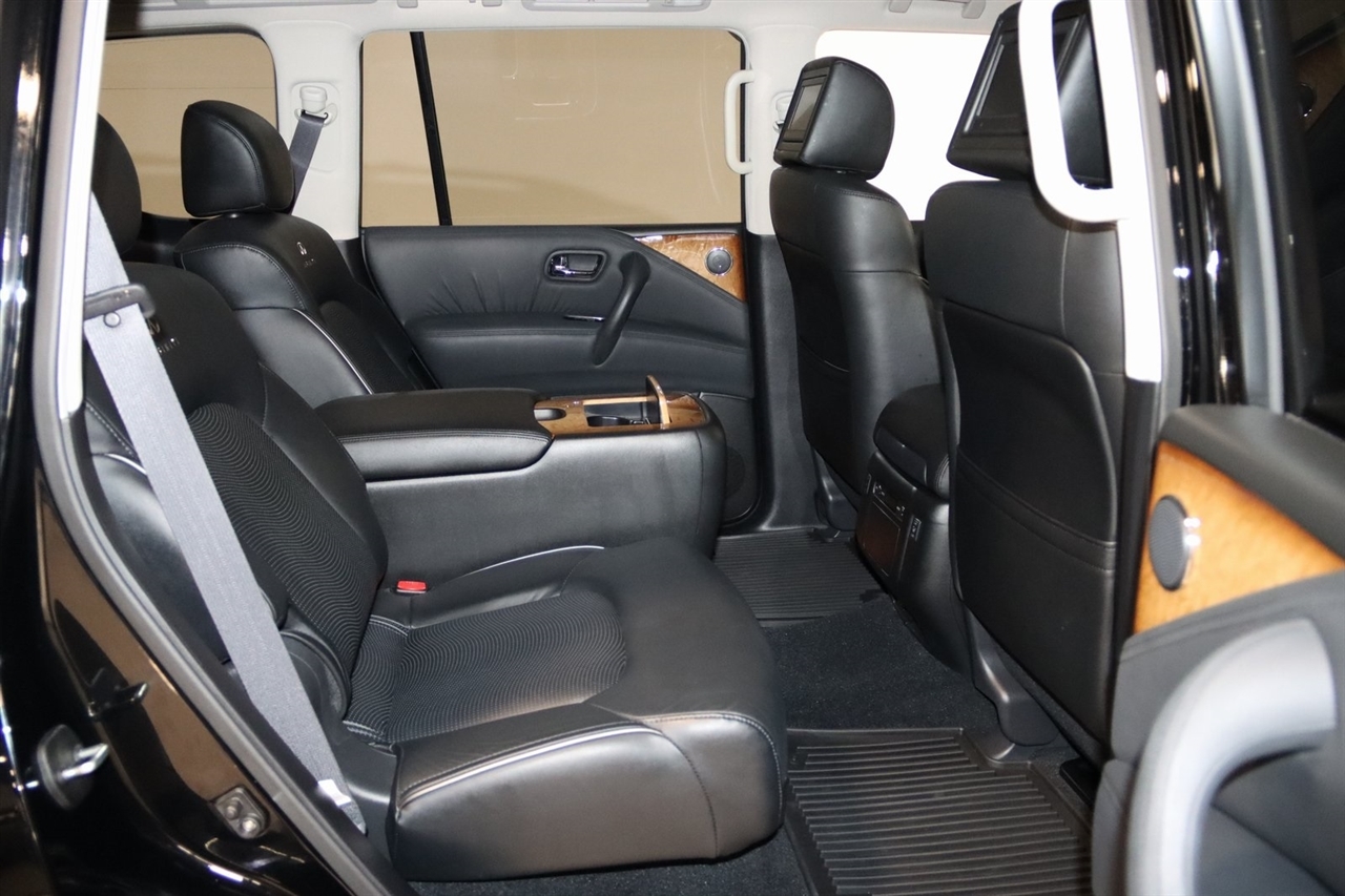 Navigation, Bluetooth, Back Up Camera, Entertainment, Sun/Moon Roof, 3rd Row, Heated Seats, Touch Screen, 120V Power Outlet, 13 Speakers, 2.937 Axle Ratio, 22 x 8.0 9-Spoke Forged Aluminum Alloy Wheels, 3rd row seats: split-bench, 4-Wheel Disc Brakes, ABS brakes, Air Conditioning, Alloy wheels, AM/FM radio: XM, Anti-whiplash front head restraints, Auto tilt-away steering wheel, Auto-dimming door mirrors, Auto-dimming Rear-View mirror, Auto-leveling suspension, Automatic temperature control, Brake assist, Bumpers: body-color, Carpeted Cargo Mat/Cargo Net & First Aid Kit, CD player, Delay-off headlights, Driver door bin, Driver vanity mirror, Driver's Seat Mounted Armrest, Dual 7 Color Monitors, Dual front impact airbags, Dual front side impact airbags, Electronic Stability Control, Exterior Parking Camera Rear, Four wheel independent suspension, Front anti-roll bar, Front Bucket Seats, Front Center Armrest, Front dual zone A/C, Front fog lights, Front reading lights, Fully automatic headlights, Garage door transmitter: HomeLink, Genuine wood console insert, Genuine wood dashboard insert, Genuine wood door panel insert, Heated 2nd-Row Seats, Heated door mirrors, Heated Front Bucket Seats, Heated front seats, Heated steering wheel, High intensity discharge headlights: Bi-Xenon, Illuminated entry, Illuminated Kick Plates, Leather Shift Knob, Leather steering wheel, Leather-Appointed Seat Trim w/Tuscan Burl, Low tire pressure warning, Memory seat, Navigation System, Occupant sensing airbag, Outside temperature display, Overhead airbag, Overhead console, Panic alarm, Passenger door bin, Passenger seat mounted armrest, Passenger vanity mirror, Power door mirrors, Power driver seat, Power Liftgate, Power moonroof, Power passenger seat, Power steering, Power windows, Radio data system, Radio: Bose Premium Sound System w/XM Satellite, Rain sensing wipers, Rear air conditioning, Rear anti-roll bar, Rear audio controls, Rear reading lights, Rear seat center armrest, Rear window defroster, Rear window wiper, Reclining 3rd row seat, Remote keyless entry, Roof rack: rails only, Roof Rail Crossbars, Security system, Speed control, Speed-sensing steering, Split folding rear seat, Spoiler, Stainless Steel Rear Bumper Protector, Steering wheel memory, Steering wheel mounted audio controls, Tachometer, Telescoping steering wheel, Theater Package, Tilt steering wheel, Tire and Wheel Package, Traction control, Trip computer, Turn signal indicator mirrors, Variably intermittent wipers, Voltmeter, Wireless Headphones (2). CARFAX One-Owner. Clean CARFAX. Odometer is 104483 miles below market average!2012 Black Obsidian INFINITI 4D Sport Utility QX56 AWD 7-Speed Automatic 5.6L V8 DOHC 32VAwards: * JD Power APEAL StudyVisit our website www.iumotors.com to view 100s of newer vehicles, more pictures and info, or to apply for financing. Rates are incredibly low for approved credit. We offer extended warranties, protection packages, and insurance. We assure you the best experience at any of our 4 locations and unbeatable prices and quality. At Unlimited Motors we believe in MARKET VALUE PRICING. We use real-time Internet price comparisons to constantly adjust prices to provide ALL BUYERS The BEST PRICE possible. We do not mark them up, to mark them down! Our entire team is committed to helping you buy a car the way we would want to buy a car! We utilize state-of-the-art technology to constantly monitor pricing trends to offer our shoppers the best competitive pricing, value, and experience. We sell and service all makes and models of Pre-owned / Used Vehicles Used Cars, Used Trucks, Used Sport Utility, Lamborghini, Ferrari, Bentley, Rolls Royce, McLaren, Maserati, Ford, Chevrolet/Chevy, Honda, Toyota, Porsche, Land Rover, Jaguar, INFINITI, Audi, Nissan, Mazda, Hyundai, Chrysler, Jeep, Dodge, Ram, SRT, Mitsubishi, Lexus, Kia, Volkswagen, Mini, BMW, Mercedes, Fiat, Volvo, GMC, Cadillac, Lincoln as well as other brands. P
