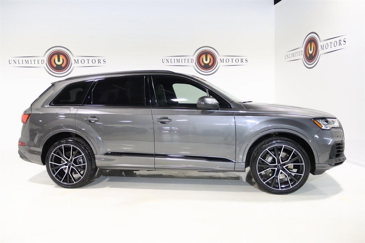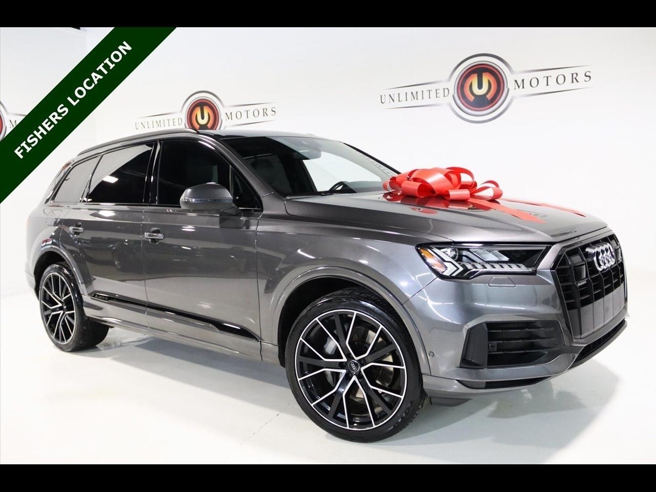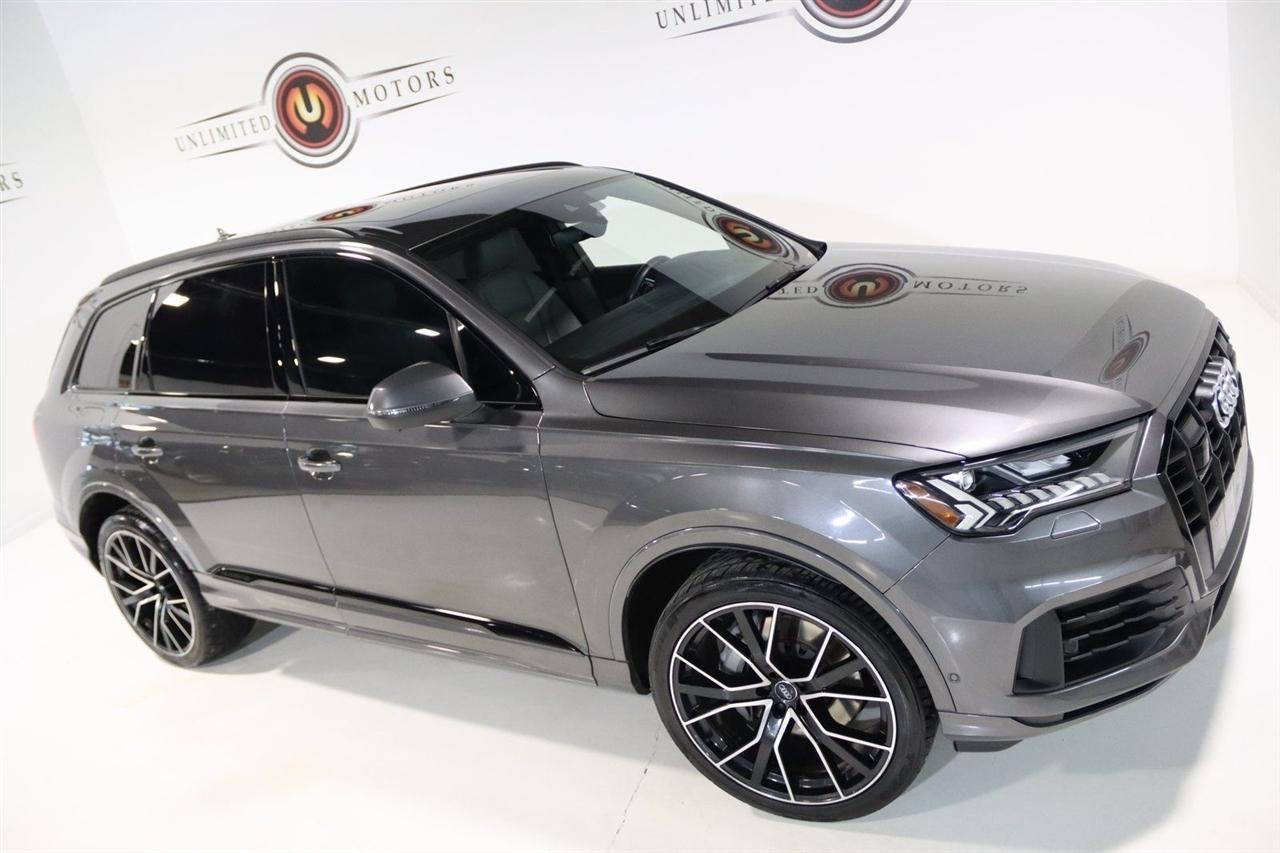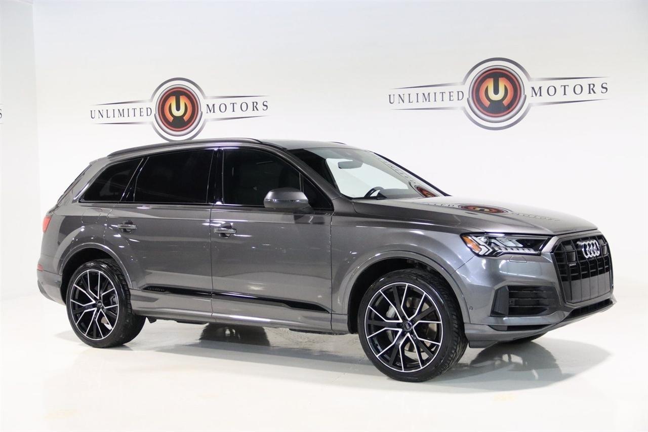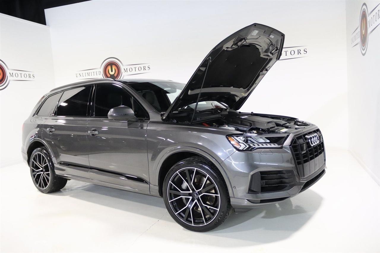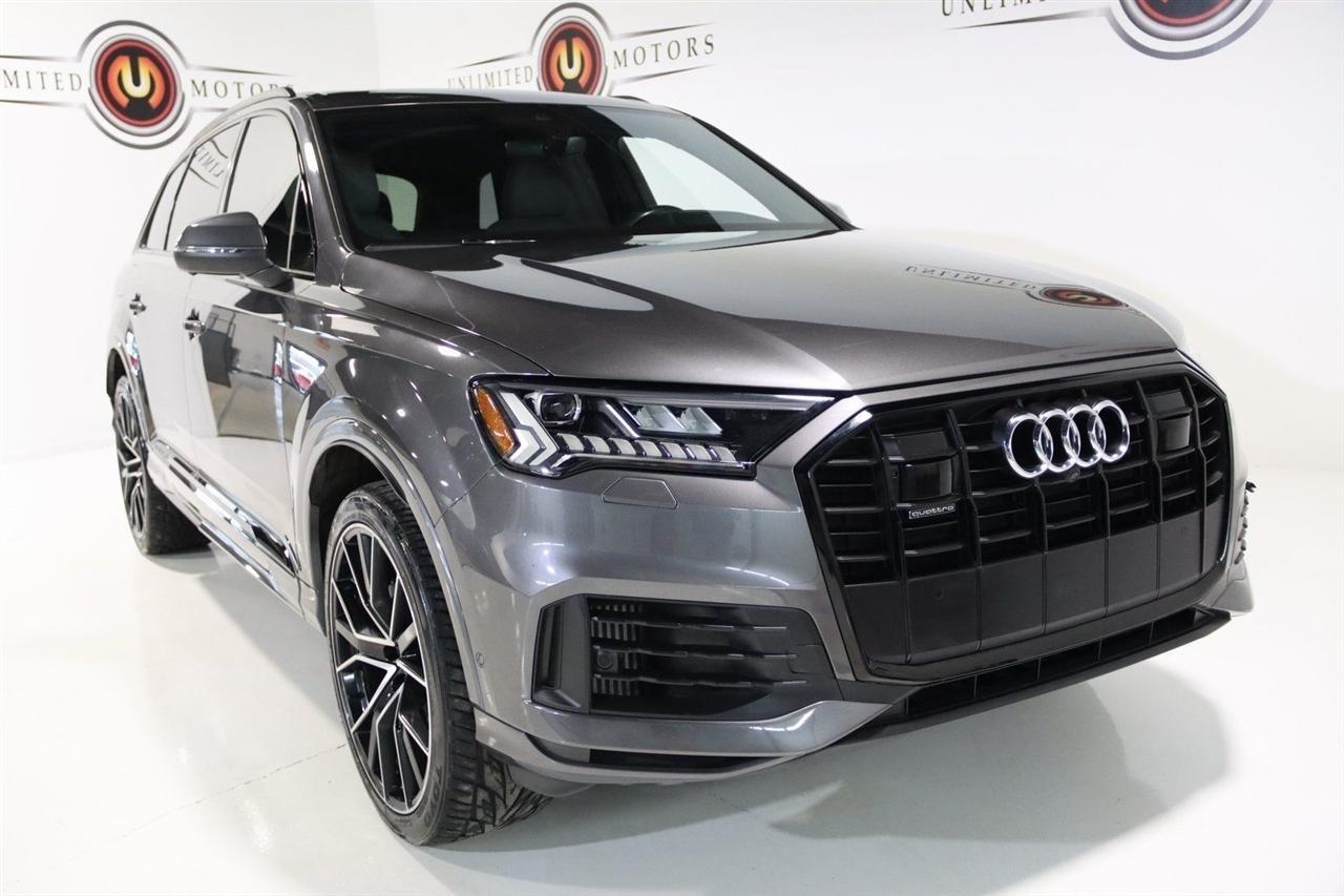 Navigation, Bluetooth, Back Up Camera, Panoramic Roof, 3rd Row, Heated Seats, Touch Screen, 10 Speakers, 3.204 Axle Ratio, 3rd row seats: bench, 4-Wheel Disc Brakes, ABS brakes, Air Conditioning, Alloy wheels, AM/FM radio: SiriusXM, Audi smartphone interface (Apple CarPlay/Android Auto), Auto High-beam Headlights, Auto-dimming Rear-View mirror, Automatic temperature control, Bang & Olufsen 3D Premium Sound System, Black Cloth Headliner, Black Door Blades, Black Front & Rear Bumper Inserts, Black Grille, Black Optic Exterior Package, Black Optic Package, Black Roof Rails, Black Window Surrounds, Brake assist, Bumpers: body-color, Comfort Adaptive Air Suspension, Compass, Contour/Ambient LED Interior Lighting Package, Convenience Package, Delay-off headlights, Driver door bin, Driver vanity mirror, Dual front impact airbags, Dual front side impact airbags, Dual-Pane Acoustic Side Windows, Electronic Stability Control, Emergency communication system: Audi connect CARE, PRIME & PLUS, Executive Package, Exterior Parking Camera Rear, Four wheel independent suspension, Front & Rear Doors Audi Beam-Rings, Front anti-roll bar, Front Bucket Seats, Front Center Armrest, Front dual zone A/C, Front fog lights, Front reading lights, Fully automatic headlights, Garage door transmitter: HomeLink, Genuine wood door panel insert, Gray/Brown Fine Grain Ash Natural Wood Inlays, Head-Up Display, Heated door mirrors, Heated Front Bucket Seats, Heated front seats, Illuminated Door Sills, Illuminated entry, Interior Protection Package, Intersection Assist, Leather Seating Surfaces, Leather Shift Knob, Leather steering wheel, Low tire pressure warning, Matrix-Design LED Headlights, Memory seat, Navigation System, Navigation system: Audi MMI Navigation plus with Touch Response, Occupant sensing airbag, Outside temperature display, Overhead airbag, Overhead console, Panic alarm, Passenger door bin, Passenger vanity mirror, Power door mirrors, Power driver seat, Power Liftgate, Power moonroof, Power passenger seat, Power Soft-Closing Doors, Power steering, Power windows, Prestige Package, Privacy Trunk Cover, Radio data system, Radio: Audi Sound System, Rain sensing wipers, Rear air conditioning, Rear anti-roll bar, Rear fog lights, Rear reading lights, Rear seat center armrest, Rear window defroster, Rear window wiper, Reclining 3rd row seat, Remote keyless entry, Roof rack: rails only, Security system, Speed control, Speed-sensing steering, Split folding rear seat, Spoiler, Steering wheel memory, Steering wheel mounted audio controls, Tachometer, Telescoping steering wheel, Tilt steering wheel, Tow Hitch Receiver, Towing Package, Traction control, Traffic Sign Recognition, Trip computer, Turn signal indicator mirrors, Variably intermittent wipers, Wheels: 20 5-Spoke Turbine-Design, Wheels: 21 10-Spoke Star-Design Bi-Color Black. Clean CARFAX.2021 Gray Metallic Audi 4D Sport Utility Q7 55 Prestige quattro quattro 8-Speed Automatic with Tiptronic 3.0L TFSI V6 DOHCVisit our website www.iumotors.com to view 100s of newer vehicles, more pictures and info, or to apply for financing. Rates are incredibly low for approved credit. We offer extended warranties, protection packages, and insurance. We assure you the best experience at any of our 4 locations and unbeatable prices and quality. At Unlimited Motors we believe in MARKET VALUE PRICING. We use real-time Internet price comparisons to constantly adjust prices to provide ALL BUYERS The BEST PRICE possible. We do not mark them up, to mark them down! Our entire team is committed to helping you buy a car the way we would want to buy a car! We utilize state-of-the-art technology to constantly monitor pricing trends to offer our shoppers the best competitive pricing, value, and experience. We sell and service all makes and models of Pre-owned / Used Vehicles Used Cars, Used Trucks, Used Sport Utility, Lamborghini, Ferrari, Bentley, Rolls Royce, McLaren, Maserati, Ford, Chevrolet/Chev