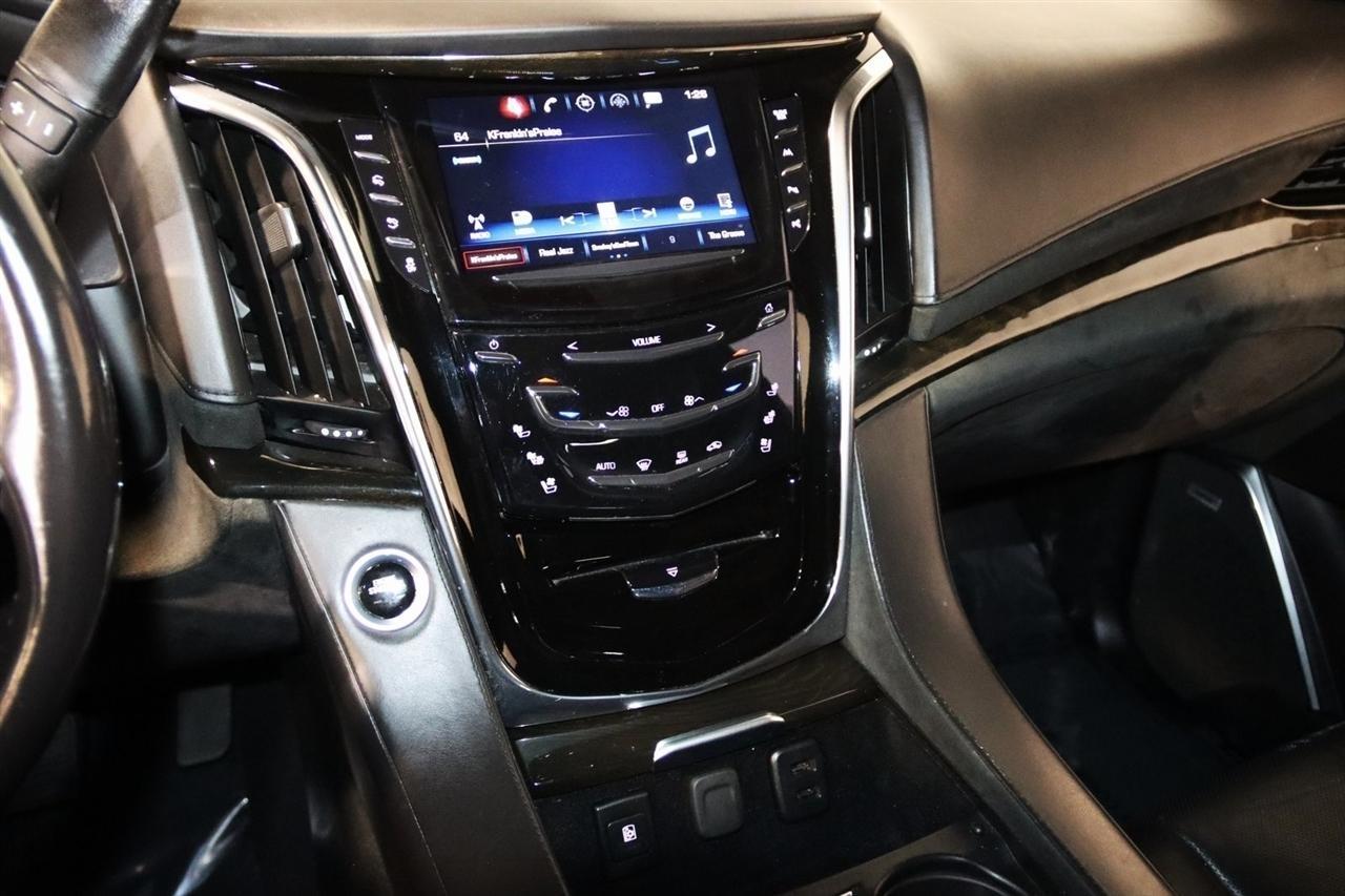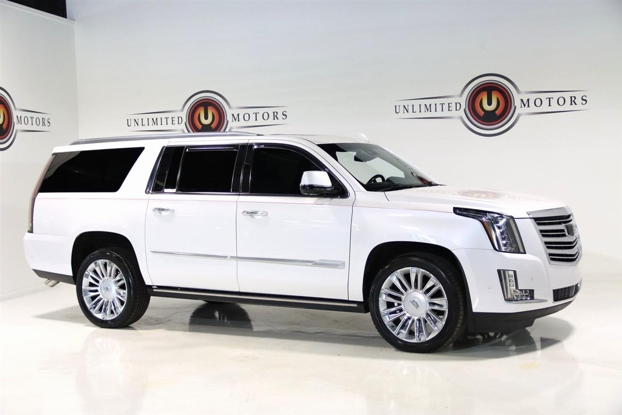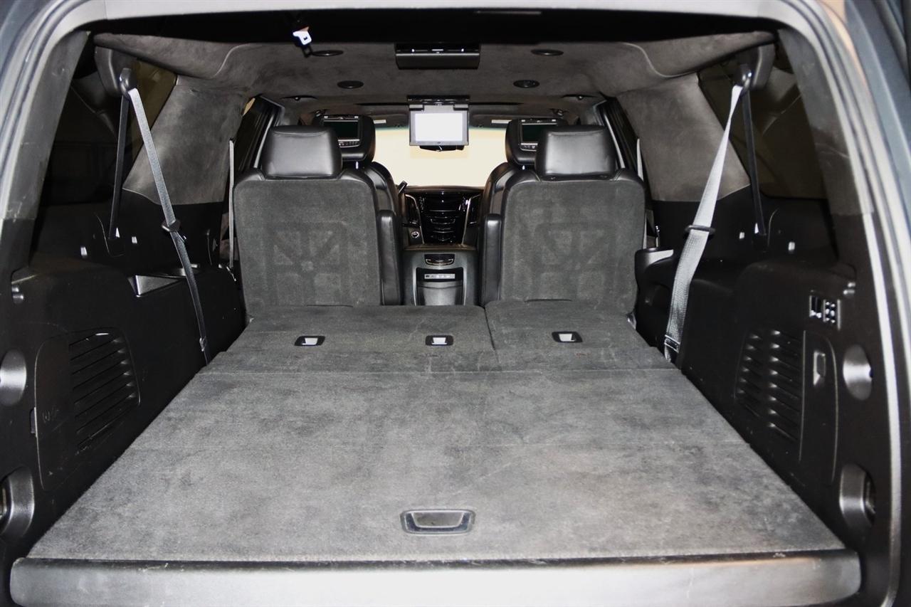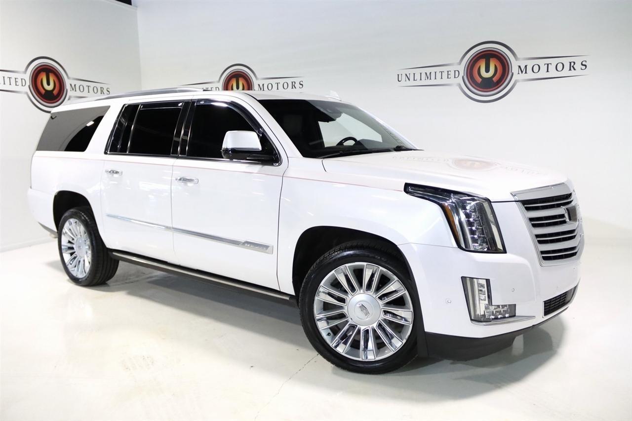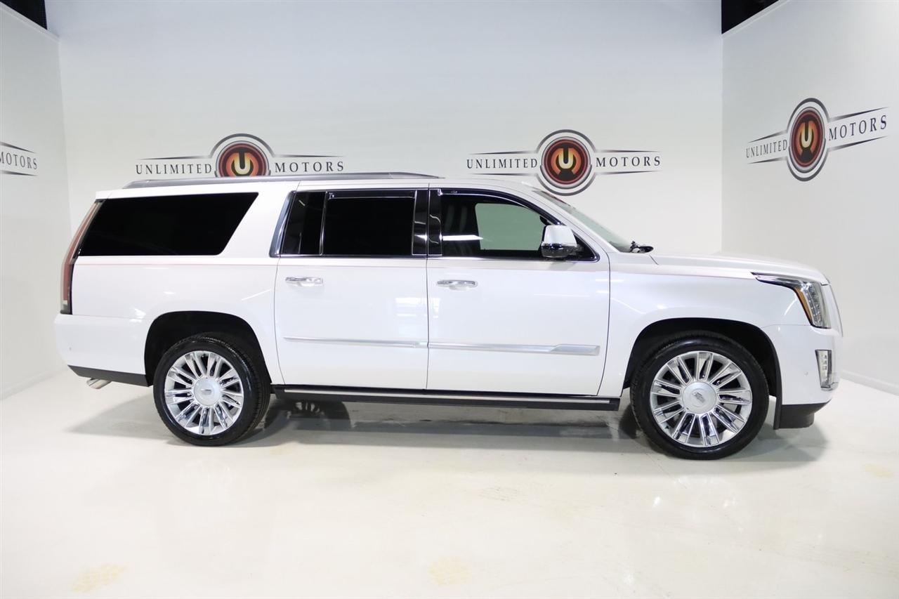 Navigation, Bluetooth, Back Up Camera, Entertainment, Sun/Moon Roof, 3rd Row, Towing, Heated Seats, Touch Screen, 16 Speakers, 3.23 Axle Ratio, 3rd Row DVD Screen, 3rd row seats: split-bench, 4-Wheel Disc Brakes, A/V remote, ABS brakes, Adaptive Full-Speed Range Cruise Control, Adaptive suspension, Adjustable pedals, Air Conditioning, All-Weather Floor Liner (LPO), Alloy wheels, AM/FM radio: SiriusXM, Apple CarPlay/Android Auto, Auto High-beam Headlights, Auto tilt-away steering wheel, Auto-dimming door mirrors, Auto-leveling suspension, Automatic Safety Belt Tightening, Automatic temperature control, Bodyside moldings, Bose Centerpoint 16 Speaker Surround Sound System, Brake assist, Bumpers: body-color, CD player, Compass, Cooled Console w/Covered Storage, Delay-off headlights, Digital Headphones (LPO), Driver Assist Package, Driver door bin, Driver vanity mirror, Dual DVD Screens, Dual front impact airbags, Dual front side impact airbags, DVD-Audio, Electronic Powered Parking Brake, Electronic Stability Control, Emergency communication system: OnStar and Cadillac connected services capable, Exterior Parking Camera Rear, Forward Collision Alert, Forward/Reverse Automatic Braking, Front anti-roll bar, Front Bucket Seats, Front Center Armrest w/Storage, Front Cornering Lamps, Front dual zone A/C, Front reading lights, Front wheel independent suspension, Fully automatic headlights, Garage door transmitter, Genuine wood dashboard insert, HD Radio, Headphones, Heads-Up Display, Heated & Cooled Front Seats, Heated door mirrors, Heated front seats, Heated rear seats, Heated steering wheel, Highway Safety Kit, Illuminated Door Handles, Illuminated entry, Inclination Sensor, IntelliBeam Automatic High Beam On/Off, Lane Change Alert w/Side Blind Zone Alert, Lane Keep Assist w/Lane Departure Warning, Leather Shift Knob, Leather steering wheel, Leather Wrapped IP/Console/Door, Low tire pressure warning, Magnetic Ride Control Suspension, Memory seat, Microfiber Sueded Headliner, Navigation System, Occupant sensing airbag, Outside temperature display, Overhead airbag, Overhead console, Panic alarm, Passenger door bin, Passenger vanity mirror, Pedal memory, Platinum Package, Platinum Sill Plates, Polished Exhaust Tip, Power Configurable Second Row Bucket Seats, Power door mirrors, Power driver seat, Power Liftgate, Power moonroof, Power passenger seat, Power steering, Power Tilt-Sliding Sunroof w/Express-Open/Close, Power windows, Preferred Equipment Group 1SD, Premium Floor Mats, Radio data system, Radio: AM/FM Cadillac User Experience w/Nav, Rain sensing wipers, Rear air conditioning, Rear anti-roll bar, Rear audio controls, Rear Camera Mirror, Rear Camera Washer, Rear Cross-Traffic Alert, Rear reading lights, Rear Seat Entertainment System, Rear window defroster, Rear window wiper, Reconfigurable 4-Color Head-Up Display, Remote keyless entry, Roof rack: rails only, Safety Alert Seat, Security system, Semi-Aniline Leather Seating Surfaces, SiriusXM NavTraffic, SiriusXM Satellite Radio, Speed control, Split folding rear seat, Spoiler, Steering wheel memory, Steering wheel mounted audio controls, Sumi Black Tamo Ash Unique Exotic Wood, Tachometer, Telescoping steering wheel, Theft-Deterrent Alarm System, Theft-Deterrent Package, Tilt steering wheel, Traction control, Trip computer, Turn signal indicator mirrors, Unique Grille Design, VAC Power 17 Disc Brakes w/Adaptive Cruise Control, Variably intermittent wipers, Vehicle Interior Movement Sensor, Ventilated front seats, Wheels: 22 x 9 Premium Painted w/Chrome Inserts. Odometer is 9506 miles below market average! Priced below KBB Fair Purchase Price!2018 Crystal White Tricoat Cadillac 4D Sport Utility Escalade ESV Platinum Edition 4WD 10-Speed Automatic with Overdrive 6.2L Variable Valve Timing V8 SIDIVisit our website www.iumotors.com to view 100s of newer vehicles, more pictures and info, or to apply for financing. Rates are incredibly low for approved credit. We of