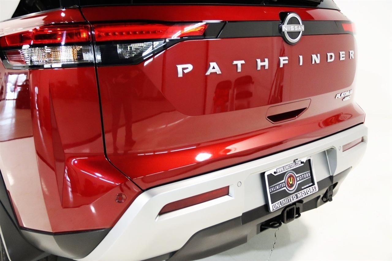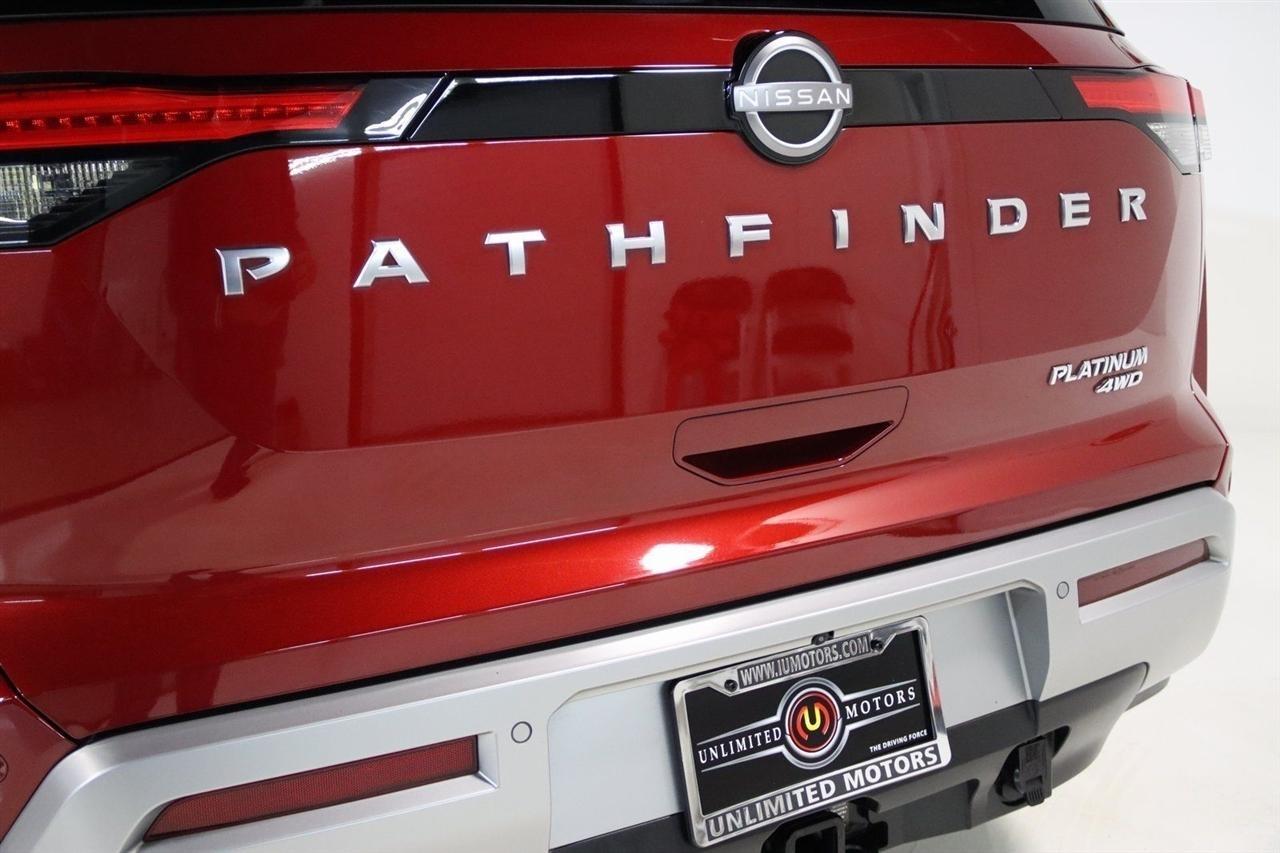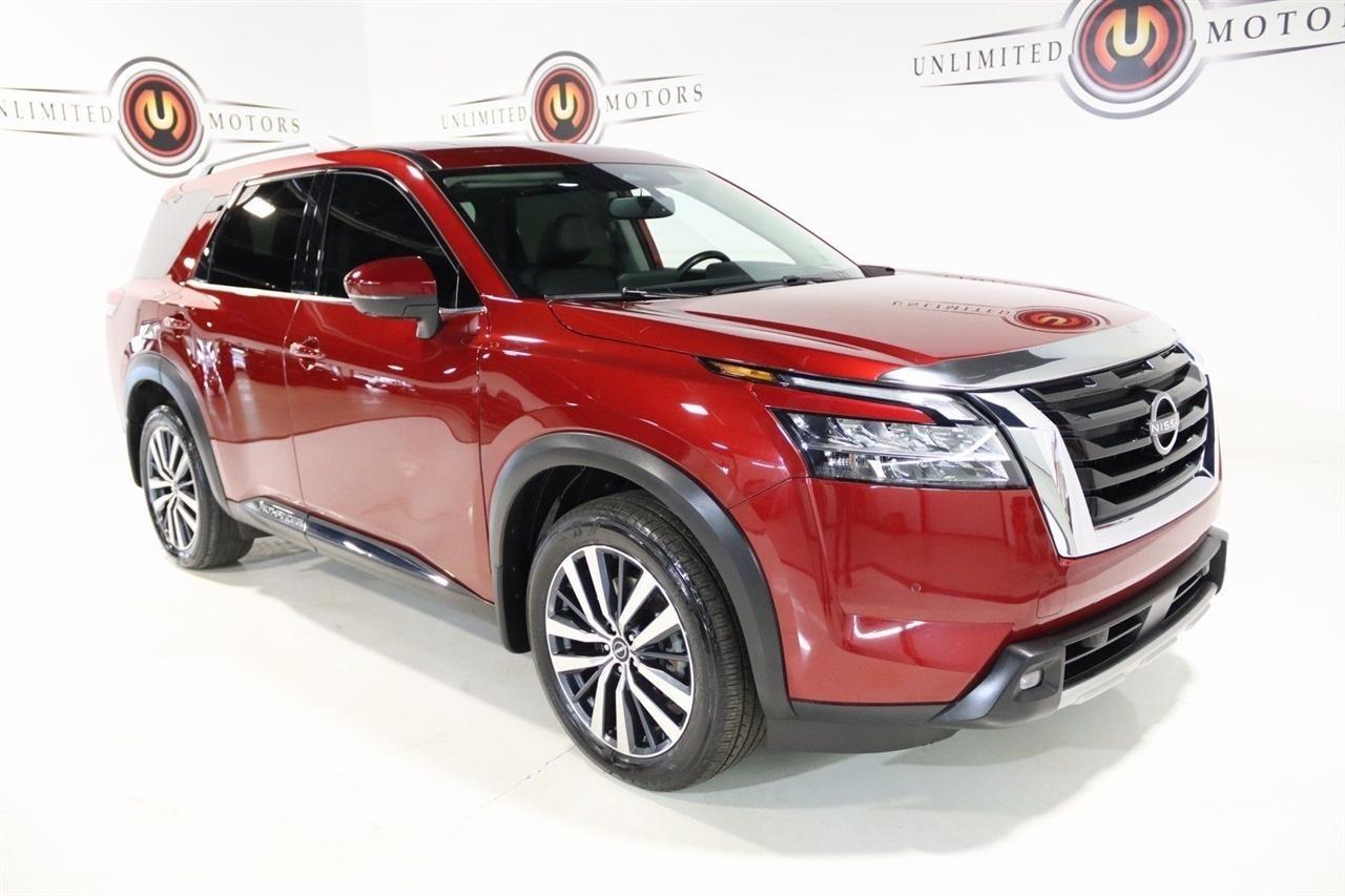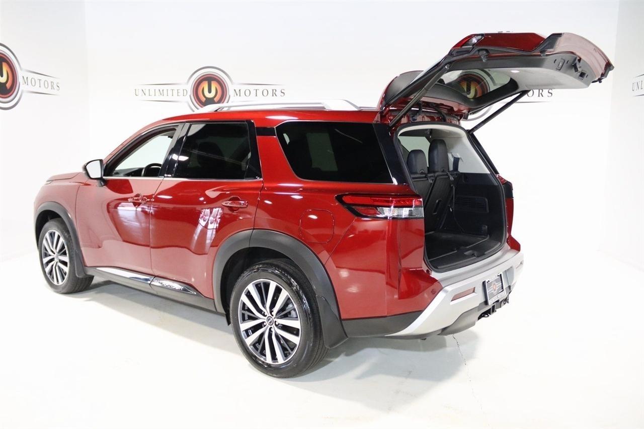 Navigation, Bluetooth, Back Up Camera, Sun/Moon Roof, 3rd Row, Heated Seats, Touch Screen, 13 Speakers, 3rd row seats: bench, 4-Wheel Disc Brakes, ABS brakes, Air Conditioning, Alloy wheels, AM/FM radio: SiriusXM, Auto High-beam Headlights, Auto tilt-away steering wheel, Auto-dimming Rear-View mirror, Automatic temperature control, Axle Ratio: TBD, Black Splash Guards (Set of 4), Bodyside moldings, Bose Premium Audio System, Brake assist, Bumpers: body-color, Captain's Chairs Carpeted Floor Mats (Set of 4), Cargo Area Protector, Cargo Net, Cargo Package, Climate Controlled Front Bucket Seats, Delay-off headlights, Driver door bin, Driver vanity mirror, Dual front impact airbags, Dual front side impact airbags, Electronic Stability Control, Emergency communication system: NissanConnect Services, Exterior Parking Camera Rear, First Aid Kit, Four wheel independent suspension, Front anti-roll bar, Front Bucket Seats, Front Center Armrest, Front dual zone A/C, Front fog lights, Front reading lights, Fully automatic headlights, Garage door transmitter: HomeLink, Heads-Up Display, Heated door mirrors, Heated front seats, Heated rear seats, Heated steering wheel, Illuminated entry, Knee airbag, Leather steering wheel, Low tire pressure warning, Memory seat, Navigation System, Navigation system: NissanConnect Navigation, NissanConnect w/Navigation & Services, Occupant sensing airbag, Outside temperature display, Overhead airbag, Overhead console, Panic alarm, Passenger door bin, Passenger vanity mirror, Power door mirrors, Power driver seat, Power Liftgate, Power moonroof, Power passenger seat, Power steering, Power windows, Radio data system, Radio: AM/FM Audio System, Rain sensing wipers, Rear air conditioning, Rear anti-roll bar, Rear reading lights, Rear side impact airbag, Rear window defroster, Rear window wiper, Reclining 3rd row seat, Remote keyless entry, Security system, Semi-Aniline Leather Seating Surfaces, Speed control, Speed-sensing steering, Speed-Sensitive Wipers, Split folding rear seat, Spoiler, Steering wheel memory, Steering wheel mounted audio controls, Tachometer, Telescoping steering wheel, TFT Meter Delete, Tilt steering wheel, Traction control, Trip computer, Turn signal indicator mirrors, Variably intermittent wipers, Ventilated front seats, Wheels: 20 Alloy w/Unique Finish. Clean CARFAX. Odometer is 26902 miles below market average!2022 Scarlet Ember Tintcoat Nissan 4D Sport Utility Pathfinder Platinum 4WD 9-Speed Automatic V6Visit our website www.iumotors.com to view 100s of newer vehicles, more pictures and info, or to apply for financing. Rates are incredibly low for approved credit. We offer extended warranties, protection packages, and insurance. We assure you the best experience at any of our 4 locations and unbeatable prices and quality. At Unlimited Motors we believe in MARKET VALUE PRICING. We use real-time Internet price comparisons to constantly adjust prices to provide ALL BUYERS The BEST PRICE possible. We do not mark them up, to mark them down! Our entire team is committed to helping you buy a car the way we would want to buy a car! We utilize state-of-the-art technology to constantly monitor pricing trends to offer our shoppers the best competitive pricing, value, and experience. We sell and service all makes and models of Pre-owned / Used Vehicles Used Cars, Used Trucks, Used Sport Utility, Lamborghini, Ferrari, Bentley, Rolls Royce, McLaren, Maserati, Ford, Chevrolet/Chevy, Honda, Toyota, Porsche, Land Rover, Jaguar, INFINITI, Audi, Nissan, Mazda, Hyundai, Chrysler, Jeep, Dodge, Ram, SRT, Mitsubishi, Lexus, Kia, Volkswagen, Mini, BMW, Mercedes, Fiat, Volvo, GMC, Cadillac, Lincoln as well as other brands. Proudly serving these areas of Indianapolis, Fishers, Carmel, Noblesville, Greenwood, Avon, Plainfield, Zionsville, & Brownsburg, Indiana, Midwest. We also serve the entire nation with our seamless and easy online purchasing process, and offer shipping nationwide.