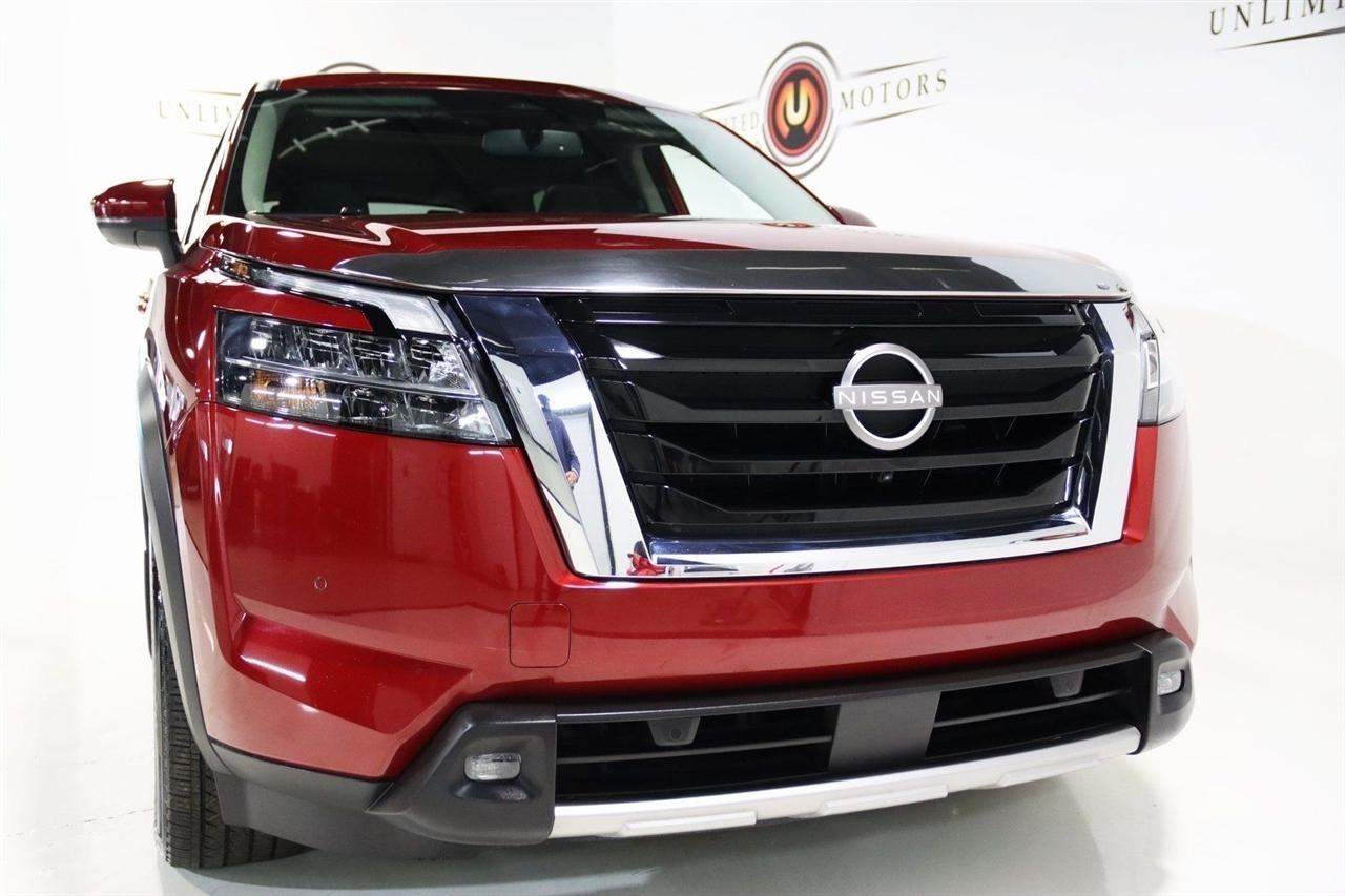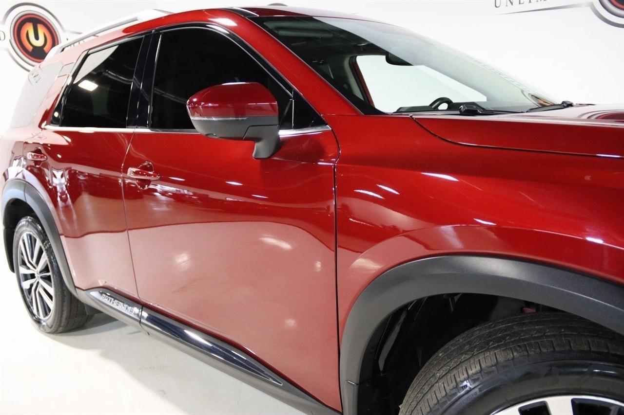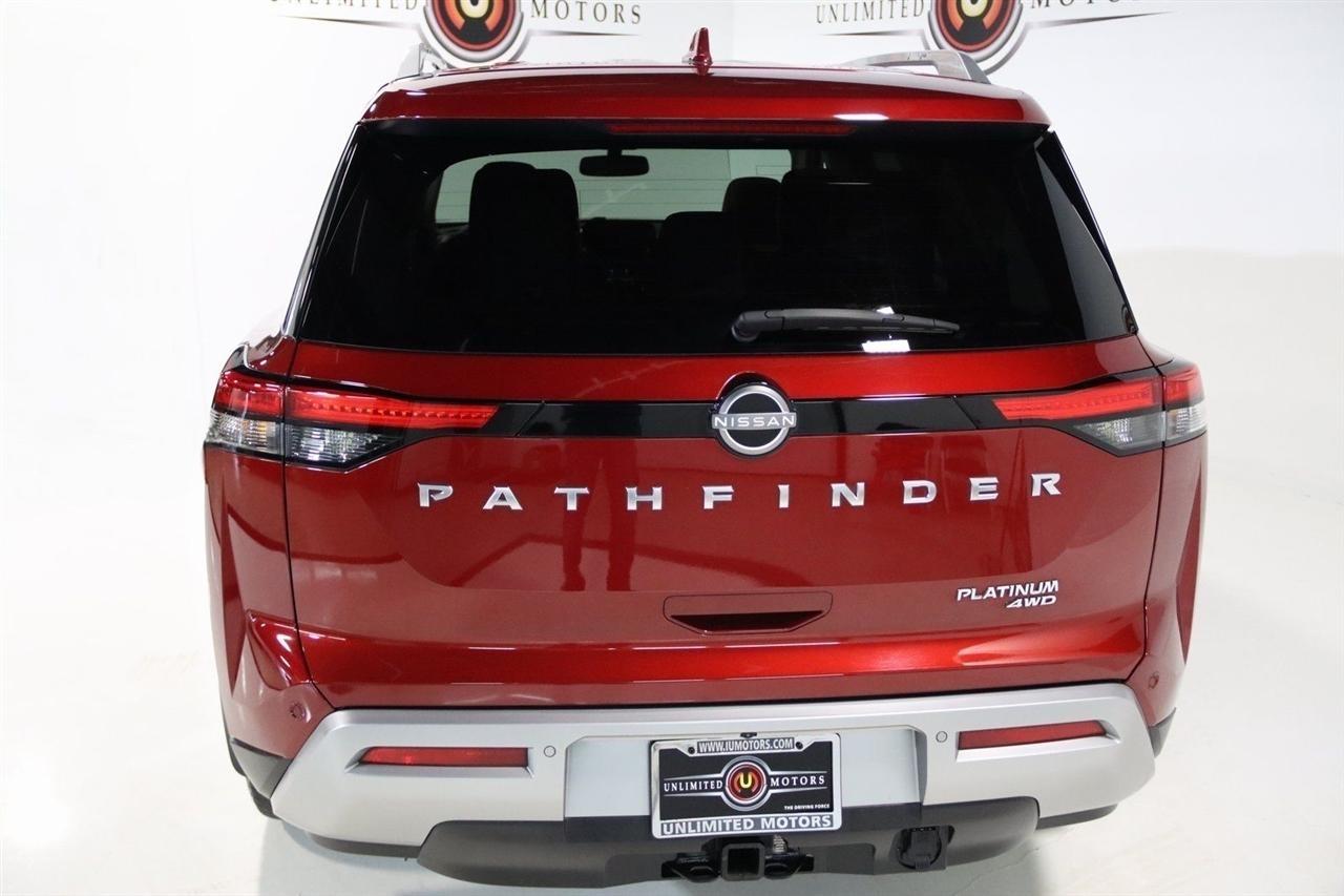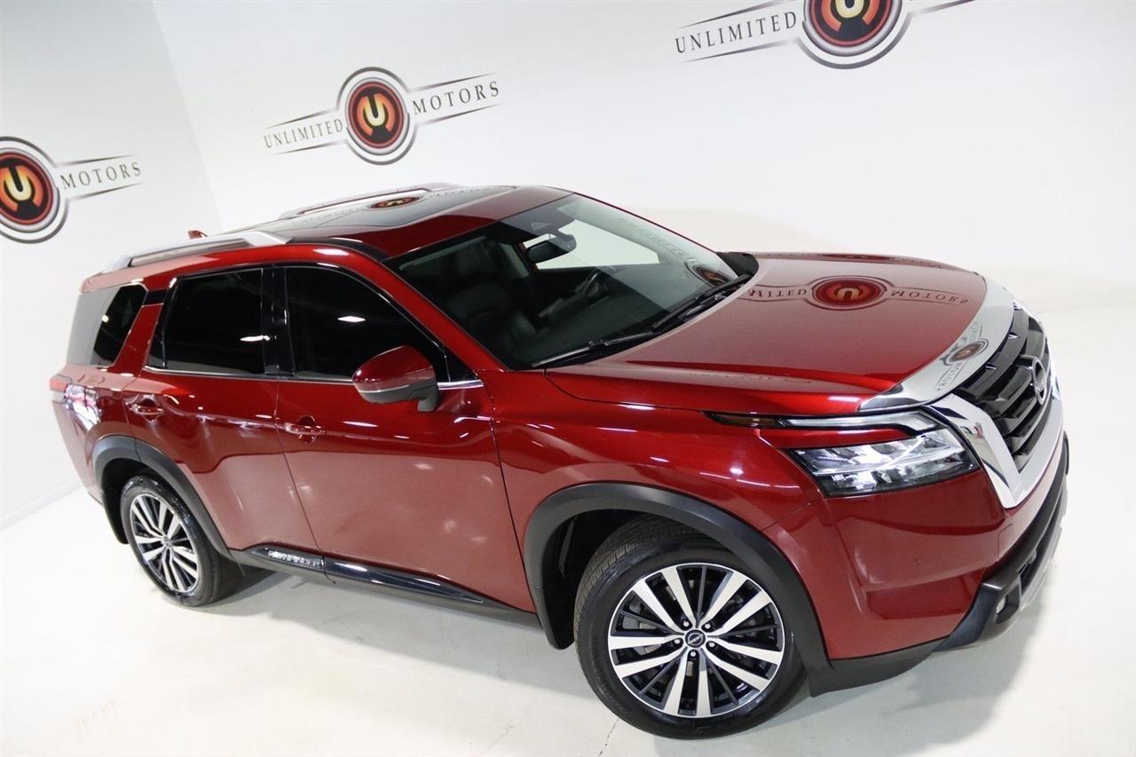 Navigation, Bluetooth, Back Up Camera, Sun/Moon Roof, 3rd Row, Heated Seats, Touch Screen, 13 Speakers, 3rd row seats: bench, 4-Wheel Disc Brakes, ABS brakes, Air Conditioning, Alloy wheels, AM/FM radio: SiriusXM, Auto High-beam Headlights, Auto tilt-away steering wheel, Auto-dimming Rear-View mirror, Automatic temperature control, Axle Ratio: TBD, Black Splash Guards (Set of 4), Bodyside moldings, Bose Premium Audio System, Brake assist, Bumpers: body-color, Captain's Chairs Carpeted Floor Mats (Set of 4), Cargo Area Protector, Cargo Net, Cargo Package, Climate Controlled Front Bucket Seats, Delay-off headlights, Driver door bin, Driver vanity mirror, Dual front impact airbags, Dual front side impact airbags, Electronic Stability Control, Emergency communication system: NissanConnect Services, Exterior Parking Camera Rear, First Aid Kit, Four wheel independent suspension, Front anti-roll bar, Front Bucket Seats, Front Center Armrest, Front dual zone A/C, Front fog lights, Front reading lights, Fully automatic headlights, Garage door transmitter: HomeLink, Heads-Up Display, Heated door mirrors, Heated front seats, Heated rear seats, Heated steering wheel, Illuminated entry, Knee airbag, Leather steering wheel, Low tire pressure warning, Memory seat, Navigation System, Navigation system: NissanConnect Navigation, NissanConnect w/Navigation & Services, Occupant sensing airbag, Outside temperature display, Overhead airbag, Overhead console, Panic alarm, Passenger door bin, Passenger vanity mirror, Power door mirrors, Power driver seat, Power Liftgate, Power moonroof, Power passenger seat, Power steering, Power windows, Radio data system, Radio: AM/FM Audio System, Rain sensing wipers, Rear air conditioning, Rear anti-roll bar, Rear reading lights, Rear side impact airbag, Rear window defroster, Rear window wiper, Reclining 3rd row seat, Remote keyless entry, Security system, Semi-Aniline Leather Seating Surfaces, Speed control, Speed-sensing steering, Speed-Sensitive Wipers, Split folding rear seat, Spoiler, Steering wheel memory, Steering wheel mounted audio controls, Tachometer, Telescoping steering wheel, TFT Meter Delete, Tilt steering wheel, Traction control, Trip computer, Turn signal indicator mirrors, Variably intermittent wipers, Ventilated front seats, Wheels: 20 Alloy w/Unique Finish. Clean CARFAX. Odometer is 26902 miles below market average!2022 Scarlet Ember Tintcoat Nissan 4D Sport Utility Pathfinder Platinum 4WD 9-Speed Automatic V6Visit our website www.iumotors.com to view 100s of newer vehicles, more pictures and info, or to apply for financing. Rates are incredibly low for approved credit. We offer extended warranties, protection packages, and insurance. We assure you the best experience at any of our 4 locations and unbeatable prices and quality. At Unlimited Motors we believe in MARKET VALUE PRICING. We use real-time Internet price comparisons to constantly adjust prices to provide ALL BUYERS The BEST PRICE possible. We do not mark them up, to mark them down! Our entire team is committed to helping you buy a car the way we would want to buy a car! We utilize state-of-the-art technology to constantly monitor pricing trends to offer our shoppers the best competitive pricing, value, and experience. We sell and service all makes and models of Pre-owned / Used Vehicles Used Cars, Used Trucks, Used Sport Utility, Lamborghini, Ferrari, Bentley, Rolls Royce, McLaren, Maserati, Ford, Chevrolet/Chevy, Honda, Toyota, Porsche, Land Rover, Jaguar, INFINITI, Audi, Nissan, Mazda, Hyundai, Chrysler, Jeep, Dodge, Ram, SRT, Mitsubishi, Lexus, Kia, Volkswagen, Mini, BMW, Mercedes, Fiat, Volvo, GMC, Cadillac, Lincoln as well as other brands. Proudly serving these areas of Indianapolis, Fishers, Carmel, Noblesville, Greenwood, Avon, Plainfield, Zionsville, & Brownsburg, Indiana, Midwest. We also serve the entire nation with our seamless and easy online purchasing process, and offer shipping nationwide.