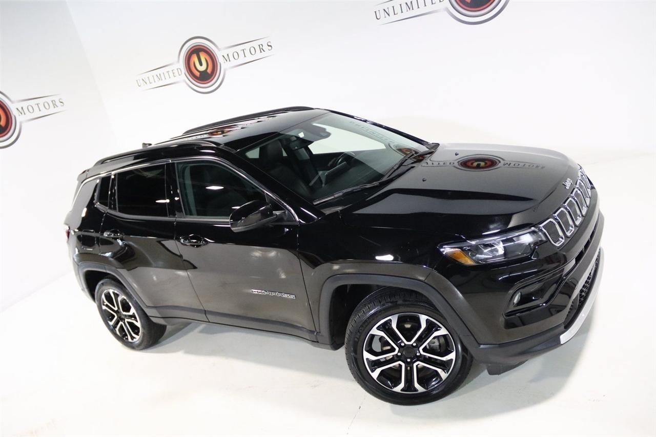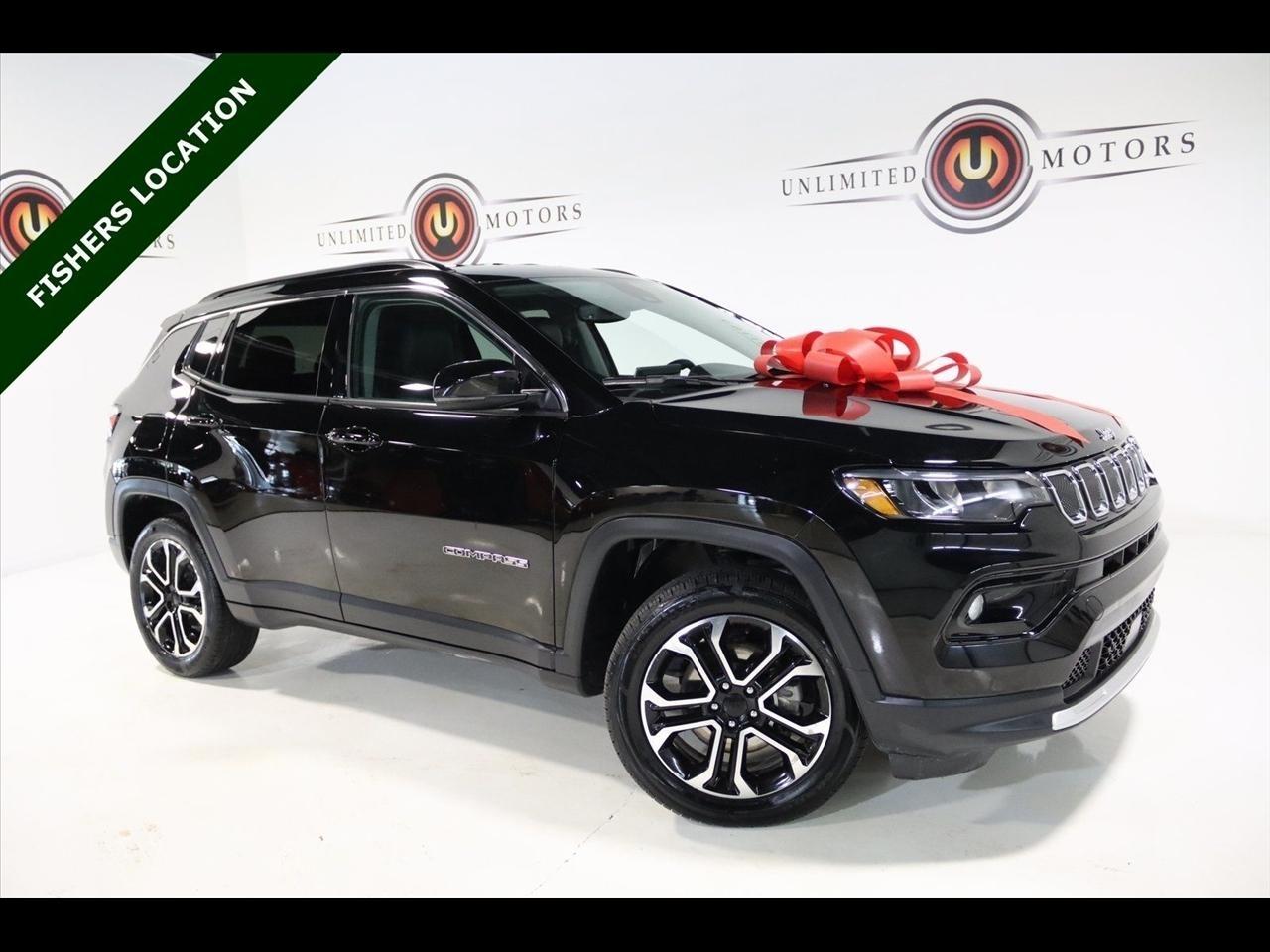 Bluetooth, Back Up Camera, Heated Seats, Touch Screen, 10.1 Touchscreen Display, 3.73 Axle Ratio, 4-Wheel Disc Brakes, 6 Speakers, ABS brakes, Air Conditioning, Alloy wheels, AM/FM radio: SiriusXM, Anti-whiplash front head restraints, Auto High-beam Headlights, Auto-dimming Rear-View mirror, Automatic temperature control, Brake assist, Bumpers: body-color, Compass, Delay-off headlights, Disassociated Touchscreen Display, Driver door bin, Driver vanity mirror, Dual front impact airbags, Dual front side impact airbags, Electronic Stability Control, Emergency communication system: SiriusXM Guardian, Four wheel independent suspension, Front anti-roll bar, Front Bucket Seats, Front Center Armrest w/Storage, Front dual zone A/C, Front fog lights, Front reading lights, Fully automatic headlights, Global Telematics Box Module (TBM), Gloss Black Exterior Mirrors, Heated door mirrors, Heated front seats, Heated steering wheel, Illuminated entry, Knee airbag, Leather Shift Knob, Leather Trimmed Bucket Seats, Low tire pressure warning, Occupant sensing airbag, Outside temperature display, Overhead airbag, Overhead console, Panic alarm, ParkView Rear Back-Up Camera, Passenger door bin, Passenger vanity mirror, Power door mirrors, Power driver seat, Power steering, Power windows, Quick Order Package 2GG, Radio: Uconnect 5 w/10.1 Display, Rain sensing wipers, Rear anti-roll bar, Rear seat center armrest, Rear window defroster, Rear window wiper, Remote keyless entry, Roof rack: rails only, Security system, Speed control, Split folding rear seat, Spoiler, Steering wheel mounted audio controls, Tachometer, Telescoping steering wheel, Tilt steering wheel, Traction control, Trip computer, Turn signal indicator mirrors, Variably intermittent wipers, Wheels: 18 x 7 Painted Diamond Cut Aluminum. CARFAX One-Owner. 22/30 City/Highway MPG Odometer is 5402 miles below market average! Priced below KBB Fair Purchase Price!2022 Diamond Black Crystal Pearlcoat Jeep 4D Sport Utility Compass Limited 4WD 9-Speed 948TE Automatic 2.4L I4Visit our website www.iumotors.com to view 100s of newer vehicles, more pictures and info, or to apply for financing. Rates are incredibly low for approved credit. We offer extended warranties, protection packages, and insurance. We assure you the best experience at any of our 4 locations and unbeatable prices and quality. At Unlimited Motors we believe in MARKET VALUE PRICING. We use real-time Internet price comparisons to constantly adjust prices to provide ALL BUYERS The BEST PRICE possible. We do not mark them up, to mark them down! Our entire team is committed to helping you buy a car the way we would want to buy a car! We utilize state-of-the-art technology to constantly monitor pricing trends to offer our shoppers the best competitive pricing, value, and experience. We sell and service all makes and models of Pre-owned / Used Vehicles Used Cars, Used Trucks, Used Sport Utility, Lamborghini, Ferrari, Bentley, Rolls Royce, McLaren, Maserati, Ford, Chevrolet/Chevy, Honda, Toyota, Porsche, Land Rover, Jaguar, INFINITI, Audi, Nissan, Mazda, Hyundai, Chrysler, Jeep, Dodge, Ram, SRT, Mitsubishi, Lexus, Kia, Volkswagen, Mini, BMW, Mercedes, Fiat, Volvo, GMC, Cadillac, Lincoln as well as other brands. Proudly serving these areas of Indianapolis, Fishers, Carmel, Noblesville, Greenwood, Avon, Plainfield, Zionsville, & Brownsburg, Indiana, Midwest. We also serve the entire nation with our seamless and easy online purchasing process, and offer shipping nationwide.Advertised prices DO NOT include Sales Tax, Dealer Fees, Title Processing Charges, and Dealer Pre-installed Products.