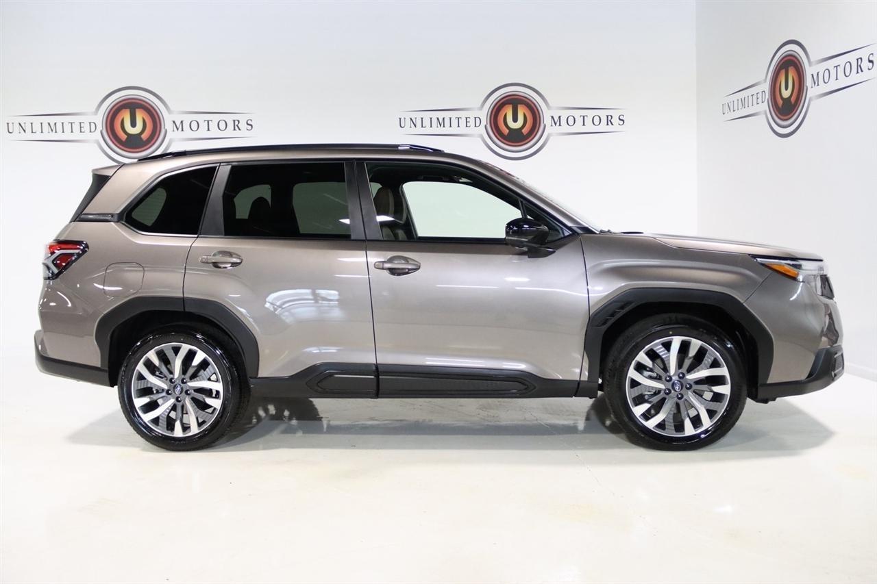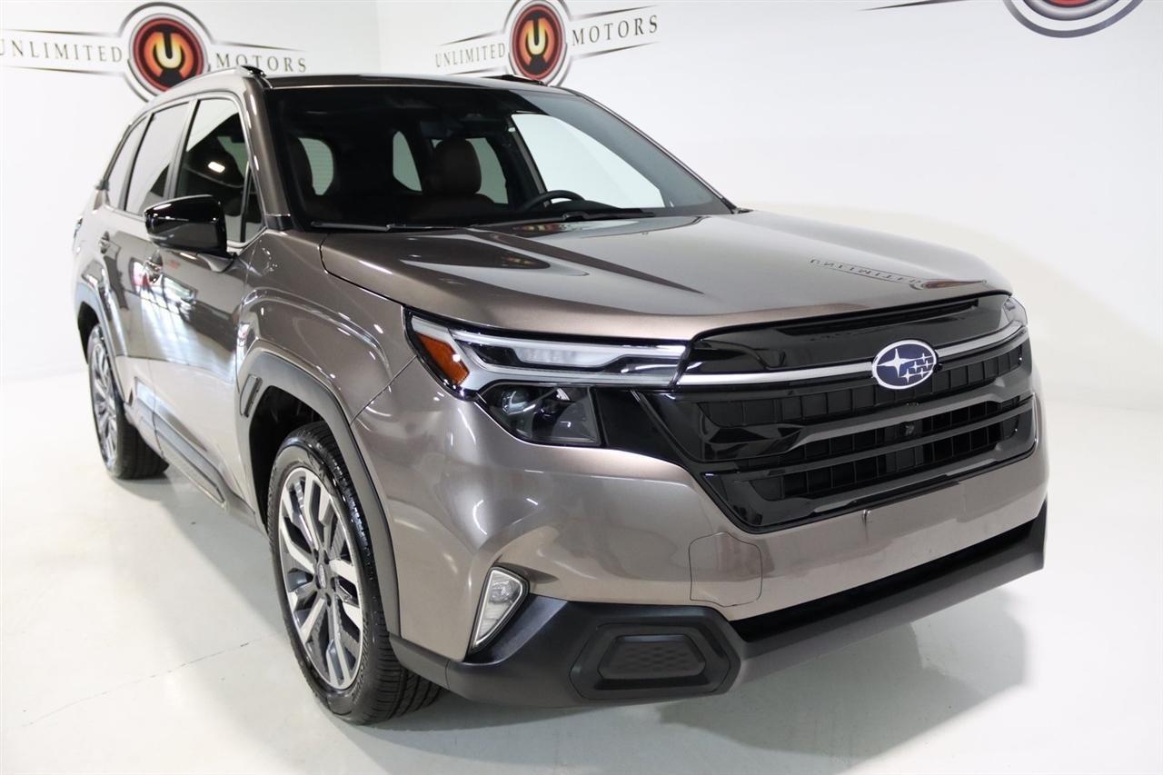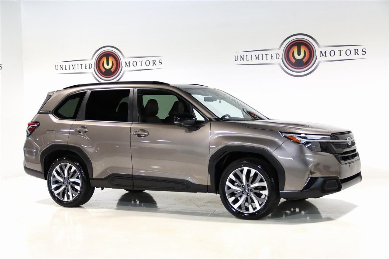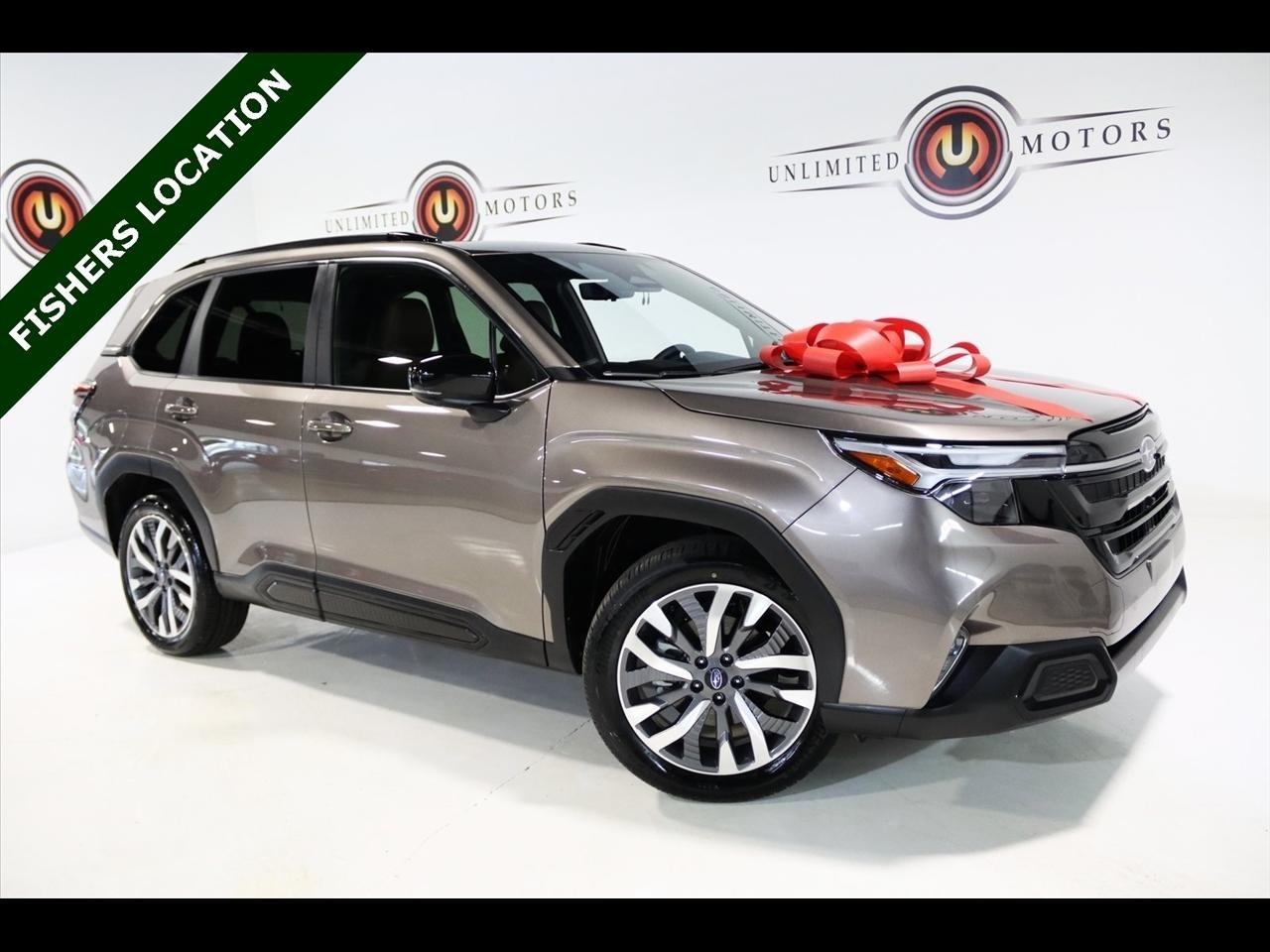 Navigation, Bluetooth, Back Up Camera, Panoramic Roof, Heated Seats, Touch Screen, 11 Speakers, 4-Wheel Disc Brakes, ABS brakes, Air Conditioning, All-Weather Floor Liners, Alloy wheels, AM/FM radio: SiriusXM with 360L, Anti-whiplash front head restraints, Auto High-beam Headlights, Auto-Dimming Exterior Mirror w/Approach Light, Automatic temperature control, Brake assist, Bumpers: body-color, Cargo Tray, Driver door bin, Driver vanity mirror, Dual front impact airbags, Dual front side impact airbags, Electronic Stability Control, Emergency communication system: MySubaru Safety (3-year free trial), Exterior Parking Camera Rear, Four wheel independent suspension, Front anti-roll bar, Front Bucket Seats, Front Center Armrest, Front dual zone A/C, Front fog lights, Front reading lights, Fully automatic headlights, harman/kardon Speakers, Heated & Ventilated Front Bucket Seats, Heated door mirrors, Heated front seats, Heated rear seats, Heated steering wheel, HVAC memory, Illuminated entry, Knee airbag, Leather steering wheel, LED Upgrade, Low tire pressure warning, Memory seat, Navigation System, Occupant sensing airbag, Outside temperature display, Overhead airbag, Overhead console, Panic alarm, Passenger door bin, Passenger vanity mirror, Perforated Leather-Trimmed Upholstery, Power door mirrors, Power driver seat, Power Liftgate, Power moonroof: Panoramic, Power passenger seat, Power steering, Power windows, Radio data system, Radio: Subaru 11.6 Multimedia Navigation System, Rear anti-roll bar, Rear Bumper Cover, Rear seat center armrest, Rear Seatback Protector, Rear window defroster, Rear window wiper, Remote keyless entry, Security system, Speed control, Speed-sensing steering, Split folding rear seat, Spoiler, Standard Model, Steering wheel mounted audio controls, Tachometer, Telescoping steering wheel, Tilt steering wheel, Traction control, Trip computer, Turn signal indicator mirrors, Variably intermittent wipers, Ventilated front seats, Wheels: 19 x 7.5 J Dark Gray Aluminum-Alloy. CARFAX One-Owner. Clean CARFAX. 25/32 City/Highway MPG Odometer is 7261 miles below market average!2025 Bronze Metallic Subaru 4D Sport Utility Forester Touring AWD Lineartronic CVT 2.5L 4-Cylinder DOHC 16VVisit our website www.iumotors.com to view 100s of newer vehicles, more pictures and info, or to apply for financing. Rates are incredibly low for approved credit. We offer extended warranties, protection packages, and insurance. We assure you the best experience at any of our 4 locations and unbeatable prices and quality. At Unlimited Motors we believe in MARKET VALUE PRICING. We use real-time Internet price comparisons to constantly adjust prices to provide ALL BUYERS The BEST PRICE possible. We do not mark them up, to mark them down! Our entire team is committed to helping you buy a car the way we would want to buy a car! We utilize state-of-the-art technology to constantly monitor pricing trends to offer our shoppers the best competitive pricing, value, and experience. We sell and service all makes and models of Pre-owned / Used Vehicles Used Cars, Used Trucks, Used Sport Utility, Lamborghini, Ferrari, Bentley, Rolls Royce, McLaren, Maserati, Ford, Chevrolet/Chevy, Honda, Toyota, Porsche, Land Rover, Jaguar, INFINITI, Audi, Nissan, Mazda, Hyundai, Chrysler, Jeep, Dodge, Ram, SRT, Mitsubishi, Lexus, Kia, Volkswagen, Mini, BMW, Mercedes, Fiat, Volvo, GMC, Cadillac, Lincoln as well as other brands. Proudly serving these areas of Indianapolis, Fishers, Carmel, Noblesville, Greenwood, Avon, Plainfield, Zionsville, & Brownsburg, Indiana, Midwest. We also serve the entire nation with our seamless and easy online purchasing process, and offer shipping nationwide.Advertised prices DO NOT include Sales Tax, Dealer Fees, Title Processing Charges, and Dealer Pre-installed Products.
