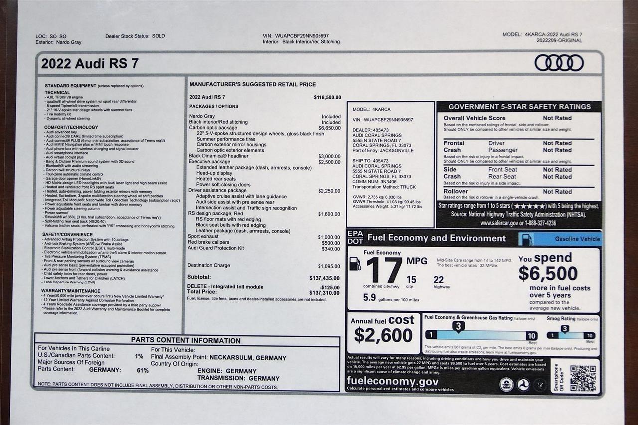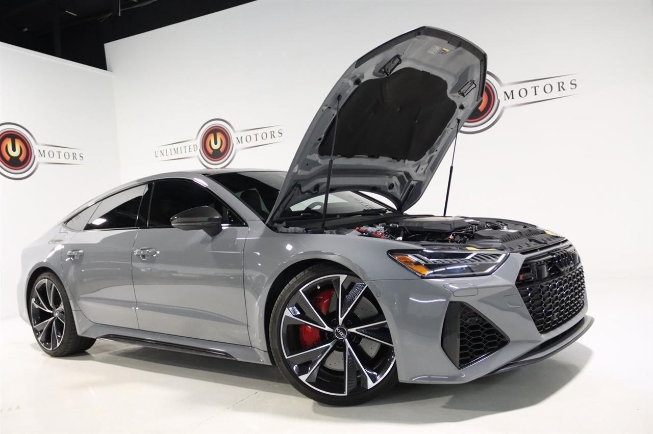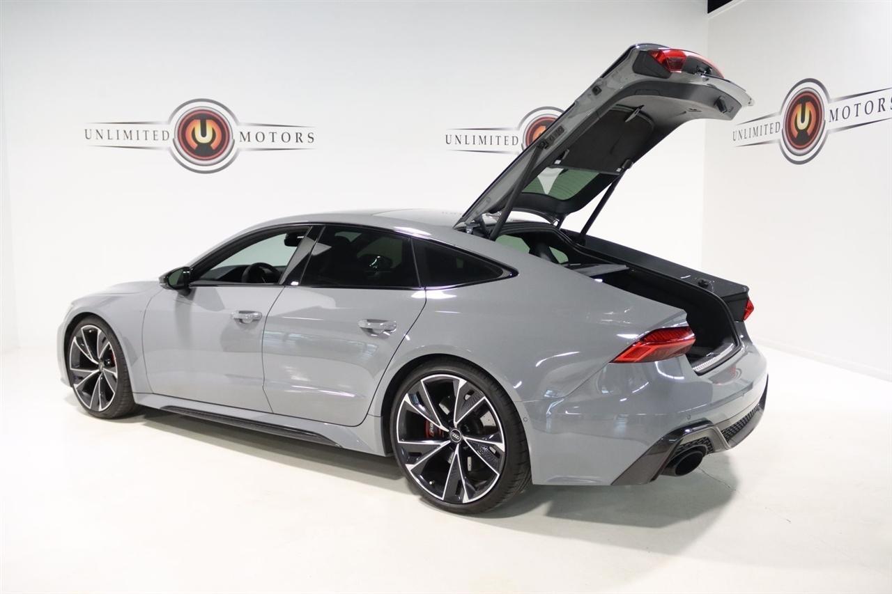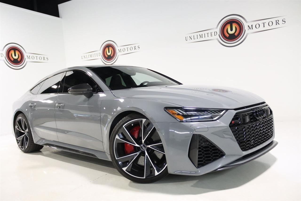 Navigation, Bluetooth, Back Up Camera, Sun/Moon Roof, Heated Seats, Touch Screen, 16 Speakers, 4-Wheel Disc Brakes, ABS brakes, Adaptive Cruise Assist w/Lane Guidance, Adaptive suspension, Air Conditioning, Alcantara Covered Steering Wheel, Alloy wheels, AM/FM radio: SiriusXM, Audi Pre Sense Rear, Audi Side Assist w/Rear Cross Traffic Assist, Auto High-beam Headlights, Auto tilt-away steering wheel, Auto-dimming door mirrors, Auto-dimming Rear-View mirror, Auto-leveling suspension, Automatic temperature control, Black Optic Exterior Pkg, Brake assist, Bumpers: body-color, Carbon Exterior Mirror Housings, Carbon Optic Exterior Package, Carbon Optic Package, Compass, Delay-off headlights, Driver Assistance Package, Driver door bin, Driver vanity mirror, Dual front impact airbags, Dual front side impact airbags, Electronic Stability Control, Emergency communication system: Audi connect CARE, Exterior Parking Camera Rear, Four wheel independent suspension, Front anti-roll bar, Front Bucket Seats, Front Center Armrest, Front dual zone A/C, Front fog lights, Front reading lights, Garage door transmitter: HomeLink, Headlight cleaning, Heated door mirrors, Heated front seats, Heated RS Sport Seats, Heated steering wheel, Illuminated entry, Intersection Assist, Knee airbag, Leather Package, Leather Shift Knob, Low tire pressure warning, Memory seat, Navigation System, Navigation system: MMI Navigation plus, Occupant sensing airbag, Outside temperature display, Overhead airbag, Overhead console, Panic alarm, Passenger door bin, Passenger vanity mirror, Power door mirrors, Power driver seat, Power Liftgate, Power moonroof, Power passenger seat, Power steering, Power windows, Radio data system, Radio: Audi MMI Navigation Plus, Rain sensing wipers, Rear air conditioning, Rear anti-roll bar, Rear dual zone A/C, Rear fog lights, Rear reading lights, Rear seat center armrest, Rear side impact airbag, Rear window defroster, Red Contrast Stitching, Remote keyless entry, RS Design Package - Red, RS Logo Floor Mats w/Red Contrast Stitching, Seat Belts w/Red Edging, Security system, Speed control, Speed-sensing steering, Speed-Sensitive Wipers, Split folding rear seat, Spoiler, Sport steering wheel, Steering wheel memory, Steering wheel mounted audio controls, Tachometer, Telescoping steering wheel, Tilt steering wheel, Traction control, Traffic Sign Recognition, Trip computer, Turn signal indicator mirrors, Valcona Leather Seat Trim, Variably intermittent wipers, Ventilated front seats, Wheels: 22 5-V-Spoke Structured Design Cast Alum. Clean CARFAX. Priced below KBB Fair Purchase Price!2022 Nardo Gray Audi 4D Hatchback RS 7 4.0T quattro quattro 8-Speed Automatic with Tiptronic 4.0L V8 Turbocharged DOHC 32V LEV3-ULEV125 591hpVisit our website www.iumotors.com to view 100s of newer vehicles, more pictures and info, or to apply for financing. Rates are incredibly low for approved credit. We offer extended warranties, protection packages, and insurance. We assure you the best experience at any of our 4 locations and unbeatable prices and quality. At Unlimited Motors we believe in MARKET VALUE PRICING. We use real-time Internet price comparisons to constantly adjust prices to provide ALL BUYERS The BEST PRICE possible. We do not mark them up, to mark them down! Our entire team is committed to helping you buy a car the way we would want to buy a car! We utilize state-of-the-art technology to constantly monitor pricing trends to offer our shoppers the best competitive pricing, value, and experience. We sell and service all makes and models of Pre-owned / Used Vehicles Used Cars, Used Trucks, Used Sport Utility, Lamborghini, Ferrari, Bentley, Rolls Royce, McLaren, Maserati, Ford, Chevrolet/Chevy, Honda, Toyota, Porsche, Land Rover, Jaguar, INFINITI, Audi, Nissan, Mazda, Hyundai, Chrysler, Jeep, Dodge, Ram, SRT, Mitsubishi, Lexus, Kia, Volkswagen, Mini, BMW, Mercedes, Fiat, Volvo, GMC, Cadillac, Lincoln as well as other brands.