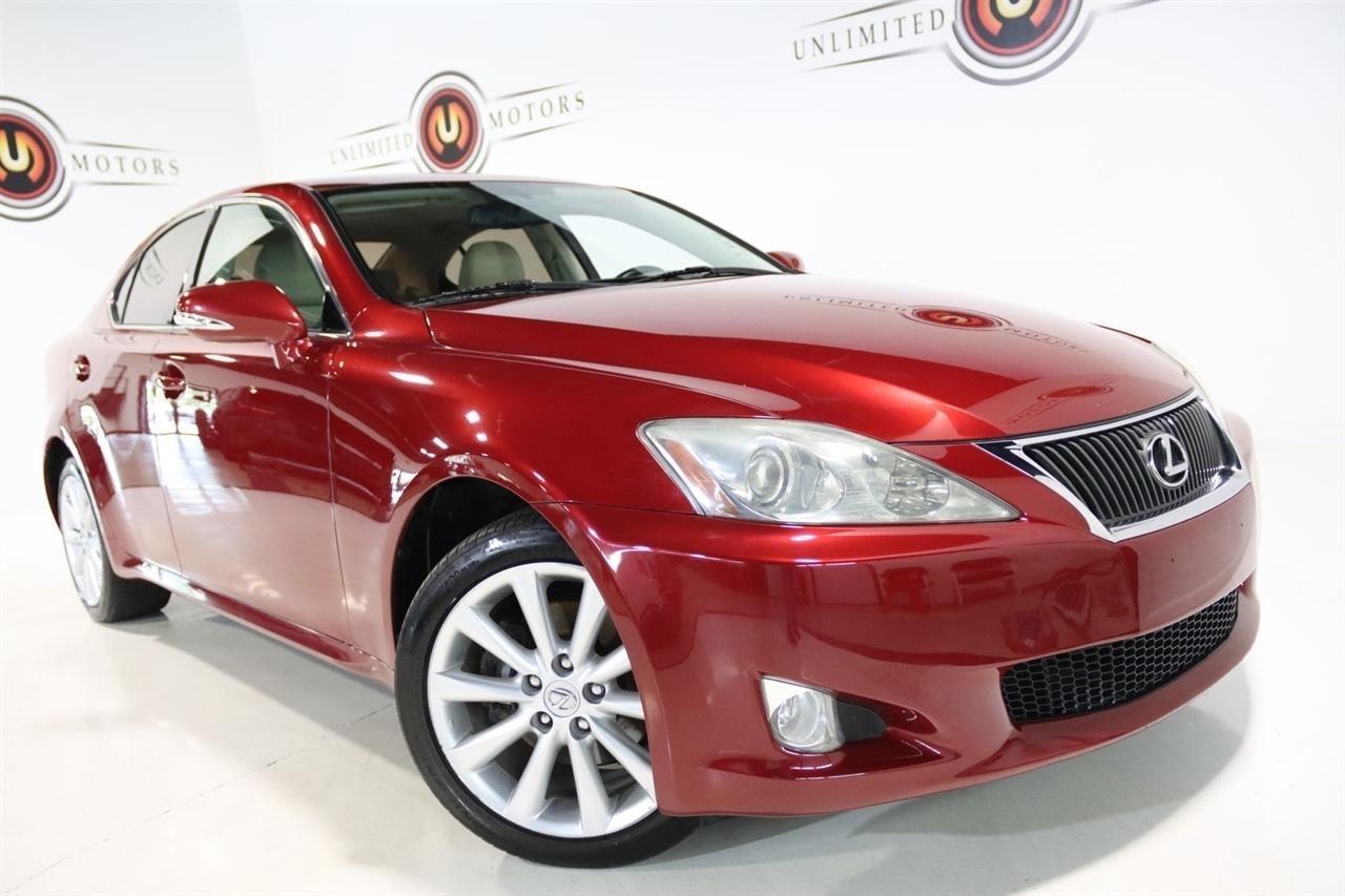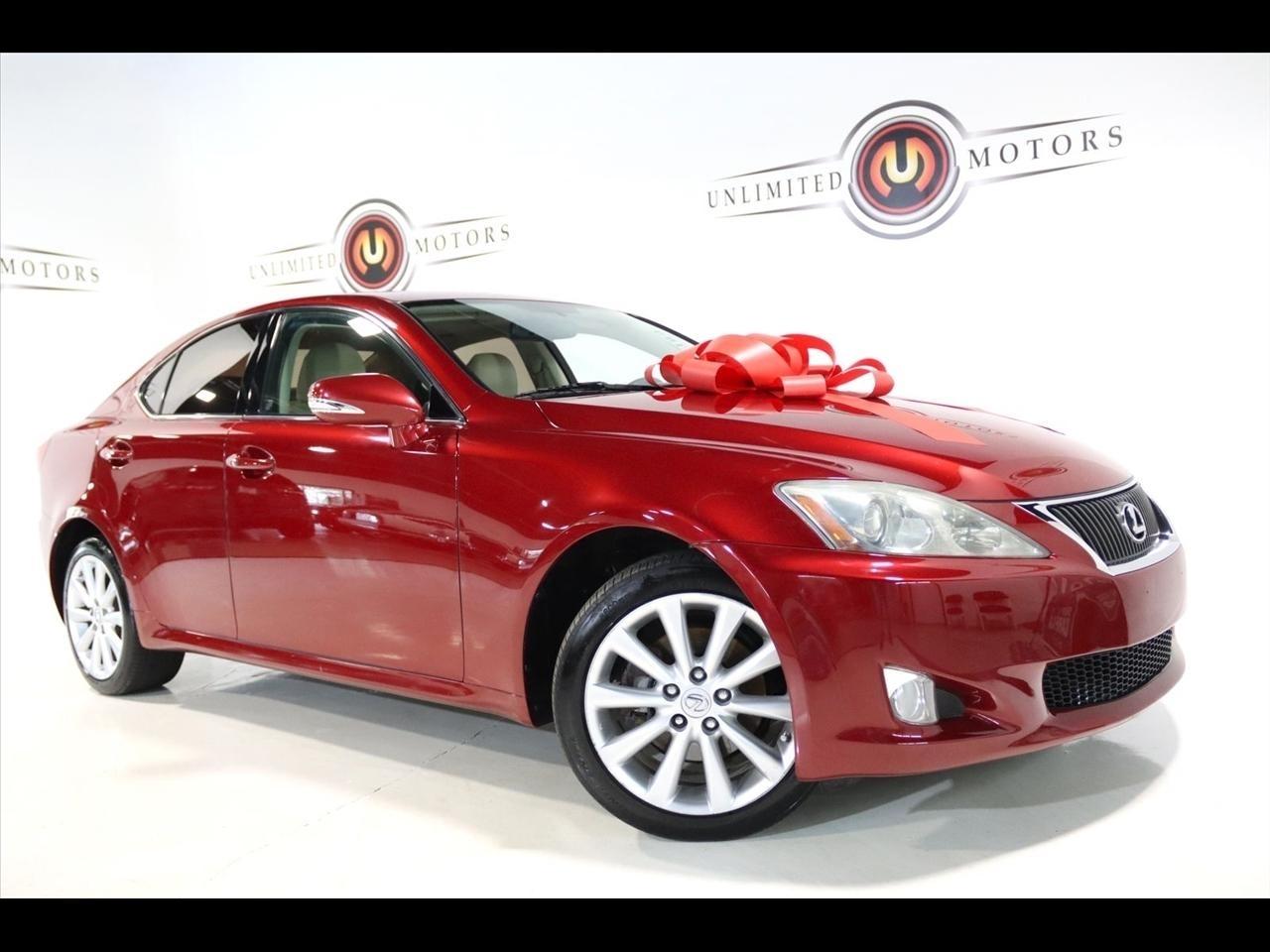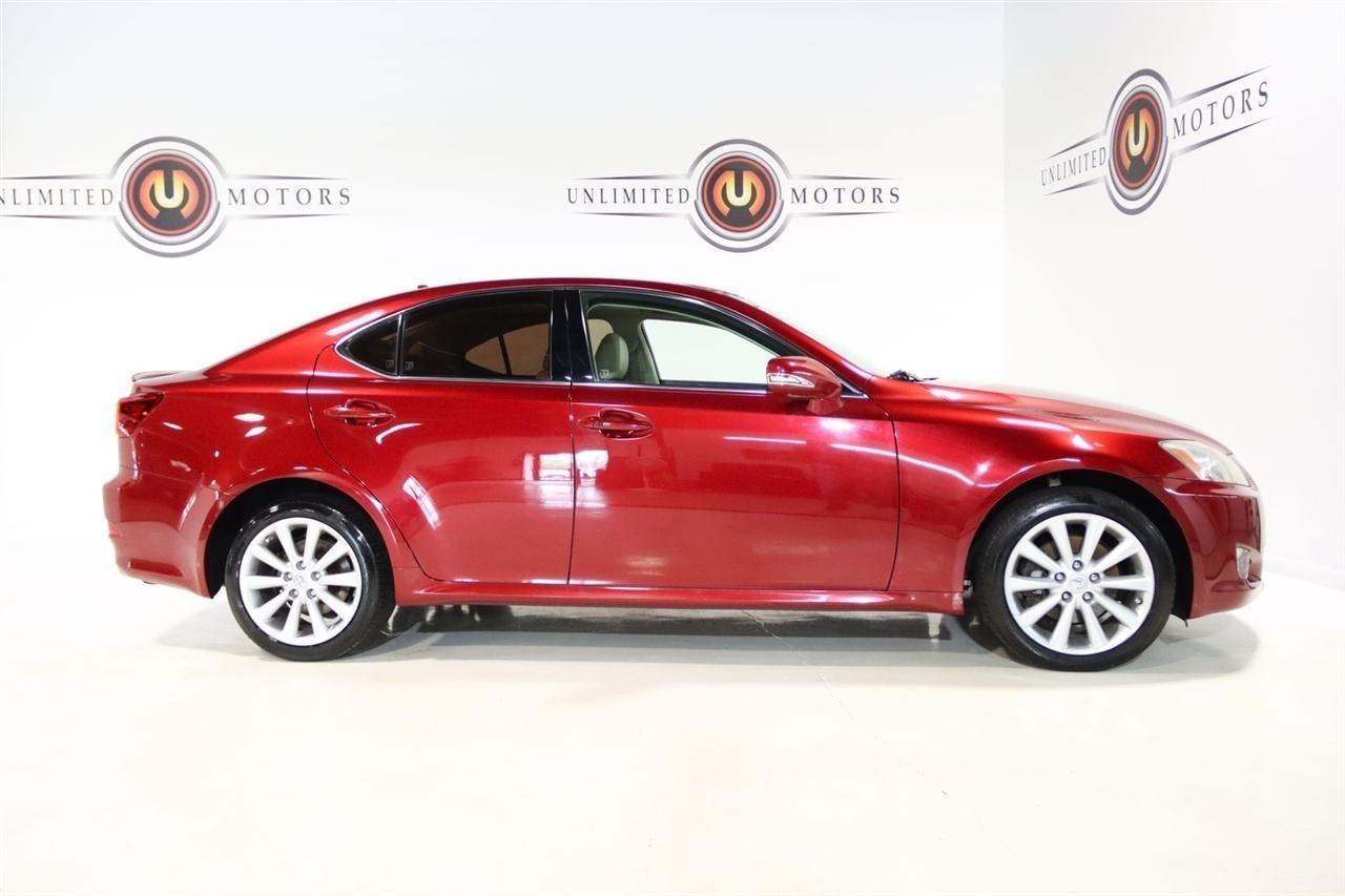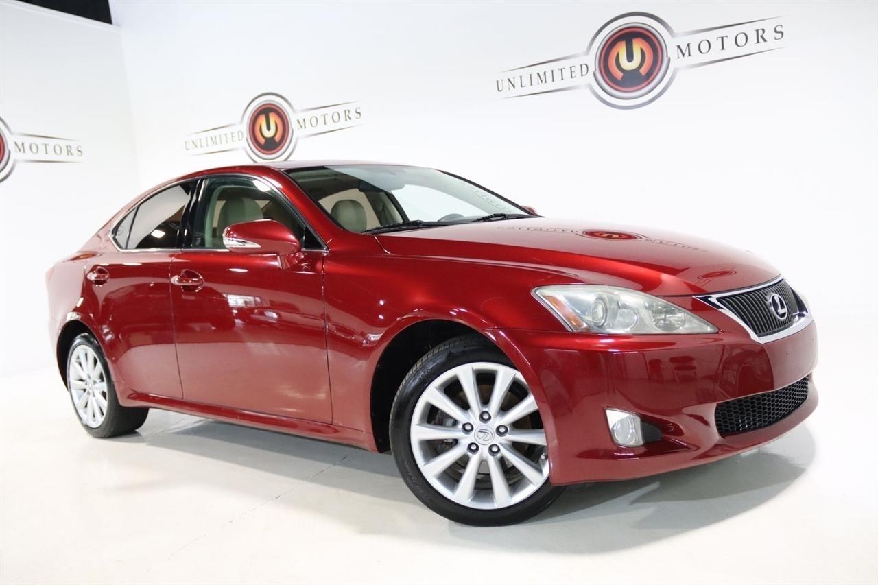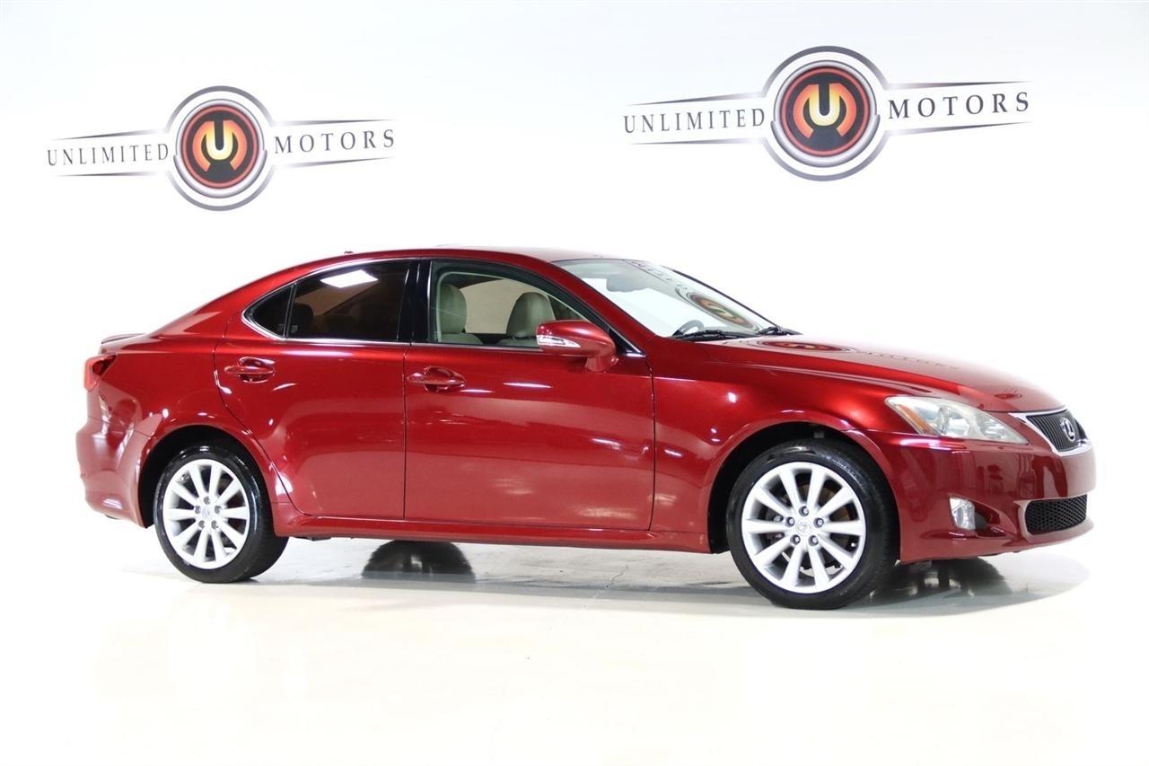 Bluetooth, Back Up Camera, Sun/Moon Roof, Touch Screen, 13 Speakers, 17 x 8 10-Spoke Aluminum Alloy Wheels, 4-Wheel Disc Brakes, ABS brakes, Air Conditioning, Alloy wheels, AM/FM radio, Auto-dimming Rear-View mirror, Automatic temperature control, Bird's Eye Maple Interior Trim, Brake assist, Bumpers: body-color, Cargo Net, CD player, Compass, Delay-off headlights, Driver door bin, Driver vanity mirror, Dual front impact airbags, Dual front side impact airbags, Electronic Stability Control, Four wheel independent suspension, Front anti-roll bar, Front Bucket Seats, Front Center Armrest, Front dual zone A/C, Front fog lights, Front reading lights, Fully automatic headlights, Garage door transmitter: HomeLink(R), Heated door mirrors, Heated Front Bucket Seats, Heated front seats, Illuminated entry, Knee airbag, Leather Seat Trim, Leather steering wheel, Lexus Premium Audio System, Low tire pressure warning, Mark Levinson Premium Audio Package, Navigation System, Navigation System w/Mark Levinson Premium Audio Package, Occupant sensing airbag, Outside temperature display, Overhead airbag, Overhead console, Panic alarm, Passenger door bin, Passenger vanity mirror, Perforated Leather Seat Trim, Power door mirrors, Power driver seat, Power moonroof, Power passenger seat, Power steering, Power windows, Preferred Accessory Package, Preferred Accessory Package w/Z1, Premium Package, Radio data system, Rear anti-roll bar, Rear Bumper Applique, Rear reading lights, Rear seat center armrest, Rear window defroster, Remote keyless entry, Security system, Speed control, Speed-sensing steering, Speed-Sensitive Wipers, Steering wheel mounted audio controls, Tachometer, Telescoping steering wheel, Tilt steering wheel, Traction control, Trip computer, Trunk Mat, Turn signal indicator mirrors, Variably intermittent wipers, Wheel Locks. 20/26 City/Highway MPG Odometer is 5110 miles below market average!2009 Matador Red Mica Lexus 4D Sedan IS 250 AWD 6-Speed Automatic Electronic with ECT-i 2.5L V6 DOHC 24V VVT-iVisit our website www.iumotors.com to view 100s of newer vehicles, more pictures and info, or to apply for financing. Rates are incredibly low for approved credit. We offer extended warranties, protection packages, and insurance. We assure you the best experience at any of our 4 locations and unbeatable prices and quality. At Unlimited Motors we believe in MARKET VALUE PRICING. We use real-time Internet price comparisons to constantly adjust prices to provide ALL BUYERS The BEST PRICE possible. We do not mark them up, to mark them down! Our entire team is committed to helping you buy a car the way we would want to buy a car! We utilize state-of-the-art technology to constantly monitor pricing trends to offer our shoppers the best competitive pricing, value, and experience. We sell and service all makes and models of Pre-owned / Used Vehicles Used Cars, Used Trucks, Used Sport Utility, Lamborghini, Ferrari, Bentley, Rolls Royce, McLaren, Maserati, Ford, Chevrolet/Chevy, Honda, Toyota, Porsche, Land Rover, Jaguar, INFINITI, Audi, Nissan, Mazda, Hyundai, Chrysler, Jeep, Dodge, Ram, SRT, Mitsubishi, Lexus, Kia, Volkswagen, Mini, BMW, Mercedes, Fiat, Volvo, GMC, Cadillac, Lincoln as well as other brands. Proudly serving these areas of Indianapolis, Fishers, Carmel, Noblesville, Greenwood, Avon, Plainfield, Zionsville, & Brownsburg, Indiana, Midwest. We also serve the entire nation with our seamless and easy online purchasing process, and offer shipping nationwide.Advertised prices DO NOT include Sales Tax, Dealer Fees, Title Processing Charges, and Dealer Pre-installed Products.