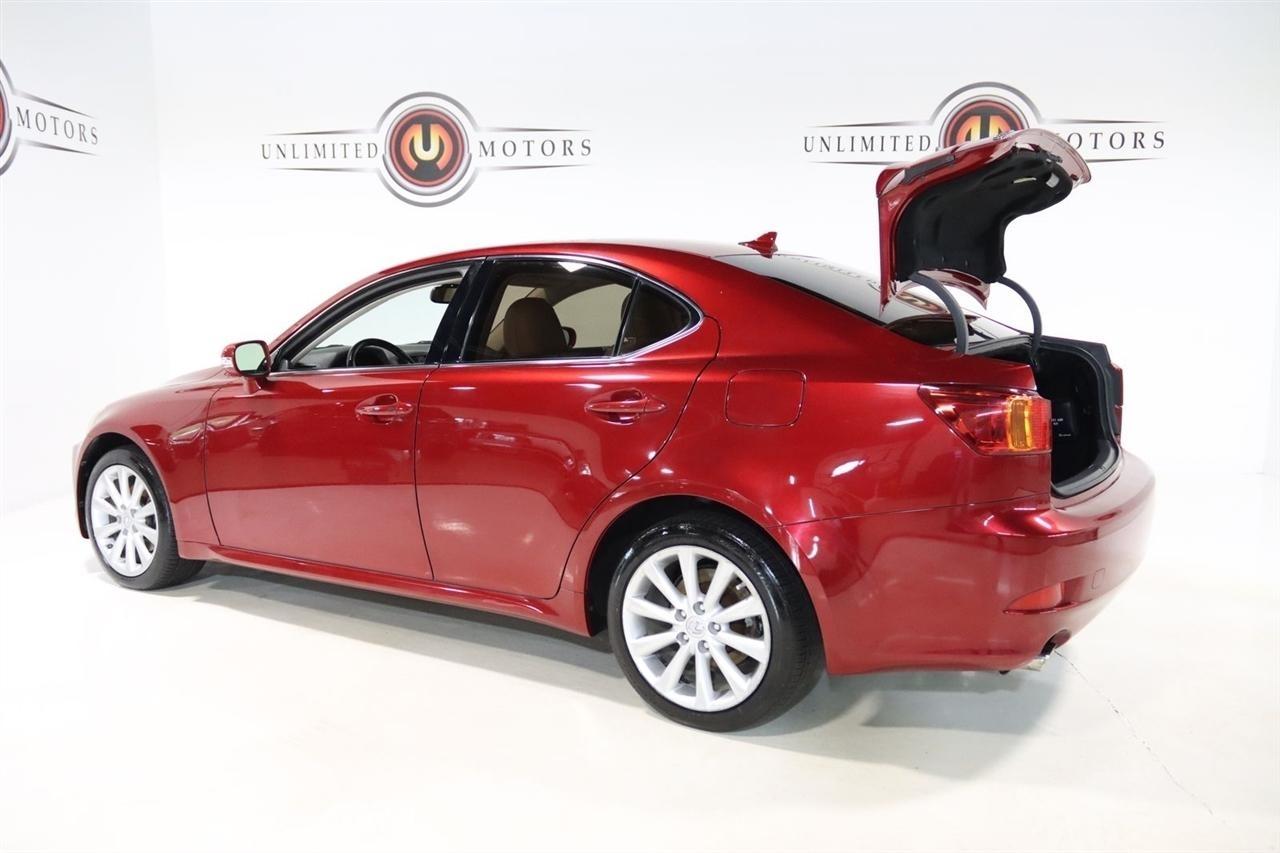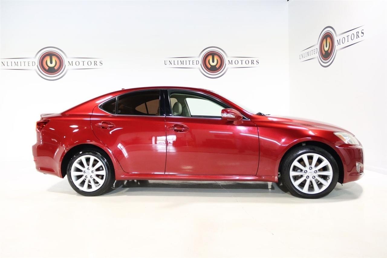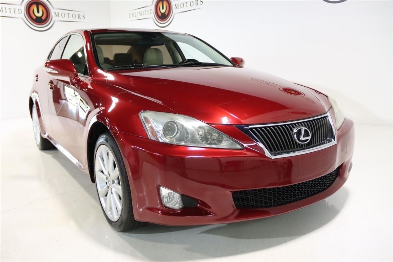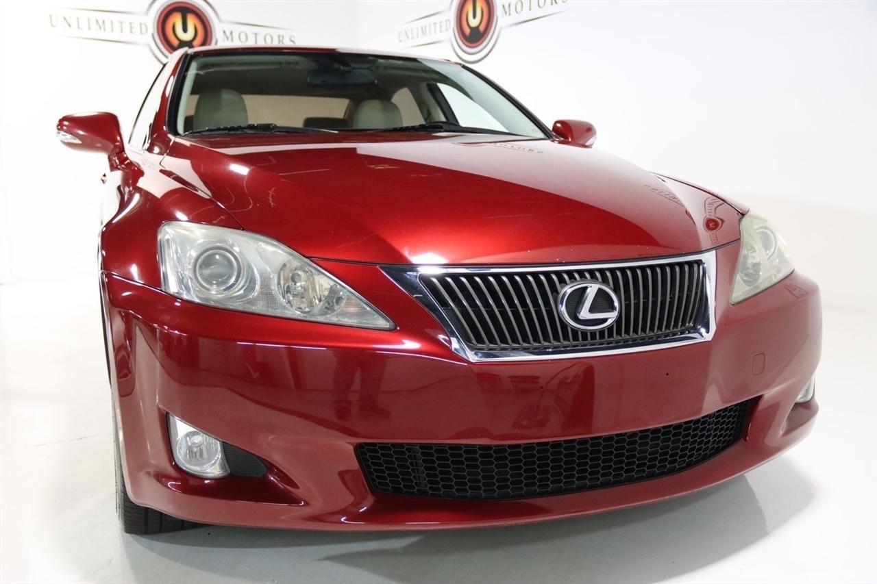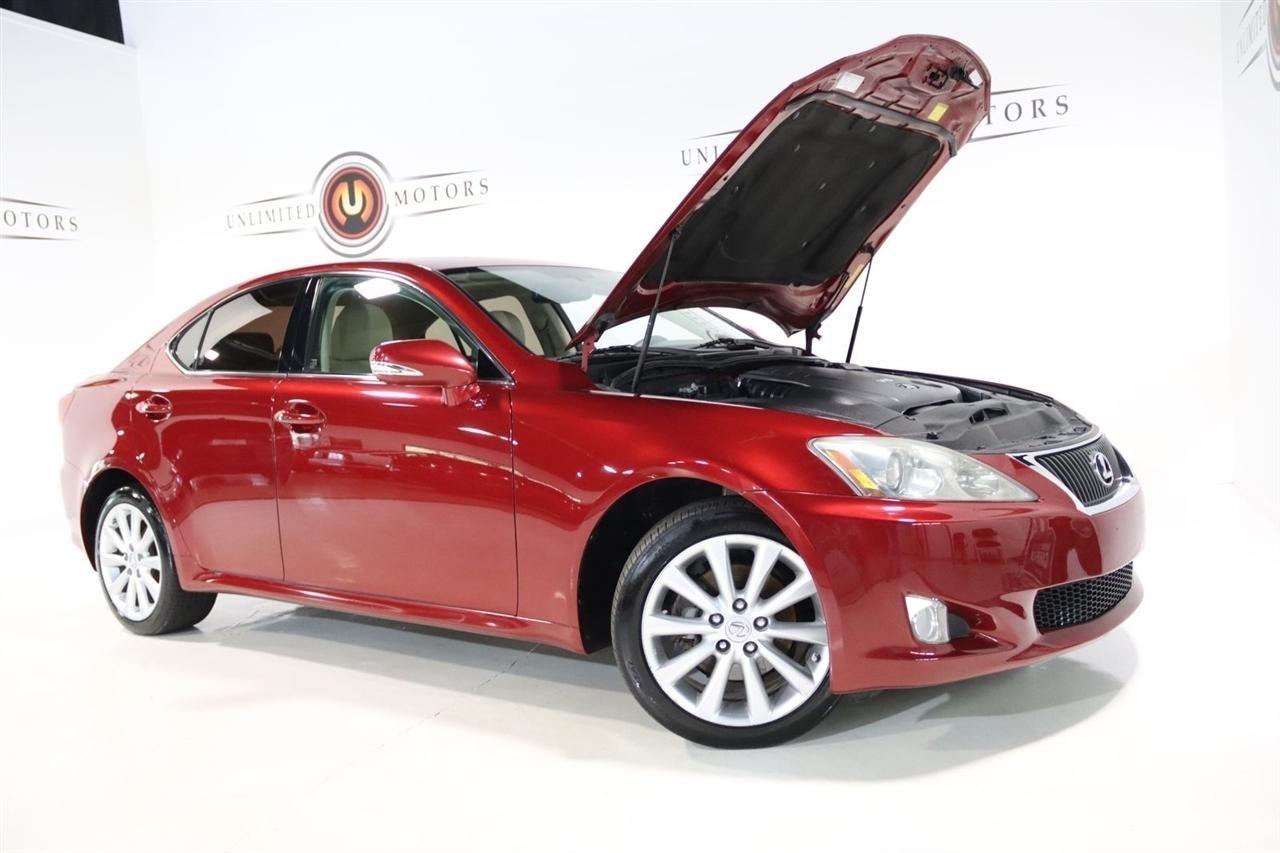 Bluetooth, Back Up Camera, Sun/Moon Roof, Touch Screen, 13 Speakers, 17 x 8 10-Spoke Aluminum Alloy Wheels, 4-Wheel Disc Brakes, ABS brakes, Air Conditioning, Alloy wheels, AM/FM radio, Auto-dimming Rear-View mirror, Automatic temperature control, Bird's Eye Maple Interior Trim, Brake assist, Bumpers: body-color, Cargo Net, CD player, Compass, Delay-off headlights, Driver door bin, Driver vanity mirror, Dual front impact airbags, Dual front side impact airbags, Electronic Stability Control, Four wheel independent suspension, Front anti-roll bar, Front Bucket Seats, Front Center Armrest, Front dual zone A/C, Front fog lights, Front reading lights, Fully automatic headlights, Garage door transmitter: HomeLink(R), Heated door mirrors, Heated Front Bucket Seats, Heated front seats, Illuminated entry, Knee airbag, Leather Seat Trim, Leather steering wheel, Lexus Premium Audio System, Low tire pressure warning, Mark Levinson Premium Audio Package, Navigation System, Navigation System w/Mark Levinson Premium Audio Package, Occupant sensing airbag, Outside temperature display, Overhead airbag, Overhead console, Panic alarm, Passenger door bin, Passenger vanity mirror, Perforated Leather Seat Trim, Power door mirrors, Power driver seat, Power moonroof, Power passenger seat, Power steering, Power windows, Preferred Accessory Package, Preferred Accessory Package w/Z1, Premium Package, Radio data system, Rear anti-roll bar, Rear Bumper Applique, Rear reading lights, Rear seat center armrest, Rear window defroster, Remote keyless entry, Security system, Speed control, Speed-sensing steering, Speed-Sensitive Wipers, Steering wheel mounted audio controls, Tachometer, Telescoping steering wheel, Tilt steering wheel, Traction control, Trip computer, Trunk Mat, Turn signal indicator mirrors, Variably intermittent wipers, Wheel Locks. 20/26 City/Highway MPG Odometer is 5110 miles below market average!2009 Matador Red Mica Lexus 4D Sedan IS 250 AWD 6-Speed Automatic Electronic with ECT-i 2.5L V6 DOHC 24V VVT-iVisit our website www.iumotors.com to view 100s of newer vehicles, more pictures and info, or to apply for financing. Rates are incredibly low for approved credit. We offer extended warranties, protection packages, and insurance. We assure you the best experience at any of our 4 locations and unbeatable prices and quality. At Unlimited Motors we believe in MARKET VALUE PRICING. We use real-time Internet price comparisons to constantly adjust prices to provide ALL BUYERS The BEST PRICE possible. We do not mark them up, to mark them down! Our entire team is committed to helping you buy a car the way we would want to buy a car! We utilize state-of-the-art technology to constantly monitor pricing trends to offer our shoppers the best competitive pricing, value, and experience. We sell and service all makes and models of Pre-owned / Used Vehicles Used Cars, Used Trucks, Used Sport Utility, Lamborghini, Ferrari, Bentley, Rolls Royce, McLaren, Maserati, Ford, Chevrolet/Chevy, Honda, Toyota, Porsche, Land Rover, Jaguar, INFINITI, Audi, Nissan, Mazda, Hyundai, Chrysler, Jeep, Dodge, Ram, SRT, Mitsubishi, Lexus, Kia, Volkswagen, Mini, BMW, Mercedes, Fiat, Volvo, GMC, Cadillac, Lincoln as well as other brands. Proudly serving these areas of Indianapolis, Fishers, Carmel, Noblesville, Greenwood, Avon, Plainfield, Zionsville, & Brownsburg, Indiana, Midwest. We also serve the entire nation with our seamless and easy online purchasing process, and offer shipping nationwide.Advertised prices DO NOT include Sales Tax, Dealer Fees, Title Processing Charges, and Dealer Pre-installed Products.