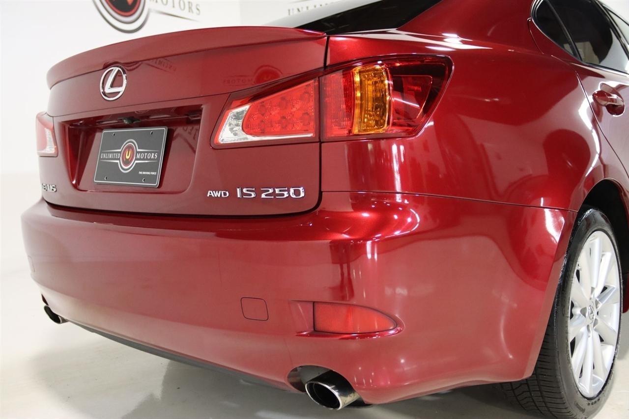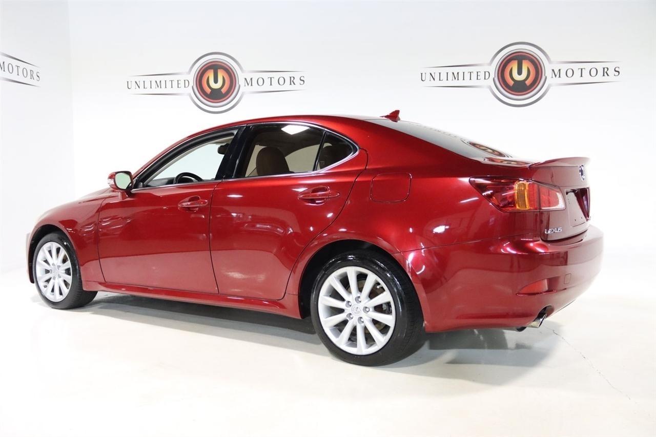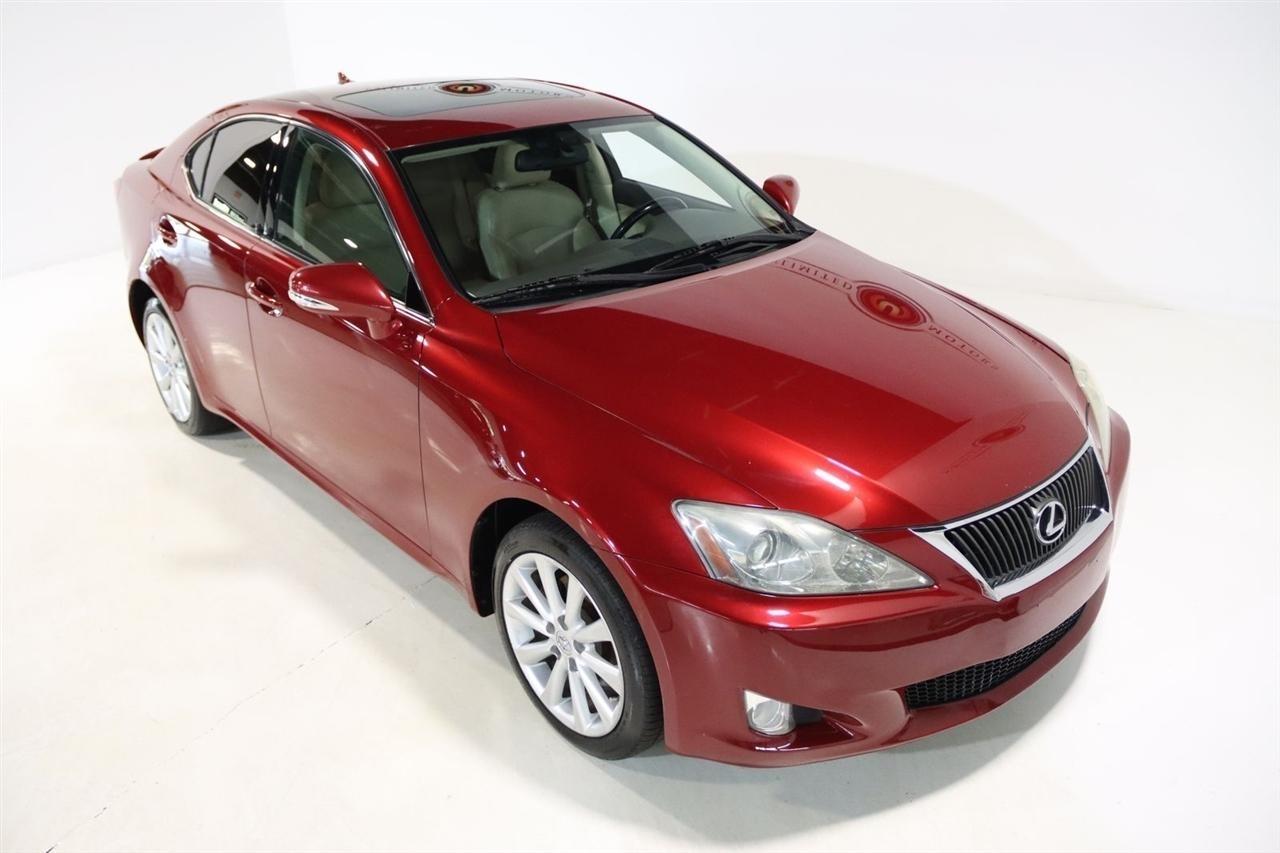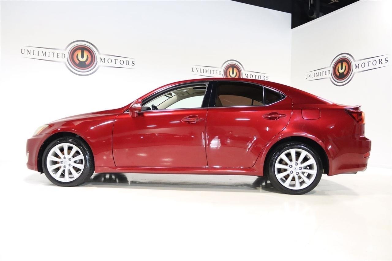 Bluetooth, Back Up Camera, Sun/Moon Roof, Touch Screen, 13 Speakers, 17 x 8 10-Spoke Aluminum Alloy Wheels, 4-Wheel Disc Brakes, ABS brakes, Air Conditioning, Alloy wheels, AM/FM radio, Auto-dimming Rear-View mirror, Automatic temperature control, Bird's Eye Maple Interior Trim, Brake assist, Bumpers: body-color, Cargo Net, CD player, Compass, Delay-off headlights, Driver door bin, Driver vanity mirror, Dual front impact airbags, Dual front side impact airbags, Electronic Stability Control, Four wheel independent suspension, Front anti-roll bar, Front Bucket Seats, Front Center Armrest, Front dual zone A/C, Front fog lights, Front reading lights, Fully automatic headlights, Garage door transmitter: HomeLink(R), Heated door mirrors, Heated Front Bucket Seats, Heated front seats, Illuminated entry, Knee airbag, Leather Seat Trim, Leather steering wheel, Lexus Premium Audio System, Low tire pressure warning, Mark Levinson Premium Audio Package, Navigation System, Navigation System w/Mark Levinson Premium Audio Package, Occupant sensing airbag, Outside temperature display, Overhead airbag, Overhead console, Panic alarm, Passenger door bin, Passenger vanity mirror, Perforated Leather Seat Trim, Power door mirrors, Power driver seat, Power moonroof, Power passenger seat, Power steering, Power windows, Preferred Accessory Package, Preferred Accessory Package w/Z1, Premium Package, Radio data system, Rear anti-roll bar, Rear Bumper Applique, Rear reading lights, Rear seat center armrest, Rear window defroster, Remote keyless entry, Security system, Speed control, Speed-sensing steering, Speed-Sensitive Wipers, Steering wheel mounted audio controls, Tachometer, Telescoping steering wheel, Tilt steering wheel, Traction control, Trip computer, Trunk Mat, Turn signal indicator mirrors, Variably intermittent wipers, Wheel Locks. 20/26 City/Highway MPG Odometer is 5110 miles below market average!2009 Matador Red Mica Lexus 4D Sedan IS 250 AWD 6-Speed Automatic Electronic with ECT-i 2.5L V6 DOHC 24V VVT-iVisit our website www.iumotors.com to view 100s of newer vehicles, more pictures and info, or to apply for financing. Rates are incredibly low for approved credit. We offer extended warranties, protection packages, and insurance. We assure you the best experience at any of our 4 locations and unbeatable prices and quality. At Unlimited Motors we believe in MARKET VALUE PRICING. We use real-time Internet price comparisons to constantly adjust prices to provide ALL BUYERS The BEST PRICE possible. We do not mark them up, to mark them down! Our entire team is committed to helping you buy a car the way we would want to buy a car! We utilize state-of-the-art technology to constantly monitor pricing trends to offer our shoppers the best competitive pricing, value, and experience. We sell and service all makes and models of Pre-owned / Used Vehicles Used Cars, Used Trucks, Used Sport Utility, Lamborghini, Ferrari, Bentley, Rolls Royce, McLaren, Maserati, Ford, Chevrolet/Chevy, Honda, Toyota, Porsche, Land Rover, Jaguar, INFINITI, Audi, Nissan, Mazda, Hyundai, Chrysler, Jeep, Dodge, Ram, SRT, Mitsubishi, Lexus, Kia, Volkswagen, Mini, BMW, Mercedes, Fiat, Volvo, GMC, Cadillac, Lincoln as well as other brands. Proudly serving these areas of Indianapolis, Fishers, Carmel, Noblesville, Greenwood, Avon, Plainfield, Zionsville, & Brownsburg, Indiana, Midwest. We also serve the entire nation with our seamless and easy online purchasing process, and offer shipping nationwide.Advertised prices DO NOT include Sales Tax, Dealer Fees, Title Processing Charges, and Dealer Pre-installed Products.
