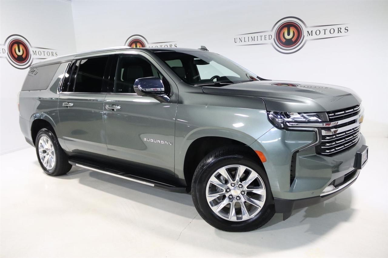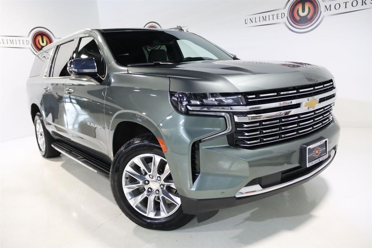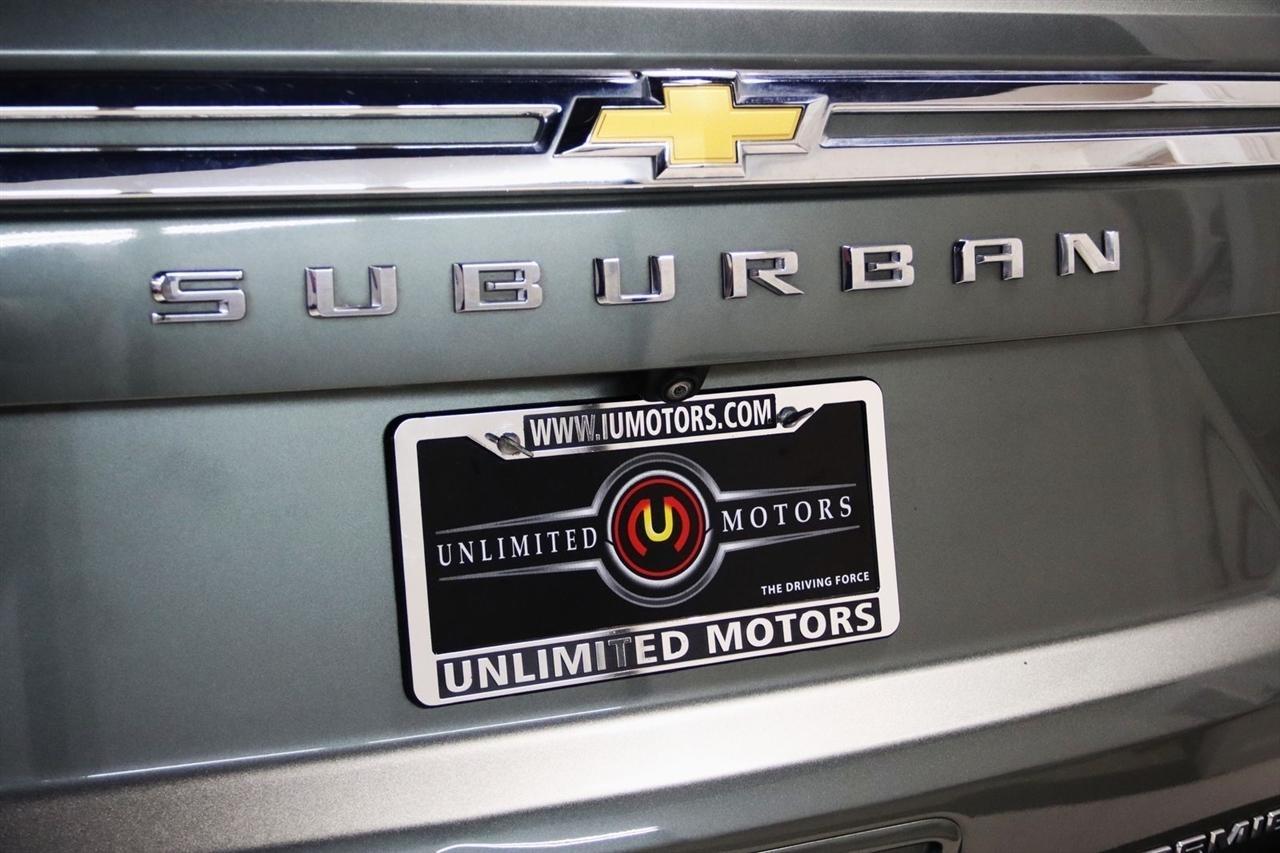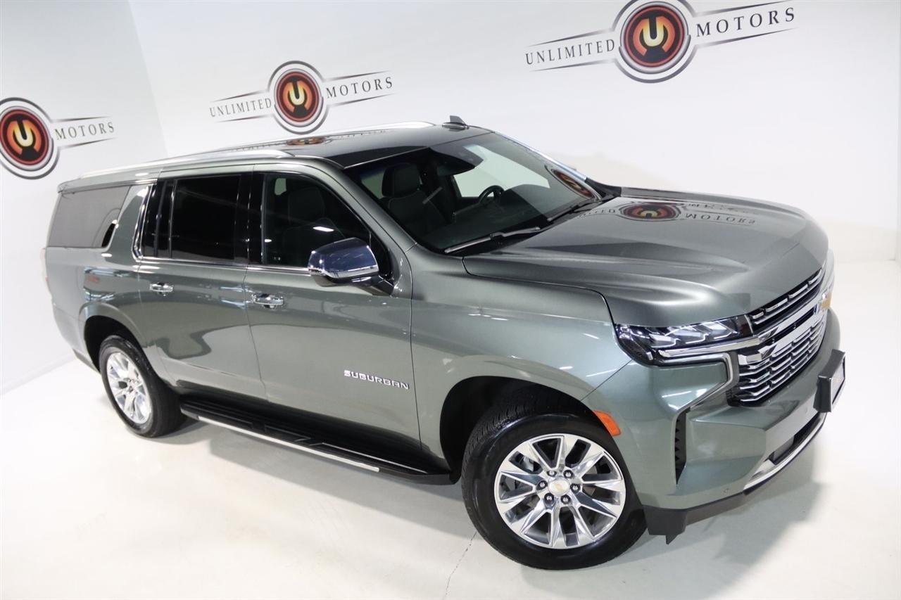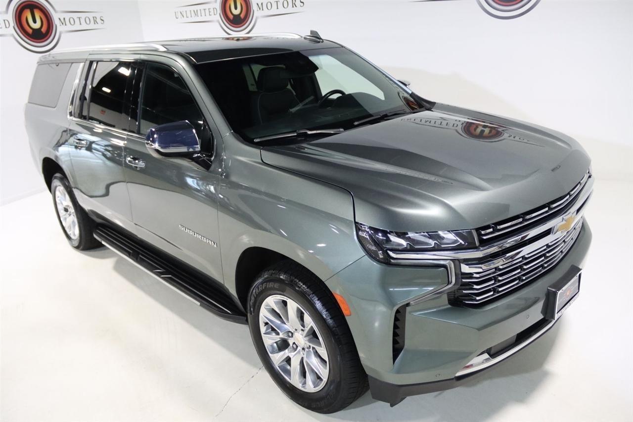 Navigation, Bluetooth, Back Up Camera, 3rd Row, Heated Seats, Touch Screen, 10 Speakers, 1st & 2nd Row Color-Keyed Carpeted Floor Mats, 2-Speed Active Electronic AutoTrac Transfer Case, 20 x 9 Polished Aluminum Wheels, 3.23 Rear Axle Ratio, 3rd Row 60/40 Power-Folding Split-Bench, 3rd row seats: split-bench, 4-Wheel Disc Brakes, ABS brakes, Adaptive suspension, Air Conditioning, Alloy wheels, AM/FM radio: SiriusXM with 360L, Apple CarPlay/Android Auto, Auto High-beam Headlights, Auto-dimming door mirrors, Auto-Dimming Inside Rear-View Mirror, Auto-dimming Rear-View mirror, Auto-leveling suspension, Automatic temperature control, Bose 10-Speaker Surround w/CenterPoint, Brake assist, Bright Front & Rear Door Sill Plates, Bumpers: body-color, Chrome Door Handles w/Body-Color Strip, Chrome Mirror Caps, Color-Keyed Carpeting Floor Covering, Compass, Delay-off headlights, Deleted 3 Years of Remote Access, Driver & Front Outboard Passenger Airbags, Driver door bin, Driver vanity mirror, Dual Exhaust System, Dual front impact airbags, Dual front side impact airbags, Electronic Stability Control, Emergency communication system: OnStar and Chevrolet connected services capable, Enhanced Driver Information Center, Floor Console, Four wheel independent suspension, Front anti-roll bar, Front Bucket Seats, Front Center Armrest, Front dual zone A/C, Front reading lights, Fully automatic headlights, Garage door transmitter, Hands-Free Rear Power Programmable Liftgate, Heated & Ventilated Driver & Front Passenger Seats, Heated 2nd Row Outboard Seats, Heated door mirrors, Heated Driver & Front Passenger Seats, Heated front seats, Heated rear seats, Heated Steering Wheel, Heated steering wheel, Hill Descent Control, Illuminated entry, Infotainment Display, Lane Change Alert w/Side Blind Zone Alert, LED Daytime Running Lamps, License Plate Front Mounting Package, Low tire pressure warning, Magnetic Ride Control Suspension, Memory seat, Memory Settings, Navigation System, Occupant sensing airbag, Outside Heated Power-Adjustable Mirrors, Outside temperature display, Overhead airbag, Overhead console, Panic alarm, Passenger door bin, Passenger vanity mirror, Perforated Leather Seating Surfaces, Power door mirrors, Power driver seat, Power Liftgate, Power passenger seat, Power Release 2nd Row Bucket Seats, Power steering, Power Tilt & Telescopic Steering Column, Power windows, Preferred Equipment Group 1LZ, Premium audio system: Chevrolet Infotainment 3 Premium, Radio: Chevrolet Infotainment 3 Premium System, Rain sensing wipers, Rear air conditioning, Rear anti-roll bar, Rear Cross Traffic Alert, Rear reading lights, Rear window defroster, Rear window wiper, Remote keyless entry, Remote Start, Roof rack: rails only, Safety Alert Seat, Security system, SiriusXM Radio w/360L, Speed control, Speed-sensing steering, Split folding rear seat, Spoiler, Steering wheel memory, Steering wheel mounted audio controls, Tachometer, Telescoping steering wheel, Tilt steering wheel, Traction control, Trip computer, Turn signal indicator mirrors, Universal Home Remote, Variably intermittent wipers, Ventilated front seats, Voltmeter, Wireless Charging, Wrapped Steering Wheel. CARFAX One-Owner. Clean CARFAX.2023 Silver Sage Metallic Chevrolet 4D Sport Utility Suburban Premier 4WD 10-Speed Automatic with Overdrive EcoTec3 5.3L V8Visit our website www.iumotors.com to view 100s of newer vehicles, more pictures and info, or to apply for financing. Rates are incredibly low for approved credit. We offer extended warranties, protection packages, and insurance. We assure you the best experience at any of our 4 locations and unbeatable prices and quality. At Unlimited Motors we believe in MARKET VALUE PRICING. We use real-time Internet price comparisons to constantly adjust prices to provide ALL BUYERS The BEST PRICE possible. We do not mark them up, to mark them down! Our entire team is committed to helping you buy a car the way we would want to buy