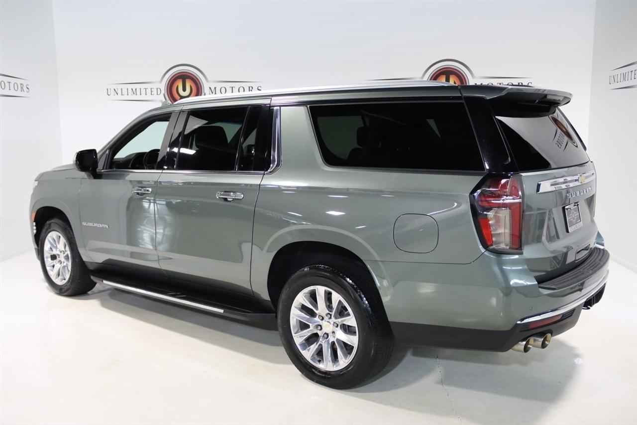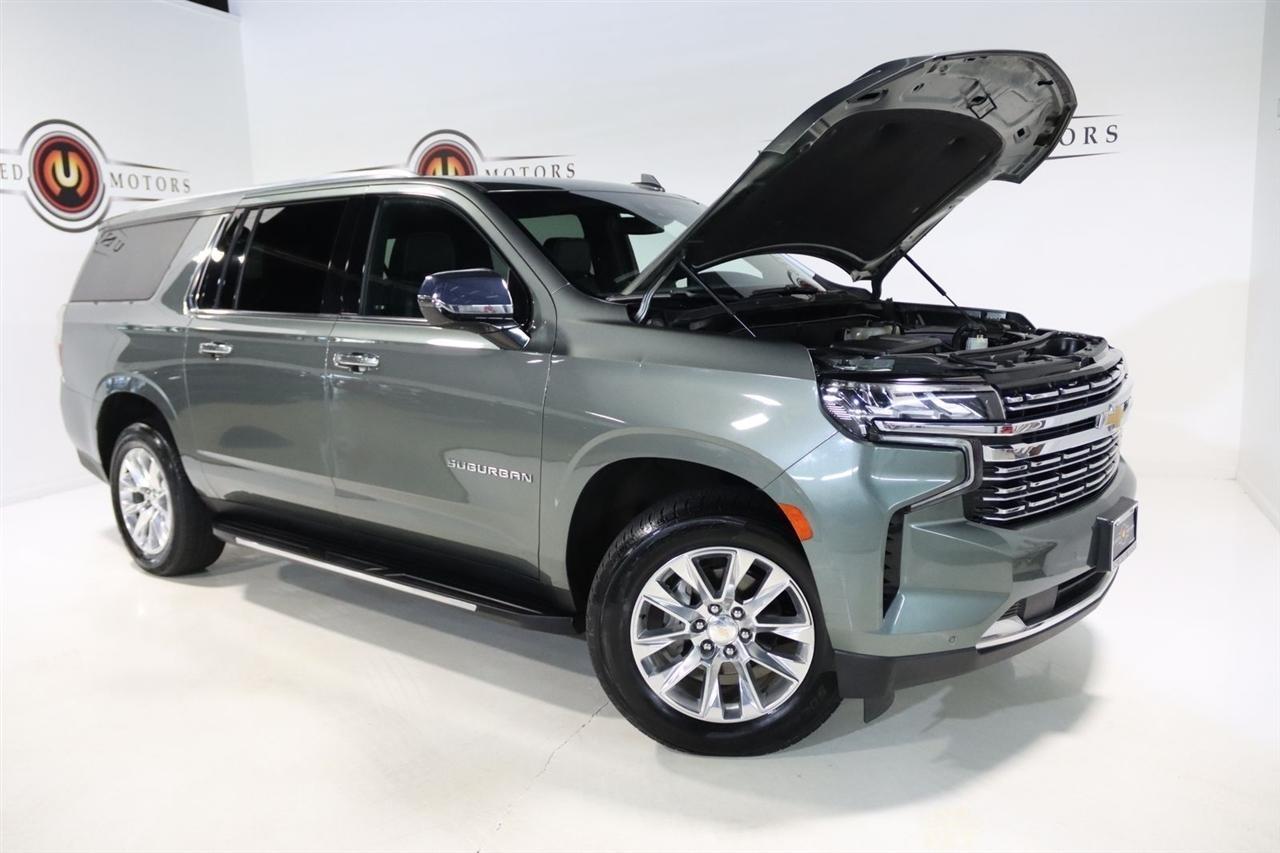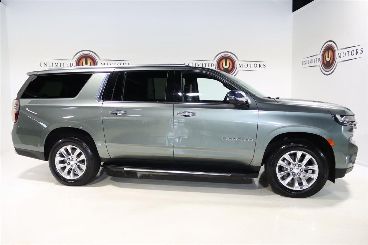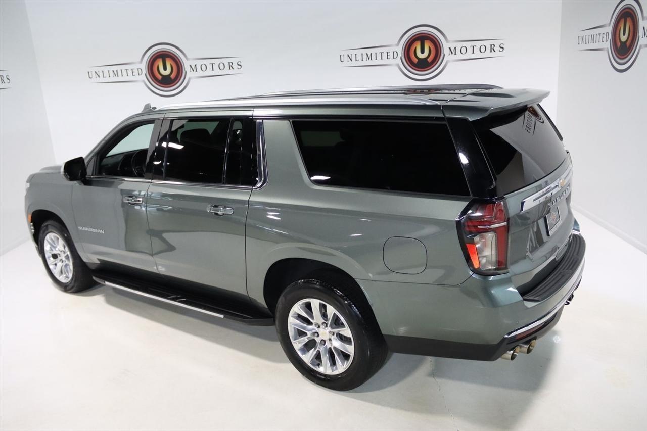 Navigation, Bluetooth, Back Up Camera, 3rd Row, Heated Seats, Touch Screen, 10 Speakers, 1st & 2nd Row Color-Keyed Carpeted Floor Mats, 2-Speed Active Electronic AutoTrac Transfer Case, 20 x 9 Polished Aluminum Wheels, 3.23 Rear Axle Ratio, 3rd Row 60/40 Power-Folding Split-Bench, 3rd row seats: split-bench, 4-Wheel Disc Brakes, ABS brakes, Adaptive suspension, Air Conditioning, Alloy wheels, AM/FM radio: SiriusXM with 360L, Apple CarPlay/Android Auto, Auto High-beam Headlights, Auto-dimming door mirrors, Auto-Dimming Inside Rear-View Mirror, Auto-dimming Rear-View mirror, Auto-leveling suspension, Automatic temperature control, Bose 10-Speaker Surround w/CenterPoint, Brake assist, Bright Front & Rear Door Sill Plates, Bumpers: body-color, Chrome Door Handles w/Body-Color Strip, Chrome Mirror Caps, Color-Keyed Carpeting Floor Covering, Compass, Delay-off headlights, Deleted 3 Years of Remote Access, Driver & Front Outboard Passenger Airbags, Driver door bin, Driver vanity mirror, Dual Exhaust System, Dual front impact airbags, Dual front side impact airbags, Electronic Stability Control, Emergency communication system: OnStar and Chevrolet connected services capable, Enhanced Driver Information Center, Floor Console, Four wheel independent suspension, Front anti-roll bar, Front Bucket Seats, Front Center Armrest, Front dual zone A/C, Front reading lights, Fully automatic headlights, Garage door transmitter, Hands-Free Rear Power Programmable Liftgate, Heated & Ventilated Driver & Front Passenger Seats, Heated 2nd Row Outboard Seats, Heated door mirrors, Heated Driver & Front Passenger Seats, Heated front seats, Heated rear seats, Heated Steering Wheel, Heated steering wheel, Hill Descent Control, Illuminated entry, Infotainment Display, Lane Change Alert w/Side Blind Zone Alert, LED Daytime Running Lamps, License Plate Front Mounting Package, Low tire pressure warning, Magnetic Ride Control Suspension, Memory seat, Memory Settings, Navigation System, Occupant sensing airbag, Outside Heated Power-Adjustable Mirrors, Outside temperature display, Overhead airbag, Overhead console, Panic alarm, Passenger door bin, Passenger vanity mirror, Perforated Leather Seating Surfaces, Power door mirrors, Power driver seat, Power Liftgate, Power passenger seat, Power Release 2nd Row Bucket Seats, Power steering, Power Tilt & Telescopic Steering Column, Power windows, Preferred Equipment Group 1LZ, Premium audio system: Chevrolet Infotainment 3 Premium, Radio: Chevrolet Infotainment 3 Premium System, Rain sensing wipers, Rear air conditioning, Rear anti-roll bar, Rear Cross Traffic Alert, Rear reading lights, Rear window defroster, Rear window wiper, Remote keyless entry, Remote Start, Roof rack: rails only, Safety Alert Seat, Security system, SiriusXM Radio w/360L, Speed control, Speed-sensing steering, Split folding rear seat, Spoiler, Steering wheel memory, Steering wheel mounted audio controls, Tachometer, Telescoping steering wheel, Tilt steering wheel, Traction control, Trip computer, Turn signal indicator mirrors, Universal Home Remote, Variably intermittent wipers, Ventilated front seats, Voltmeter, Wireless Charging, Wrapped Steering Wheel. CARFAX One-Owner. Clean CARFAX.2023 Silver Sage Metallic Chevrolet 4D Sport Utility Suburban Premier 4WD 10-Speed Automatic with Overdrive EcoTec3 5.3L V8Visit our website www.iumotors.com to view 100s of newer vehicles, more pictures and info, or to apply for financing. Rates are incredibly low for approved credit. We offer extended warranties, protection packages, and insurance. We assure you the best experience at any of our 4 locations and unbeatable prices and quality. At Unlimited Motors we believe in MARKET VALUE PRICING. We use real-time Internet price comparisons to constantly adjust prices to provide ALL BUYERS The BEST PRICE possible. We do not mark them up, to mark them down! Our entire team is committed to helping you buy a car the way we would want to buy