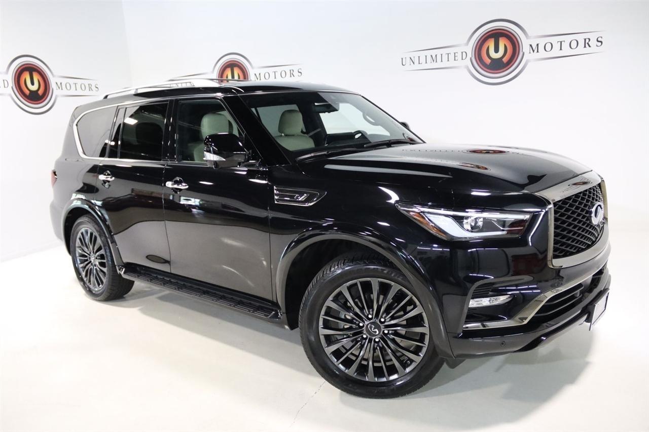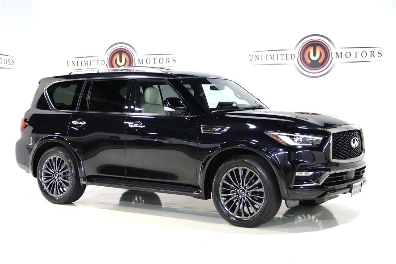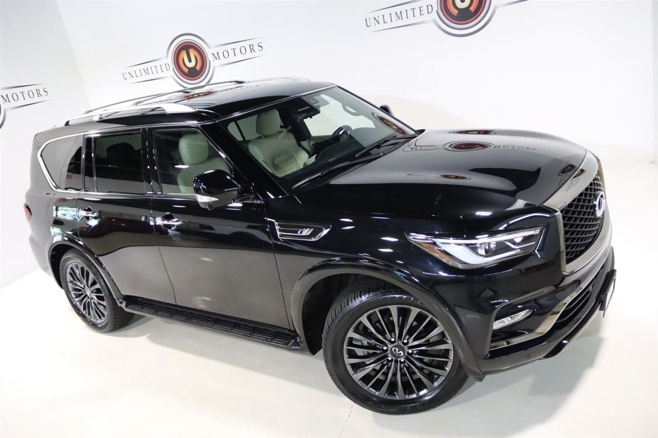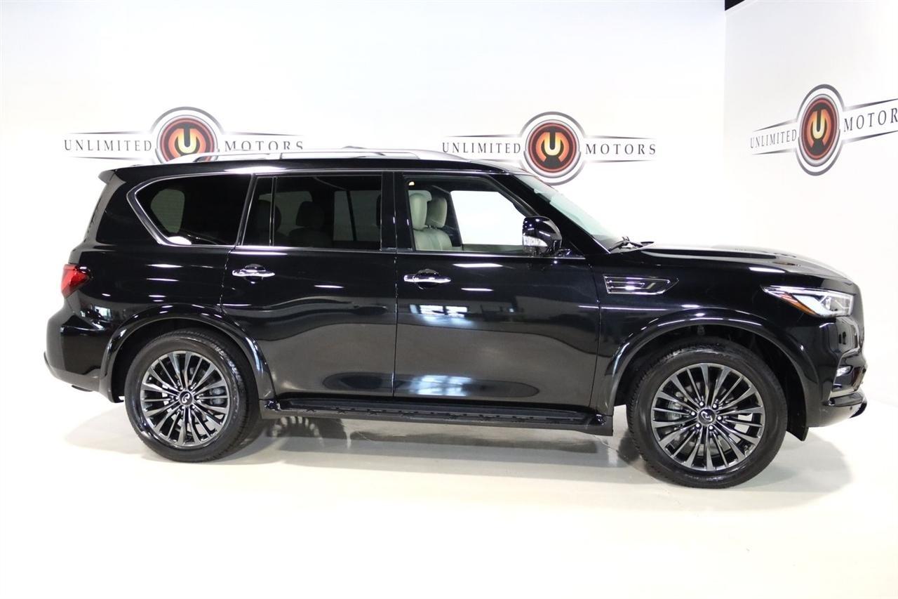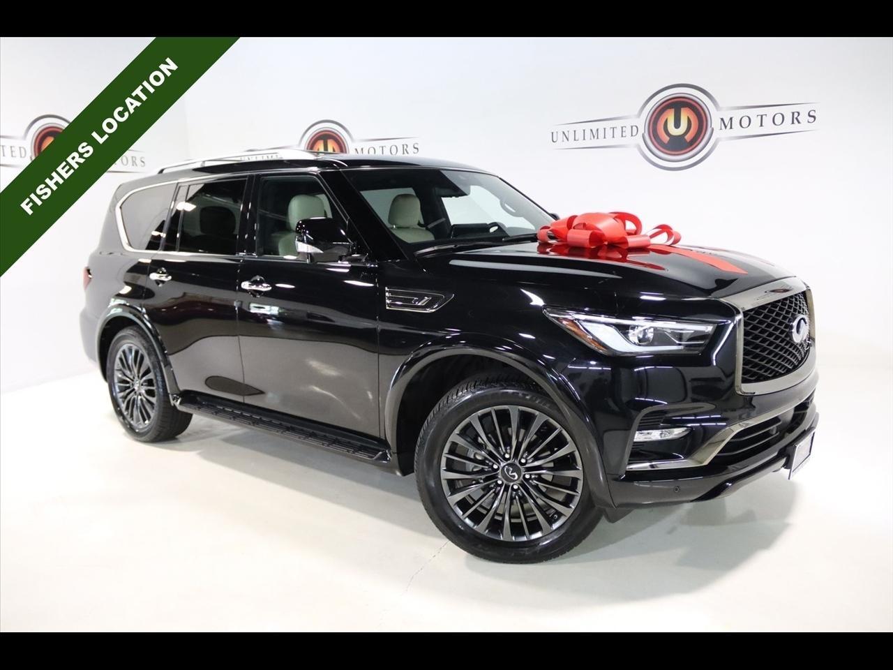 Navigation, Bluetooth, Back Up Camera, Sun/Moon Roof, 3rd Row, Heated Seats, Touch Screen, 17 Speakers, 2.937 Axle Ratio, 3rd row seats: bench, 4-Wheel Disc Brakes, ABS brakes, Air Conditioning, Alloy wheels, AM/FM radio: SiriusXM, Anti-whiplash front head restraints, Apple CarPlay/Android Auto, Auto High-beam Headlights, Auto tilt-away steering wheel, Auto-dimming door mirrors, Auto-dimming Rear-View mirror, Auto-leveling suspension, Automatic temperature control, Black Painted Mirror Caps, Brake assist, Bumpers: body-color, Cargo Package, Climate Controlled Front Bucket Seats, Compass, Console Net, Dark Chrome Front Fascia Trim, Dark Chrome Grille Surround, Delay-off headlights, Driver door bin, Driver vanity mirror, Dual front impact airbags, Dual front side impact airbags, Electronic Stability Control, Emergency communication system: INFINITI InTouch, First-Aid Kit, Four wheel independent suspension, Front anti-roll bar, Front Bucket Seats, Front Center Armrest, Front dual zone A/C, Front fog lights, Front reading lights, Fully automatic headlights, Garage door transmitter: HomeLink, Heated door mirrors, Heated front seats, Heated rear seats, Heated steering wheel, Illuminated entry, Leather Shift Knob, Leather steering wheel, Literature Kit, Low tire pressure warning, Memory seat, Moisture-Resistant Rear Cargo Carpet, Navigation System, Navigation system: INFINITI InTouch Navigation, Nylon-Cord Cargo Net, Occupant sensing airbag, Outside temperature display, Overhead airbag, Overhead console, Panic alarm, Passenger door bin, Passenger vanity mirror, Perforated Semi-Aniline Leather-Appointed Seats, Power door mirrors, Power driver seat, Power Liftgate, Power moonroof, Power passenger seat, Power steering, Power windows, Radio data system, Radio: Bose Performance Audio System w/17 Speakers, Rain sensing wipers, Rear air conditioning, Rear anti-roll bar, Rear reading lights, Rear seat center armrest, Rear window defroster, Rear window wiper, Reclining 3rd row seat, Remote keyless entry, Roof Rail Cross Bars, Security system, Sensory Dark Chrome Appearance Package, Speed control, Speed-sensing steering, Split folding rear seat, Spoiler, Steering wheel memory, Steering wheel mounted audio controls, Tachometer, Telescoping steering wheel, Tilt steering wheel, Traction control, Trip computer, Turn signal indicator mirrors, Variably intermittent wipers, Ventilated front seats, Voltmeter, Wheels: 22 Dark Chrome Cast Aluminum-Alloy. CARFAX One-Owner. Clean CARFAX. Priced below KBB Fair Purchase Price!2024 Mineral Black INFINITI 4D Sport Utility QX80 Sensory 4WD 7-Speed Automatic 5.6L V8Visit our website www.iumotors.com to view 100s of newer vehicles, more pictures and info, or to apply for financing. Rates are incredibly low for approved credit. We offer extended warranties, protection packages, and insurance. We assure you the best experience at any of our 4 locations and unbeatable prices and quality. At Unlimited Motors we believe in MARKET VALUE PRICING. We use real-time Internet price comparisons to constantly adjust prices to provide ALL BUYERS The BEST PRICE possible. We do not mark them up, to mark them down! Our entire team is committed to helping you buy a car the way we would want to buy a car! We utilize state-of-the-art technology to constantly monitor pricing trends to offer our shoppers the best competitive pricing, value, and experience. We sell and service all makes and models of Pre-owned / Used Vehicles Used Cars, Used Trucks, Used Sport Utility, Lamborghini, Ferrari, Bentley, Rolls Royce, McLaren, Maserati, Ford, Chevrolet/Chevy, Honda, Toyota, Porsche, Land Rover, Jaguar, INFINITI, Audi, Nissan, Mazda, Hyundai, Chrysler, Jeep, Dodge, Ram, SRT, Mitsubishi, Lexus, Kia, Volkswagen, Mini, BMW, Mercedes, Fiat, Volvo, GMC, Cadillac, Lincoln as well as other brands. Proudly serving these areas of Indianapolis, Fishers, Carmel, Noblesville, Greenwood, Avon, Plainfield, Zionsville, & Brownsb